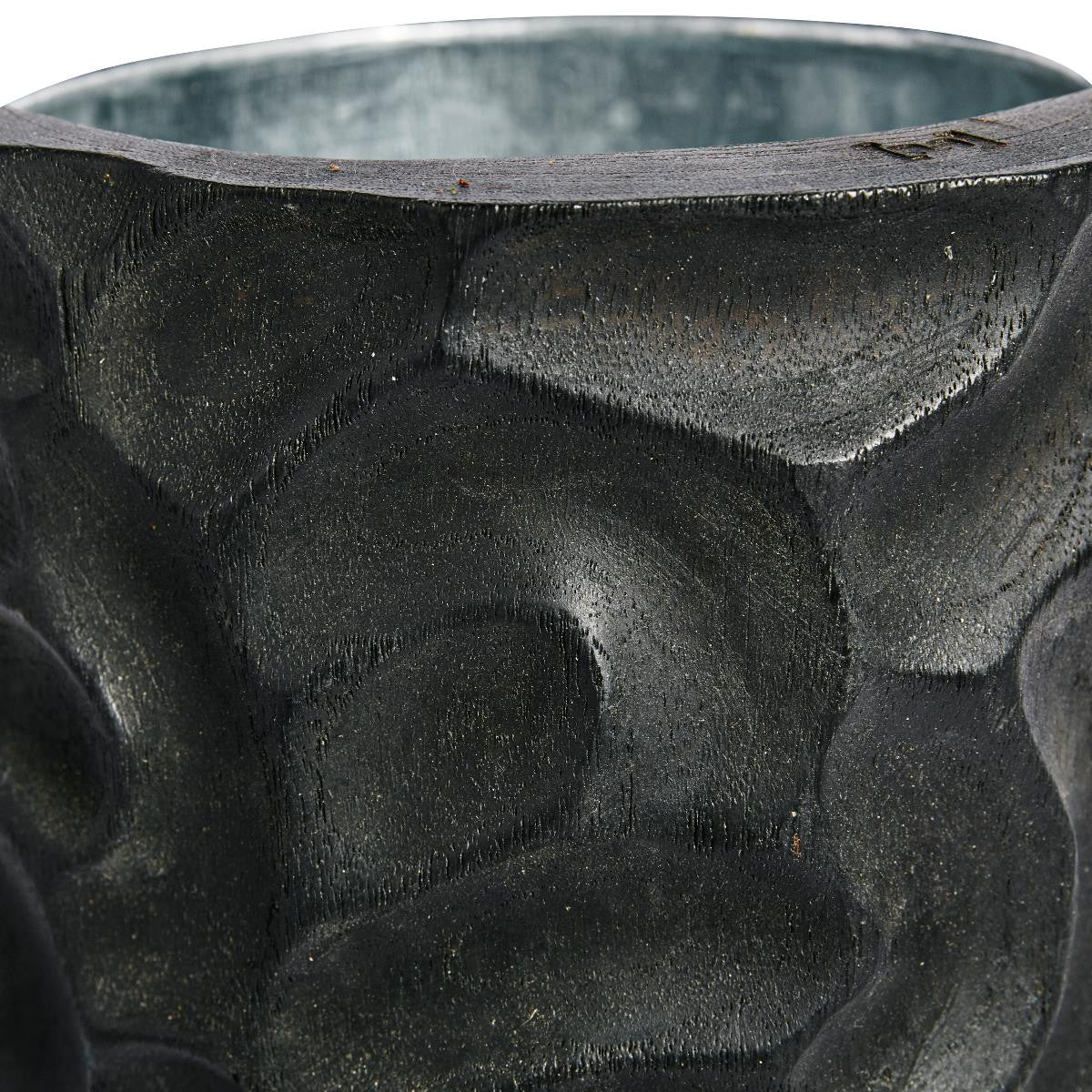 Dekorative Vase aus schwarz gebranntem Teakholz. Die eingearbeitete Wellenstruktur ist handgefertigt und verleiht der Vase ihren exklusiven Look. Durch den ins Holz eingearbeiteten Zinkeinsatz ist die Vase wasserbeständig.