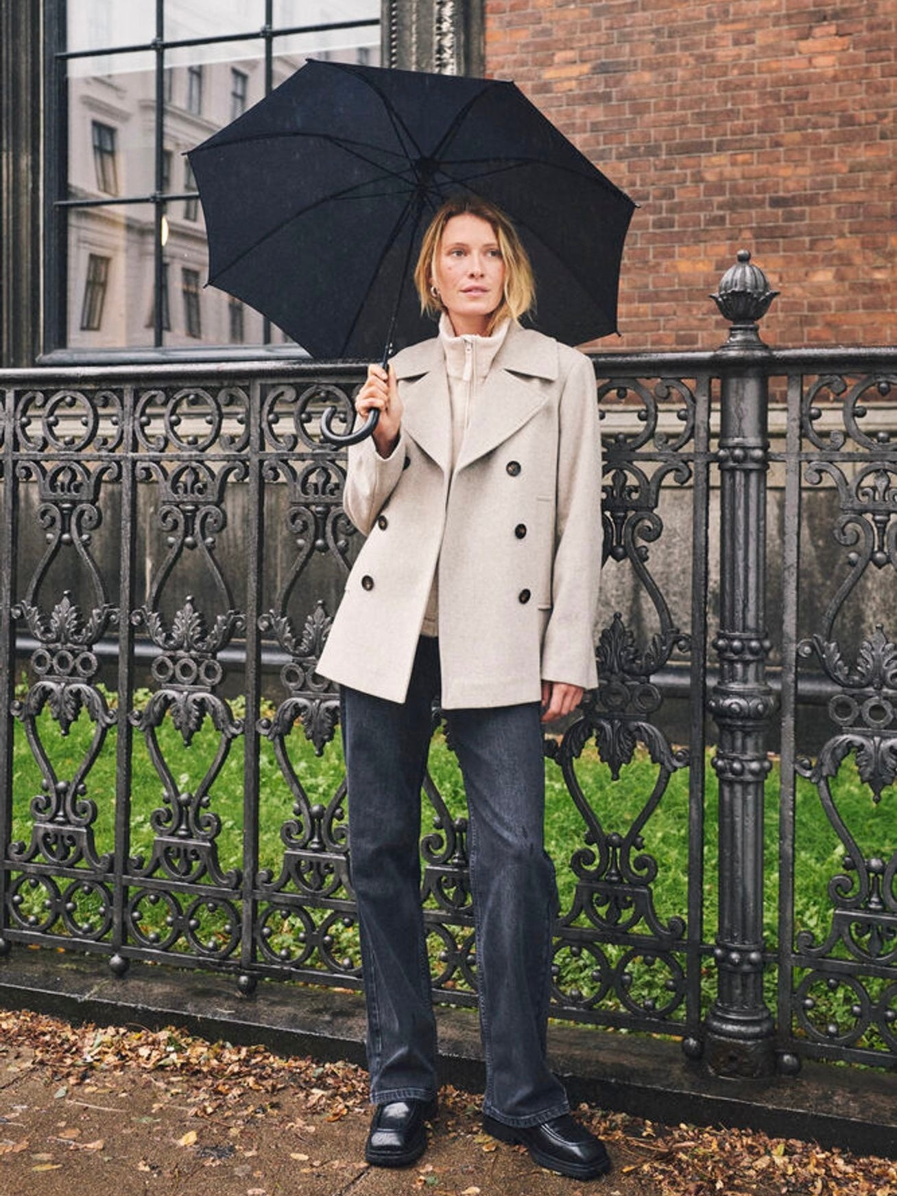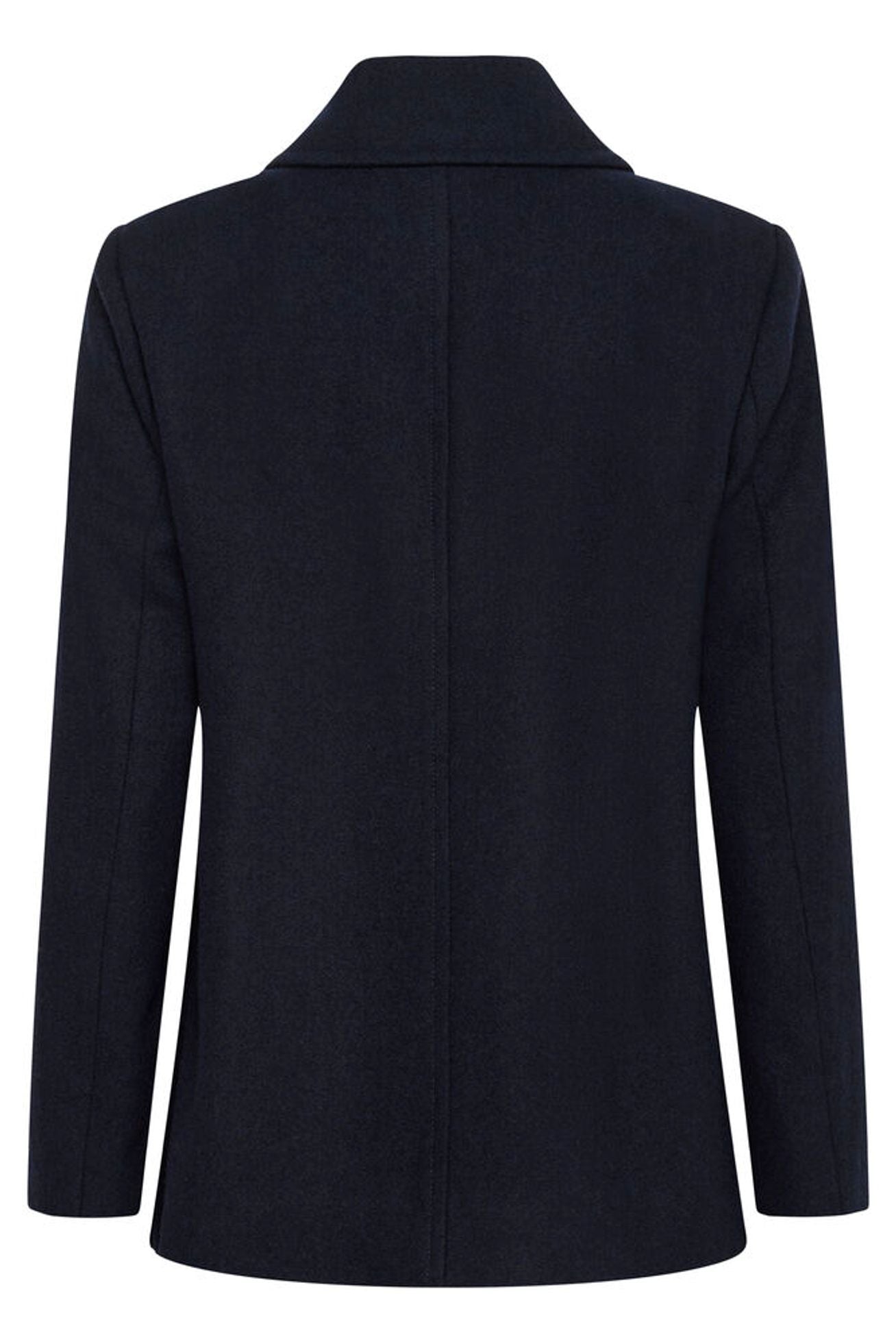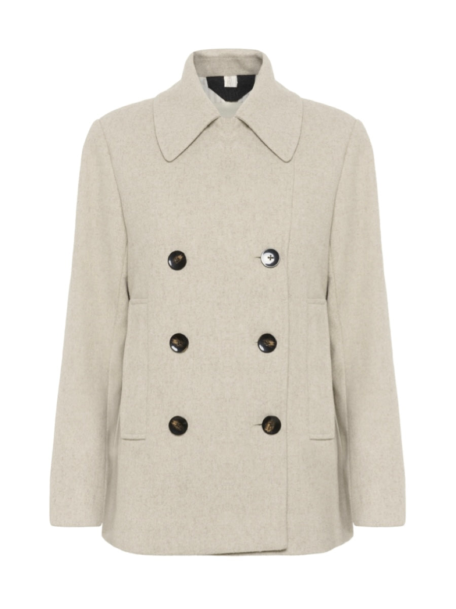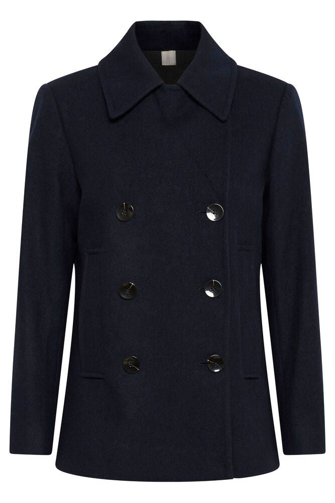 Edel sportive Cabanjacke mit farblich abgesetzten Knöpfen. Breiter Reverskragen, seitliche Eingrifftaschen. Mit Futter gearbeitet.
