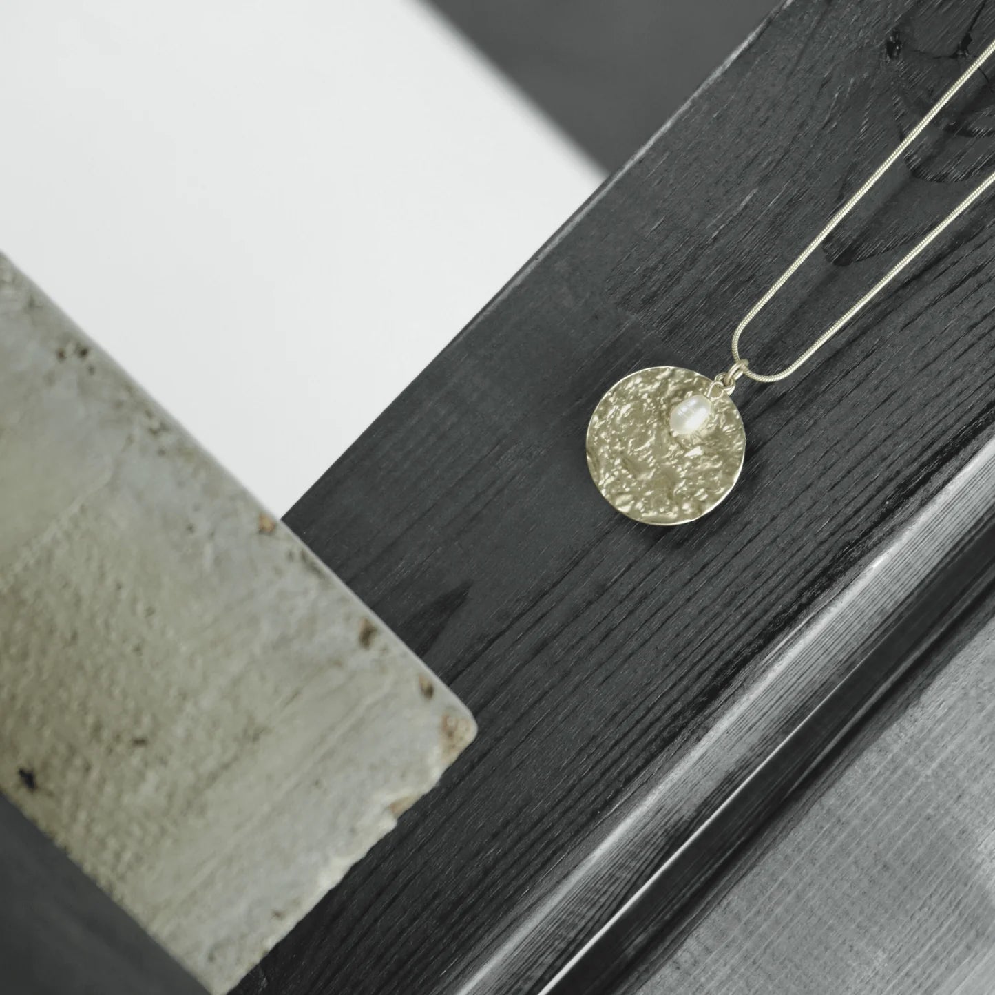 Effektvolle Halskette mit einem matt vergoldeten oder versilberten Anhänger und einem Anhänger mit einer Süßwasserperle. Variabel in der Länge einstellbar.