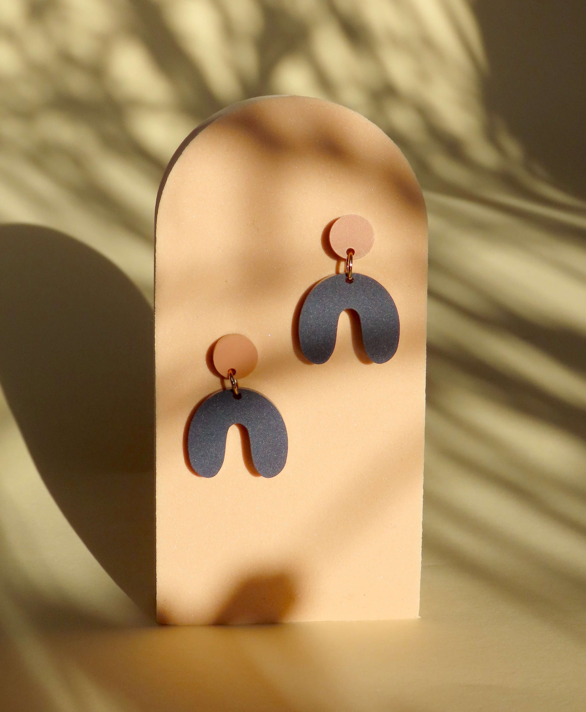 Klar, modern, stilvoll – diese Arch Ohrringe in Dunkelblau und Terracotta setzen ein zurückhaltendes Statement. Der warme Terracotta-Stecker bringt eine erdige Note, während der dunkelblaue Anhänger in U-Form cool und clean wirkt.