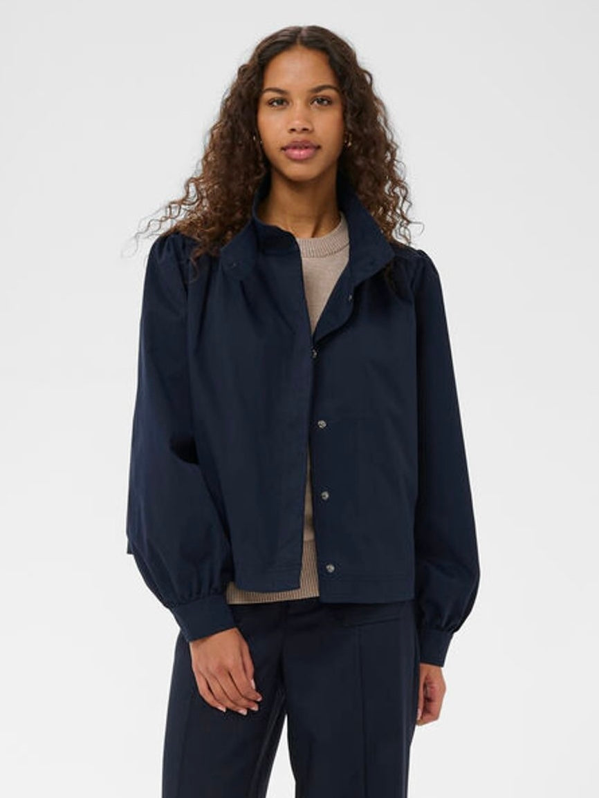 Modische Kurzjacke mit Stehkragen, weiten Ärmeln und gekräuselter Rückenpasse. Mit verdecktem Reißverschluss und Futter gearbeitet.