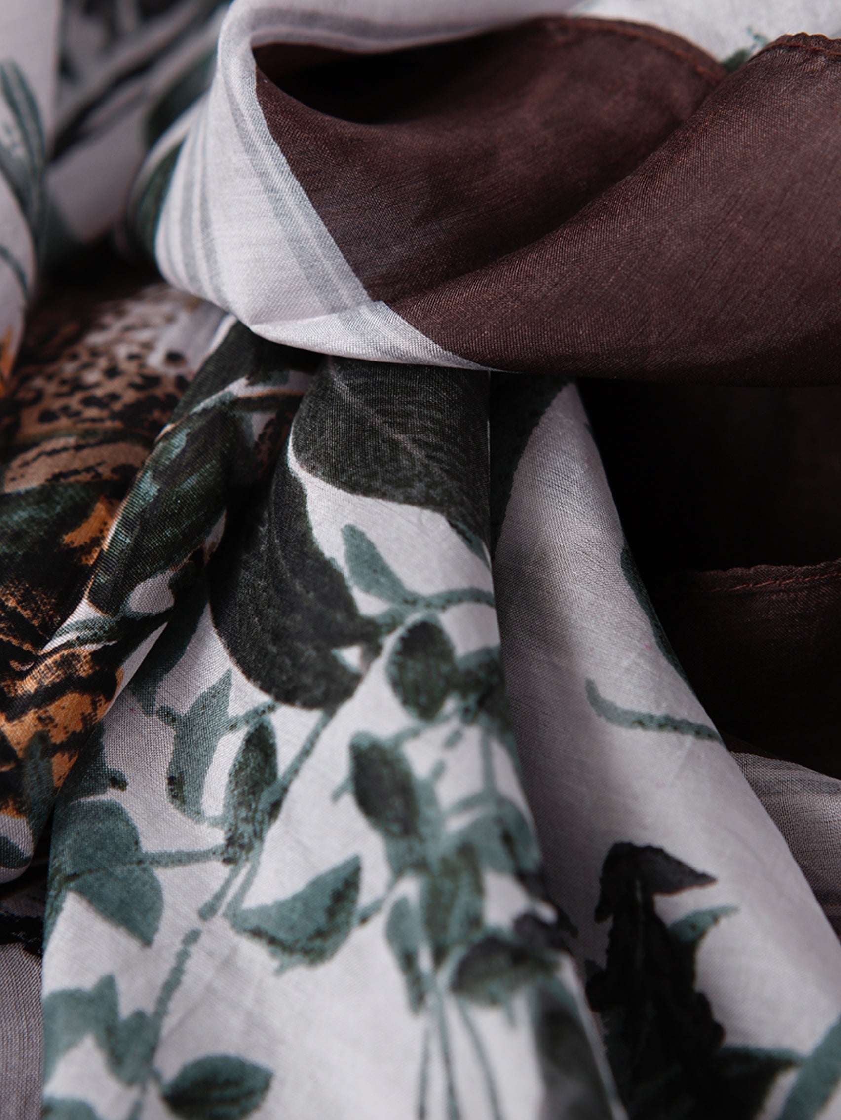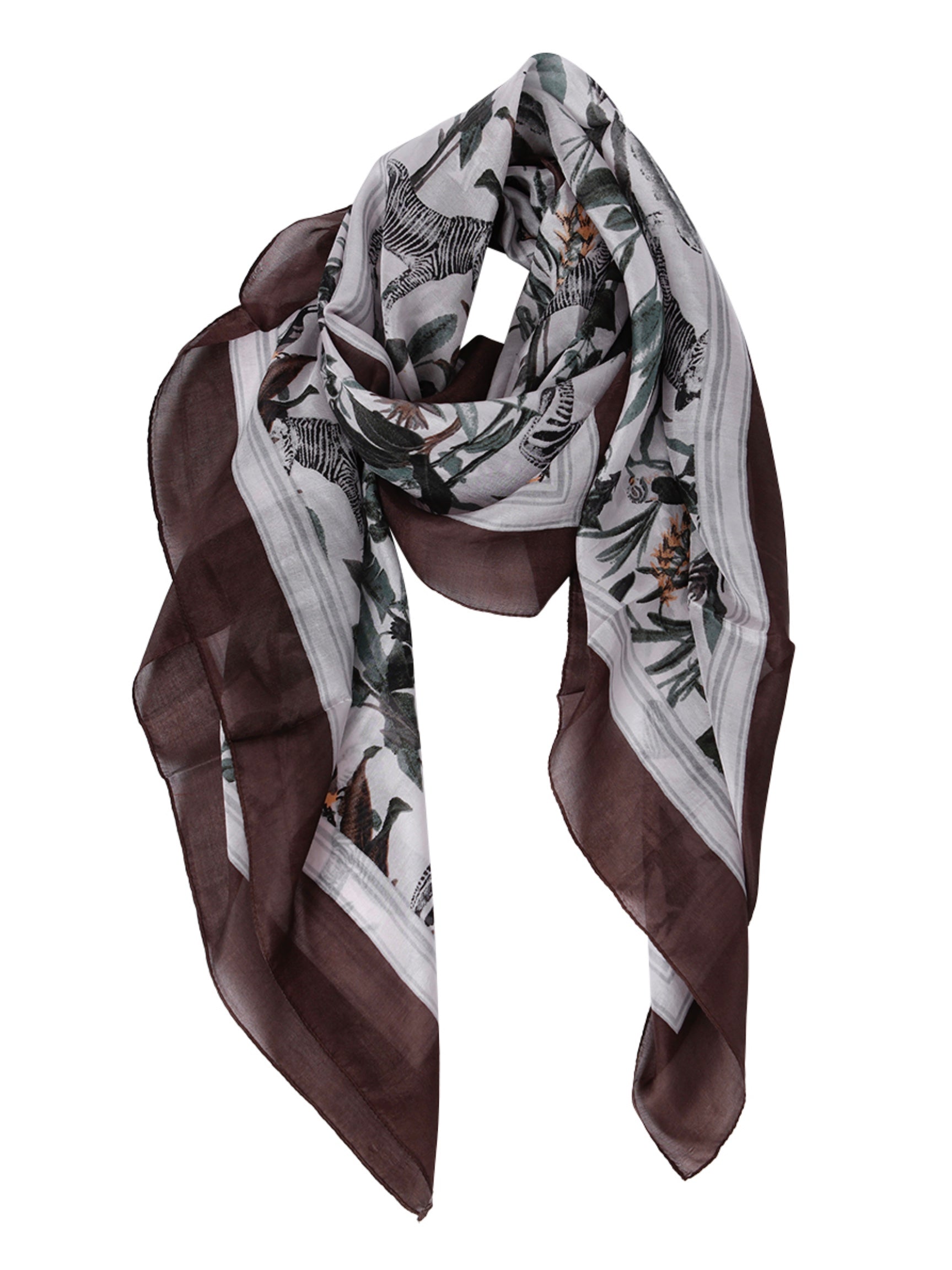 Hochwertiger Modeschal in einem dezenten Faunamuster mit soften Farbabstufungen aus reiner Seide. Quadratische Tuchform. Mit einem dunkelbraunen Rand gedruckt. Er lässt sich ideal kombinieren.