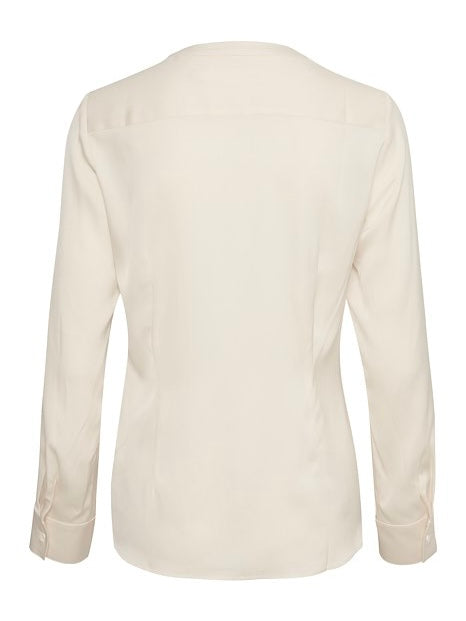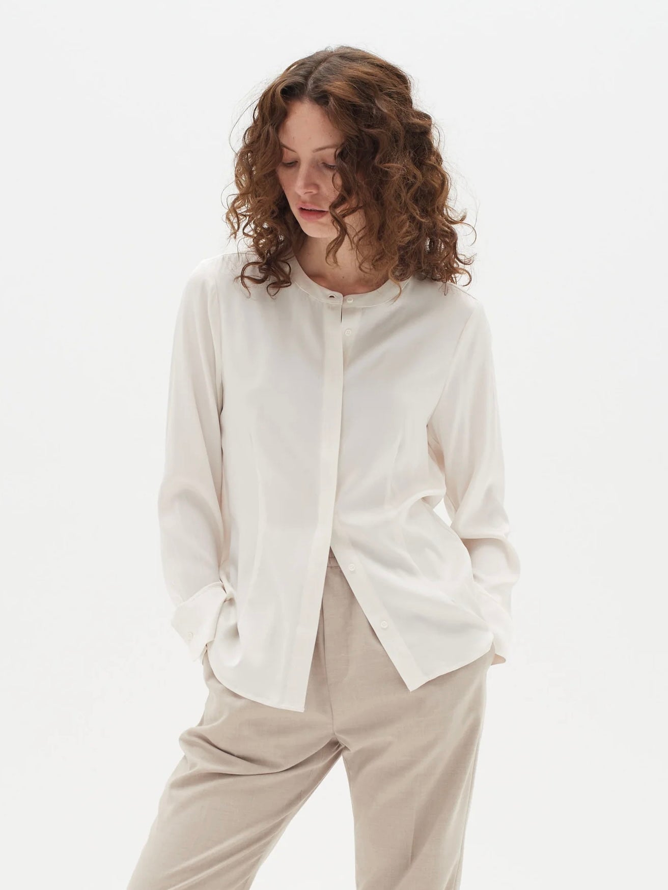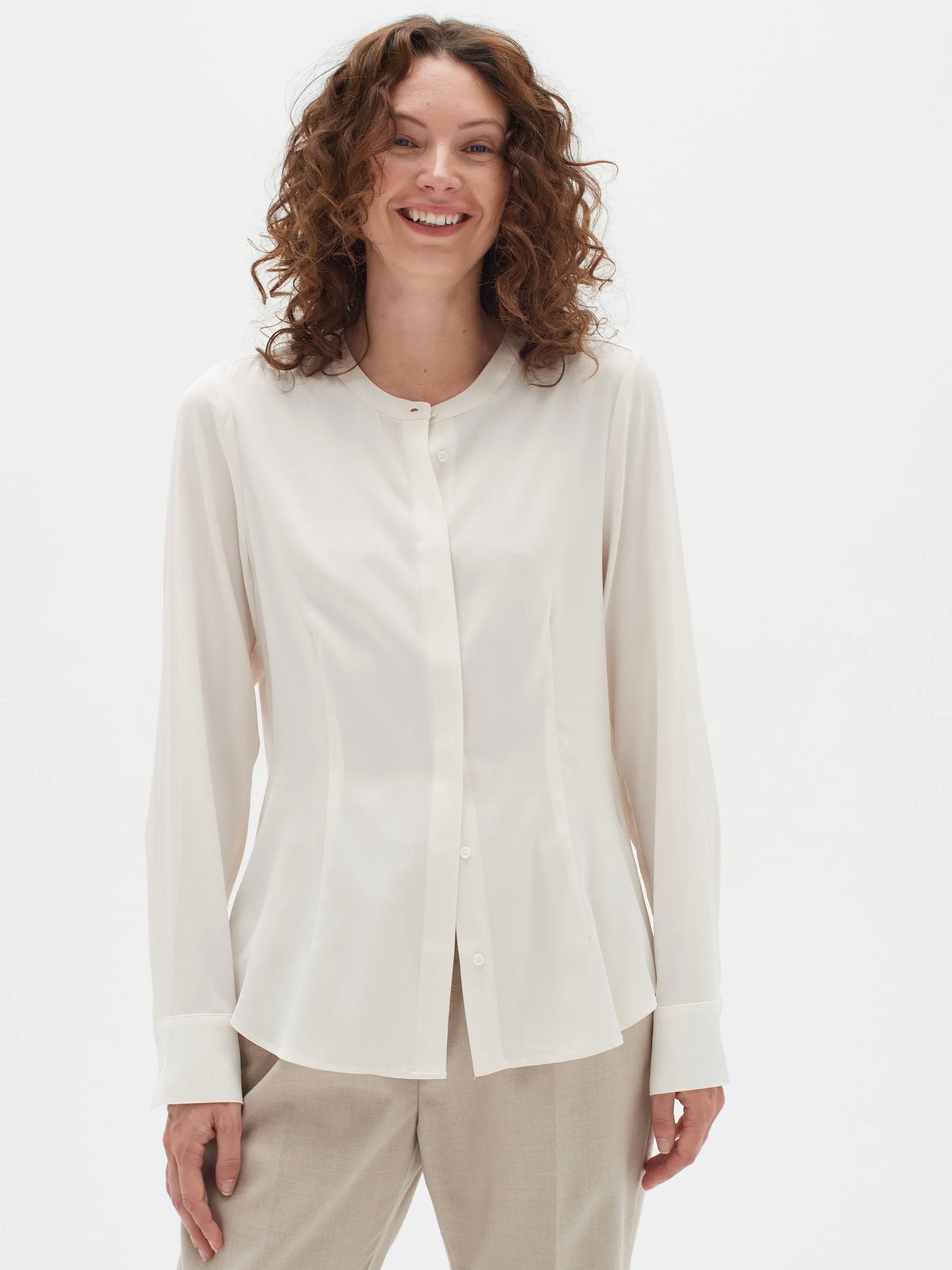 Modisches Blusenshirt aus reiner mattglänzender Seide mit Stretchanteil. Mit Chinakragen und verdeckter Knopfleiste gearbeitet. Taillierte Form mit Abnähern, Manschetten am Ärmelabschluss.