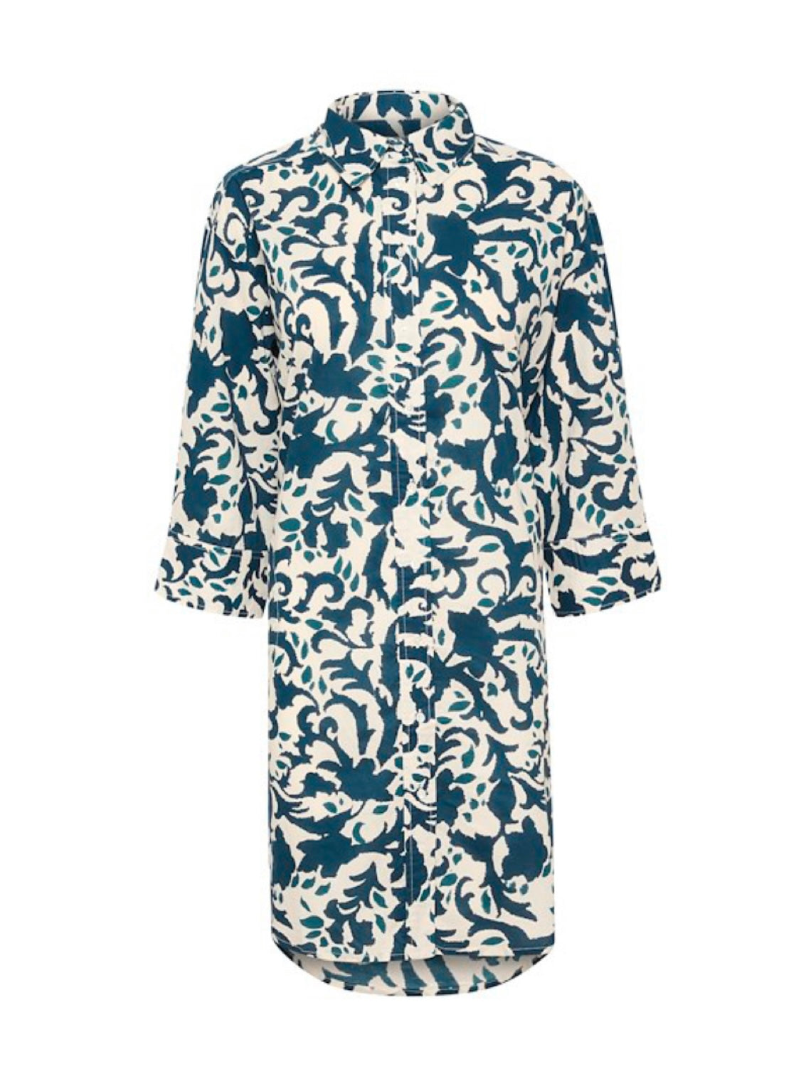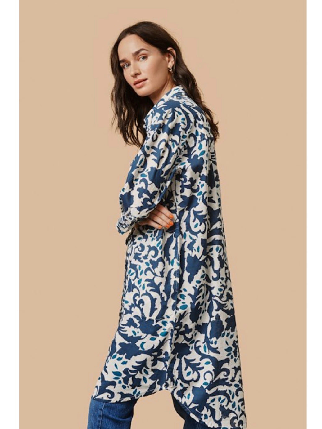 Effektvolles Hemdblusenkleid mit Ornamentdruck aus reiner Baumwolle. Mit verdeckter Knopfleiste und 7/8 langen, weiteren Ärmeln und breiten, offenen Manschetten am Abschluss. Weite Form mit abgerundetem Saum, hinten länger geschnitten. Mit lässigen Eingrifftaschen. Ideal für warme Sommertage.