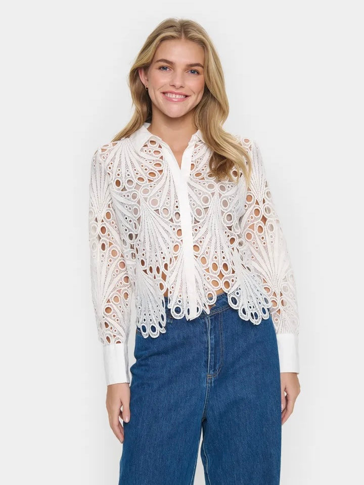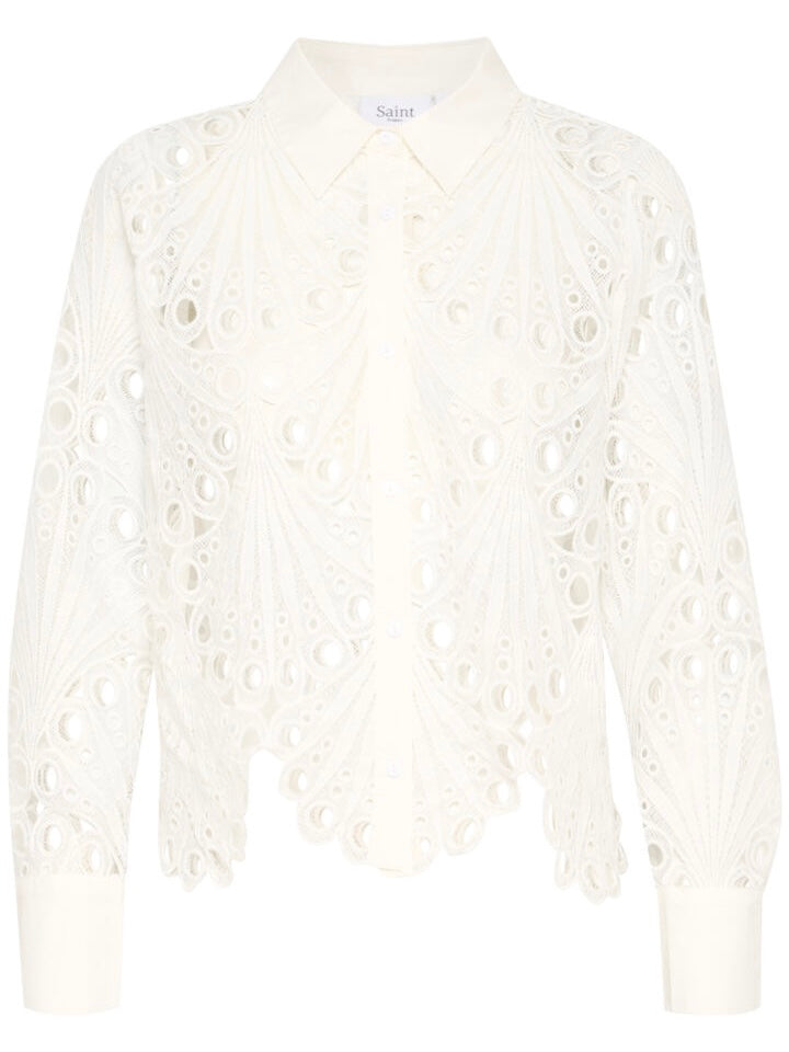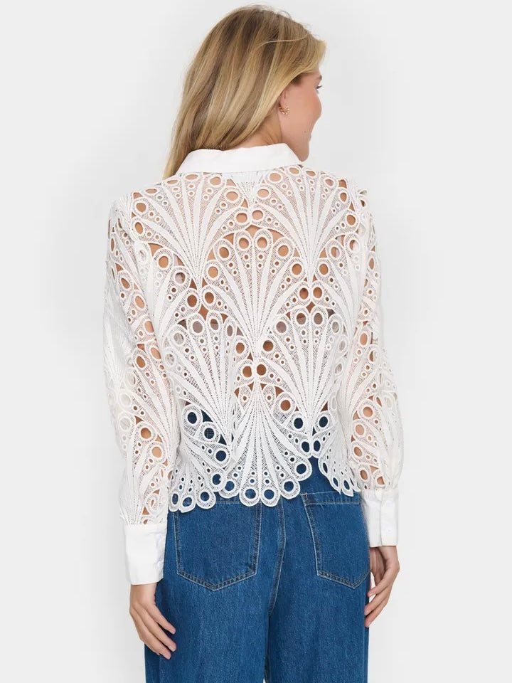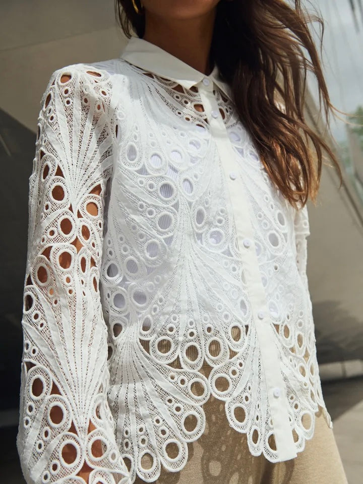 Feminine Bluse mit allover hochwertiger Broderie Anglaise. Hemdkragen, Manschetten. Wellenförmiger Saumverlauf.