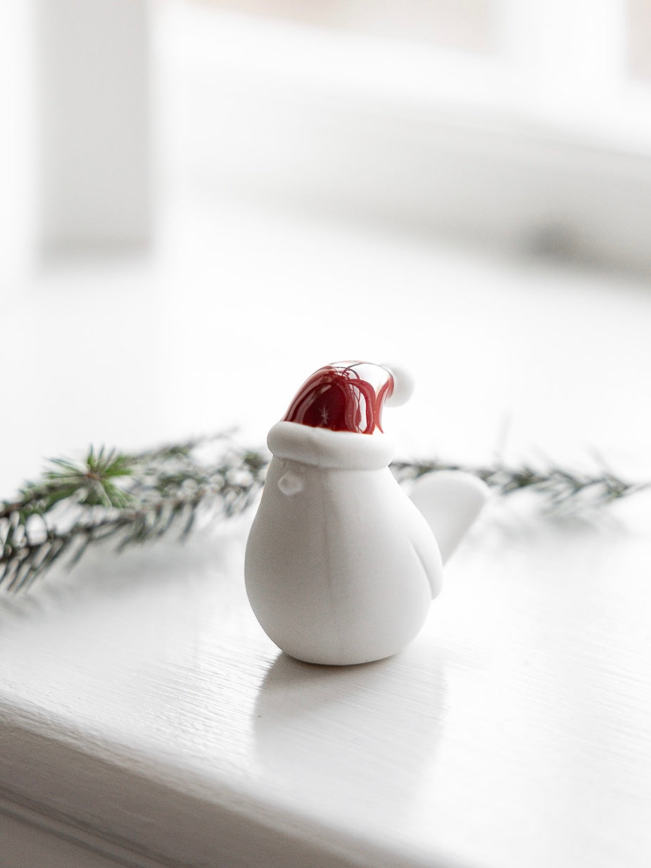 - Farbe: matt weiß mit glänzender roter Mütze