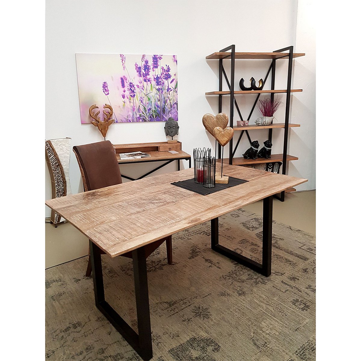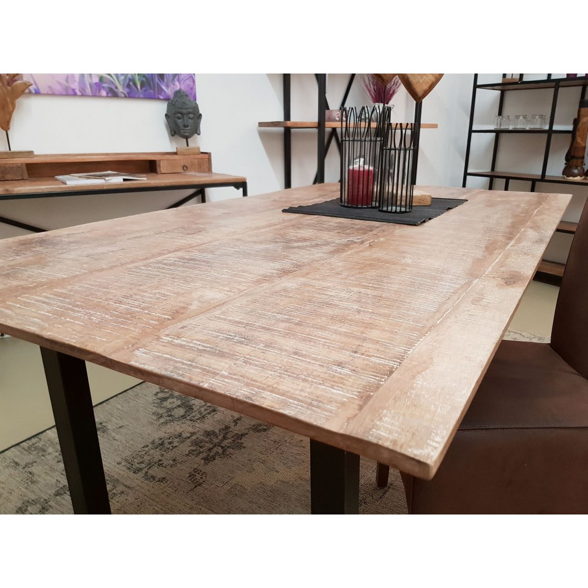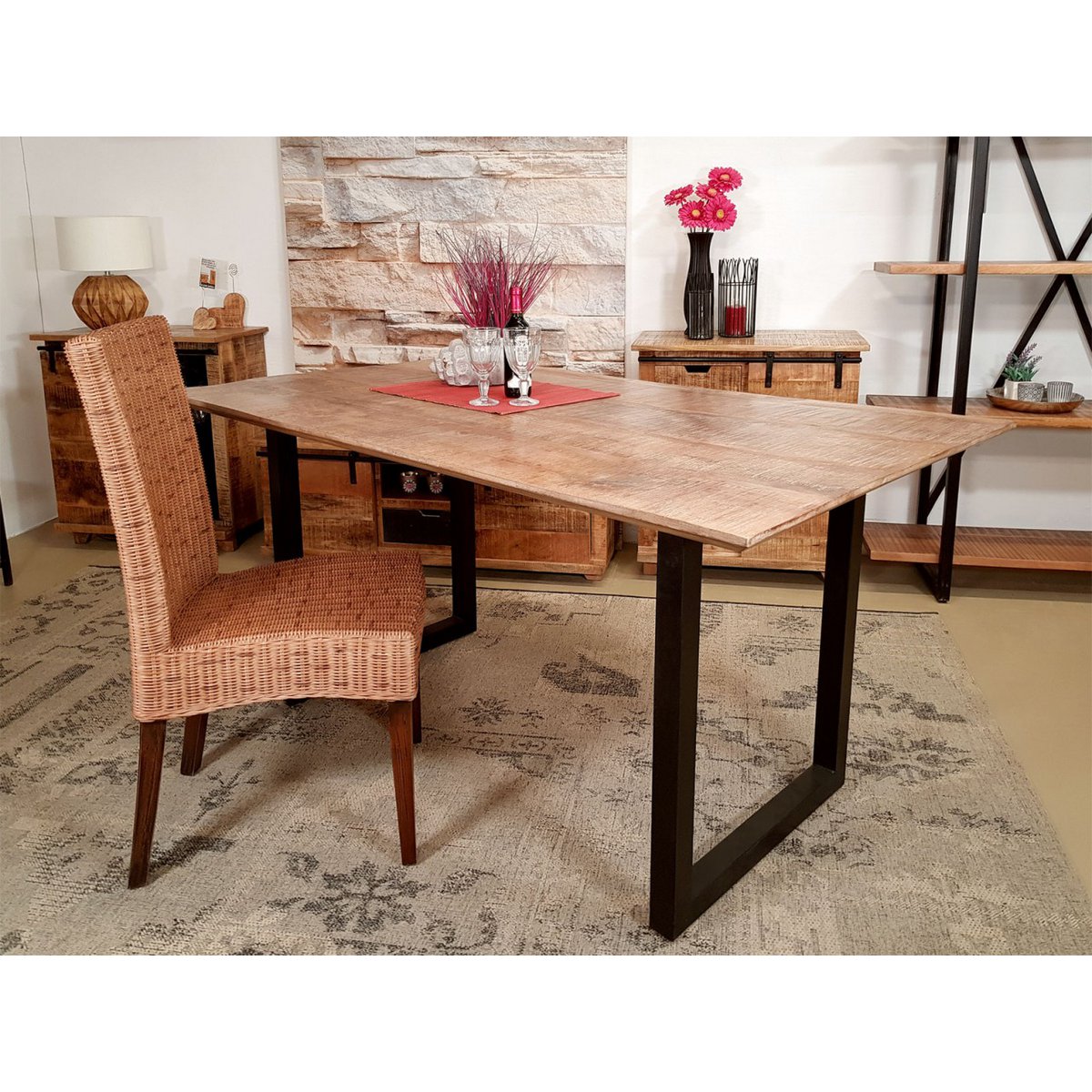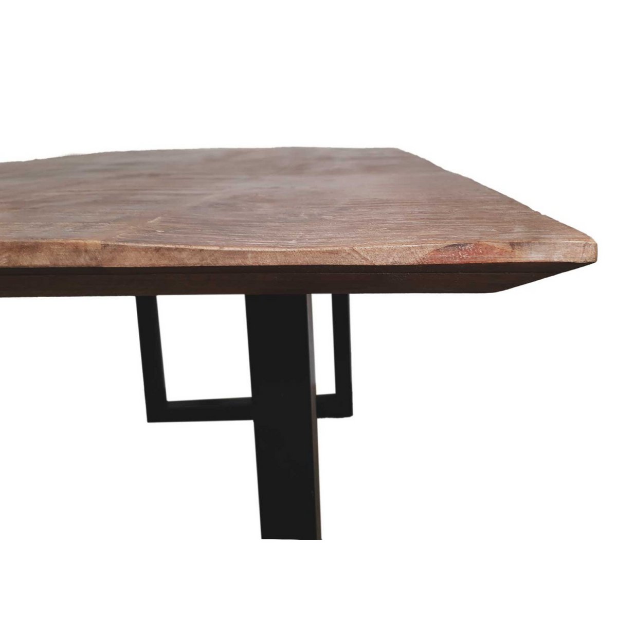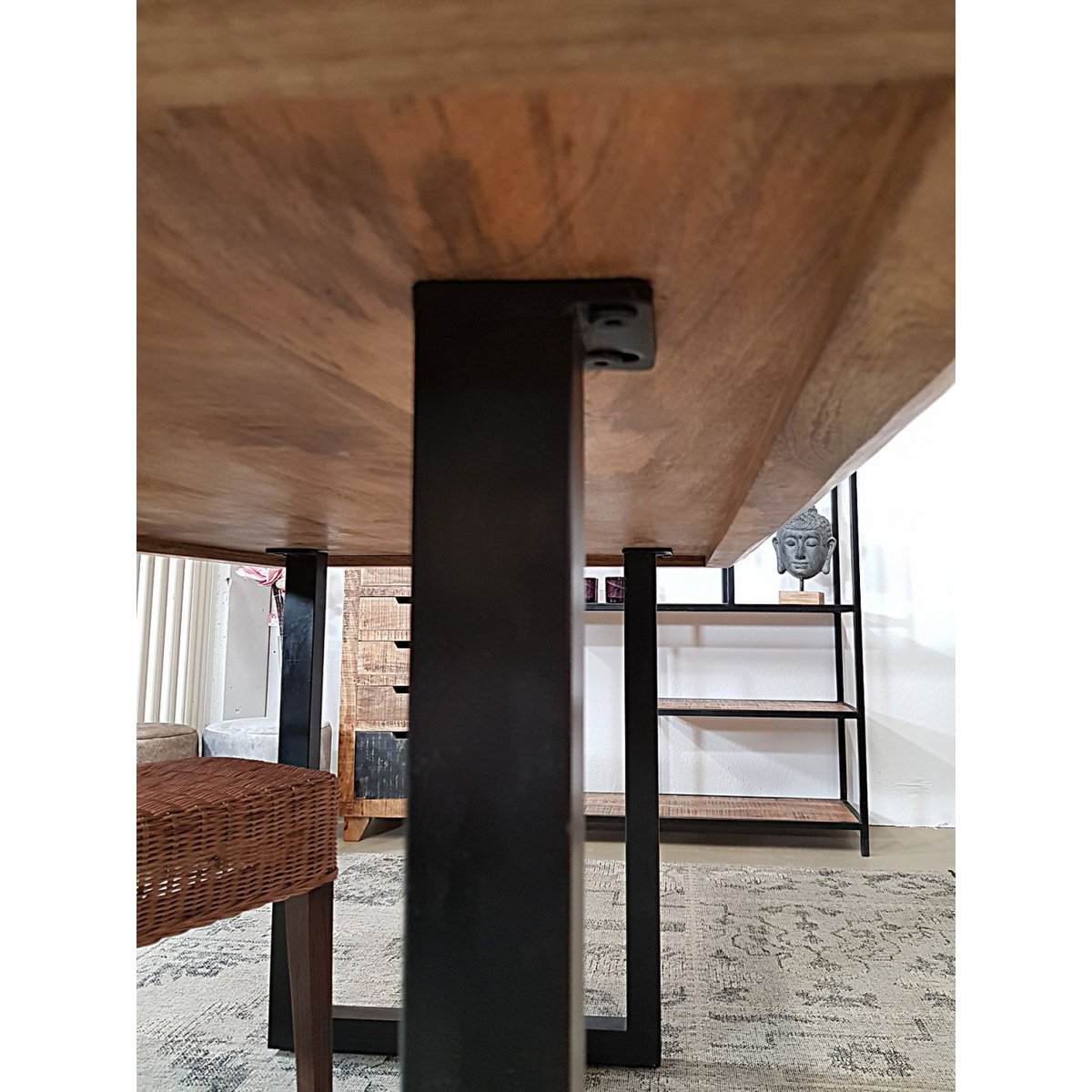 Rustikales Mangoholz trifft auf Industrial-Design: Jeder Tisch ist ein Unikat mit lebendiger Struktur, individueller Maserung und sichtbaren Gebrauchsspuren. Die ca. 2 cm starke Tischplatte wird von einem stabilen, mattschwarzen Metallgestell getragen – mit verstellbaren Füßen für sicheren Stand auf jedem Boden.