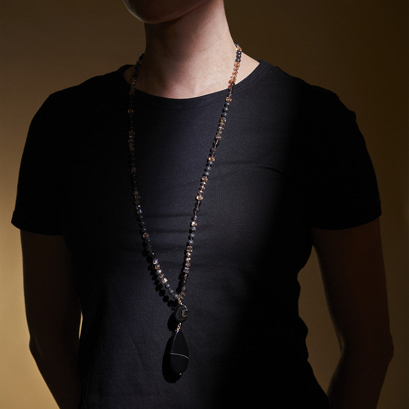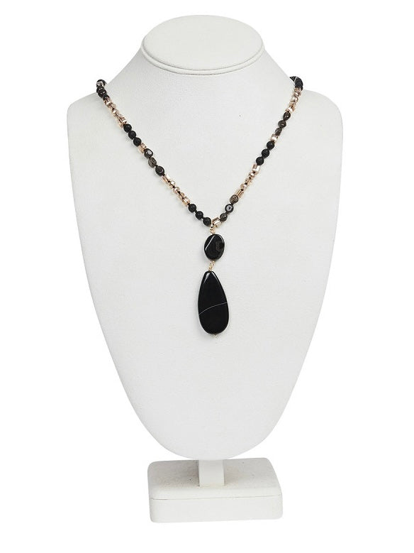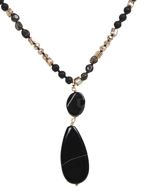 Dekorative Halskette mit einem Edelstein Anhänger in ovaler Form und einer etwas größeren Glasperle. Die Kette ist aus einem Mix aus unterschiedlichen Glasperlen und Steinen gearbeitet. Nickelfrei.