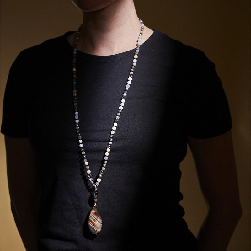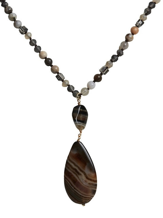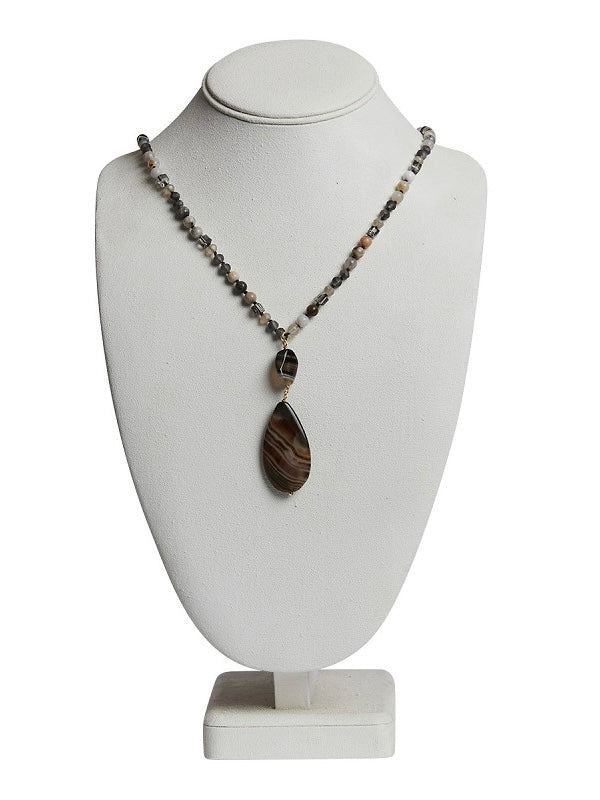 Dekorative Halskette mit einem Edelstein Anhänger in ovaler Form und einer etwas größeren Glasperle. Die Kette ist aus einem Mix aus unterschiedlichen Glasperlen und Steinen gearbeitet. Nickelfrei.