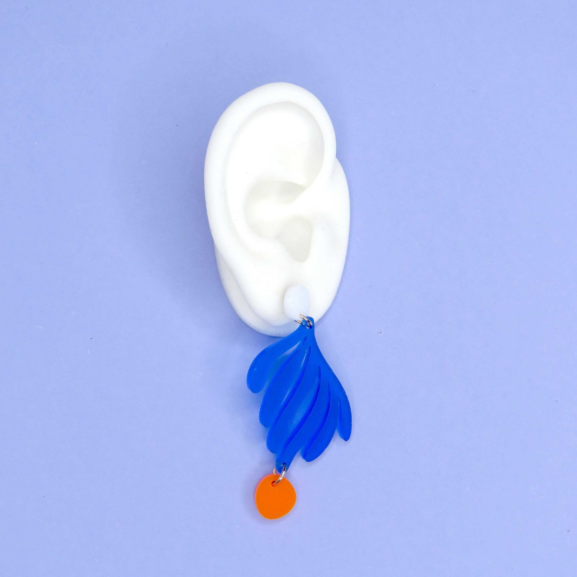 Du willst auffallen, aber mit Stil? Dann sind diese Acryl-Ohrringe genau dein Ding! Das Design erinnert an Matisse’s berühmte Scherenschnitte – mit schwungvollen, blattähnlichen Elementen in leuchtendem Blau und einem kleinen orangen Kreis als farbigem Kontrastpunkt.