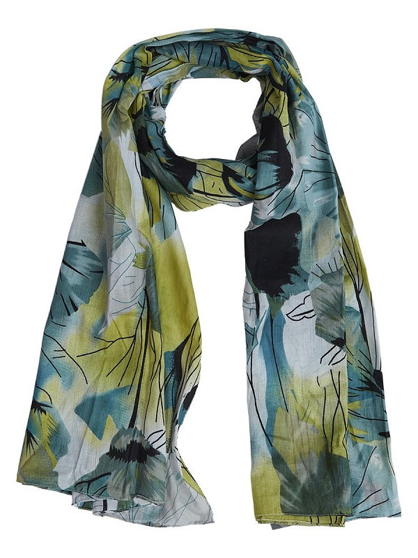 Edler Modeschal aus reiner Baumwolle mit einem farblich abgestimmten Floralmuster in Aquatönen. Er lässt sich ideal zu Kleidern und Shirts kombinieren.
