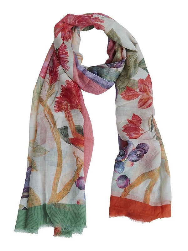 Farbenfroher Modeschal mit einem edlen Floralmuster, aus einer soften Baumwoll-/Modalqualität gearbeitet. An den Enden rot und grün abgesetzt. Er lässt sich ideal zu Kleidern und Shirts kombinieren.