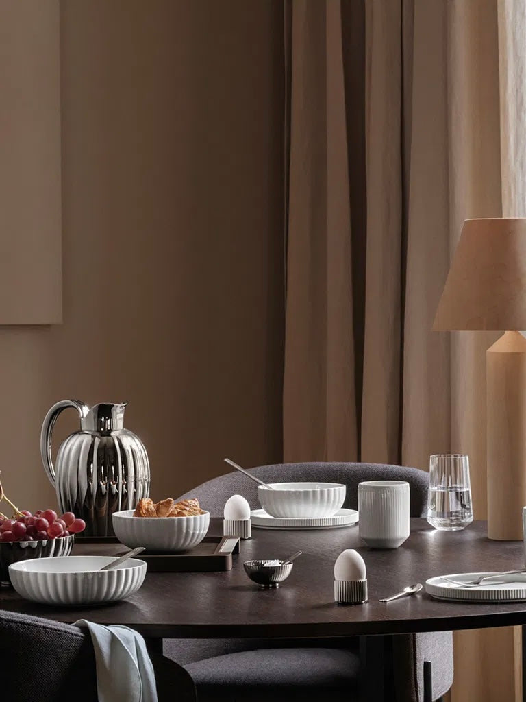 Durch die Kombination der Rillen, die Bernadottes funktionalistische Ästhetik auszeichnen, mit einer coolen und modernen Form verleiht diese Porzellanschale dem Tisch einen minimalistischen Touch. Die äußeren Rillen fügen sowohl ein dekoratives als auch ein taktiles Element hinzu, das Interesse weckt und die Speisen umrahmt, ohne davon abzulenken.