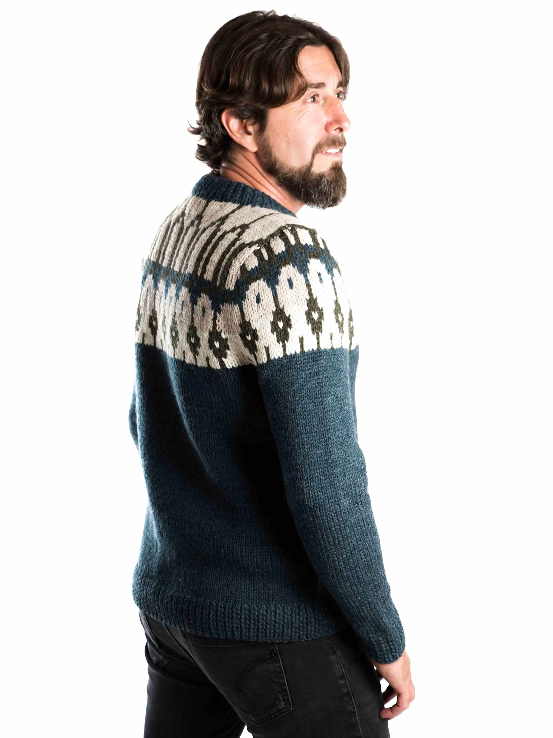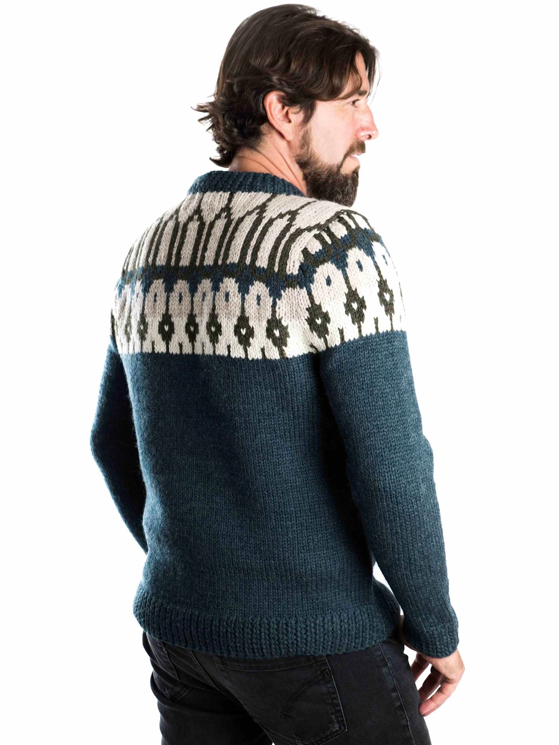 Modischer handgestrickter Pullover aus reiner Merinowolle mit einem attraktiven Strickmuster im Norweger Look. Die Wolle atmet und hilft, die Körpertemperatur zu regeln. Mit Rippenbündchen am Saum und Ärmelabschluss gearbeitet. Ein absolutes Highlight für die kühlen Wintertage.