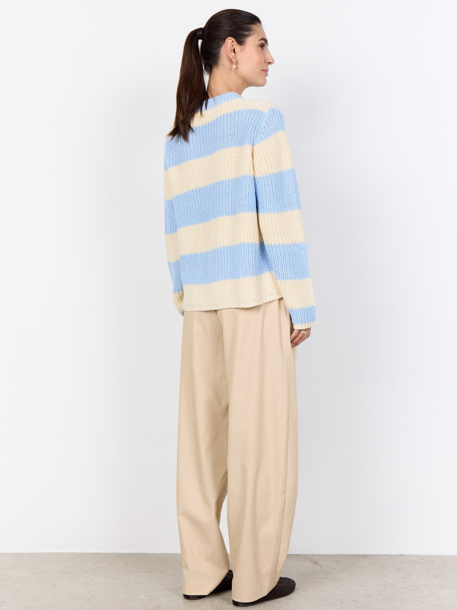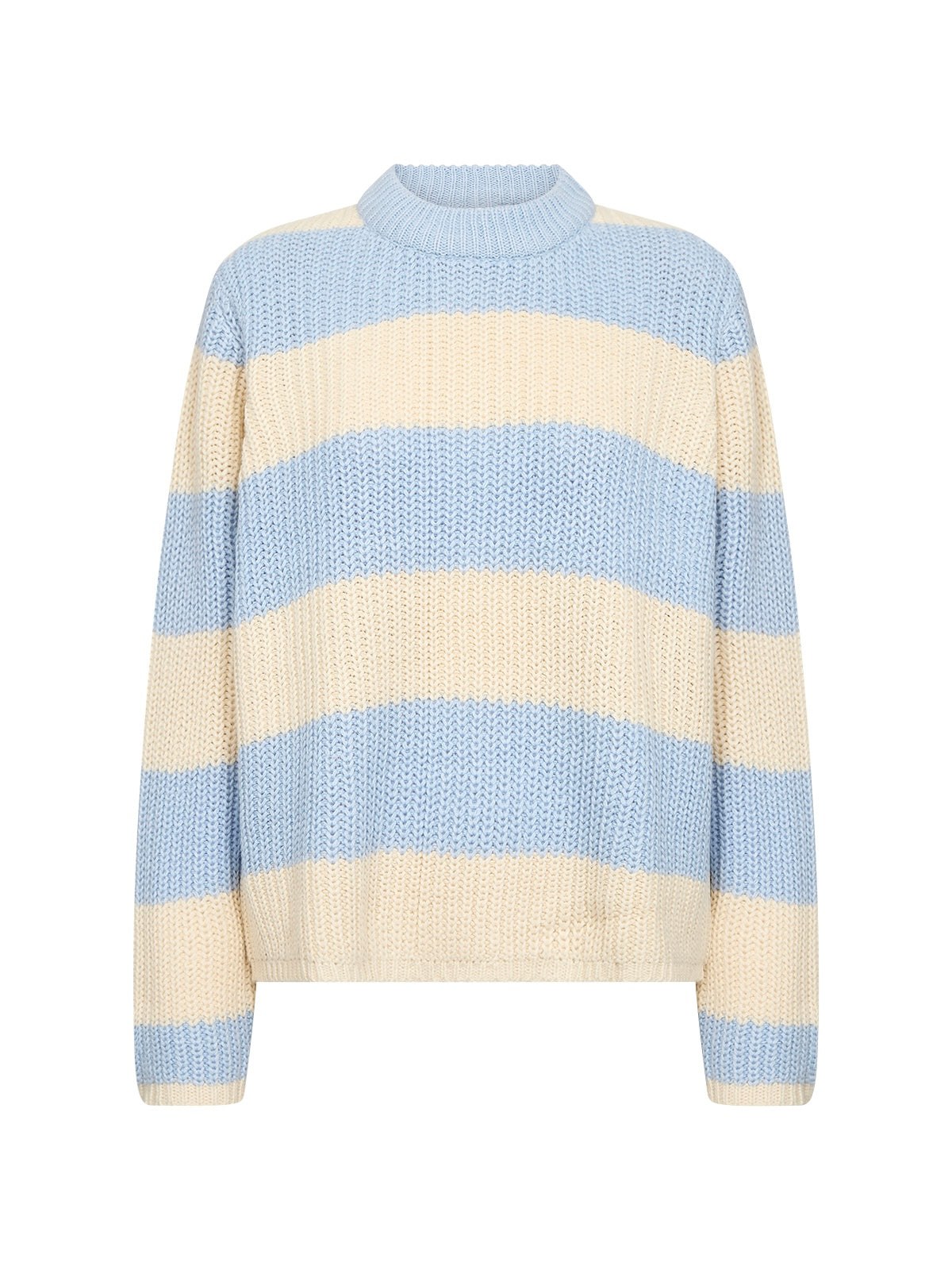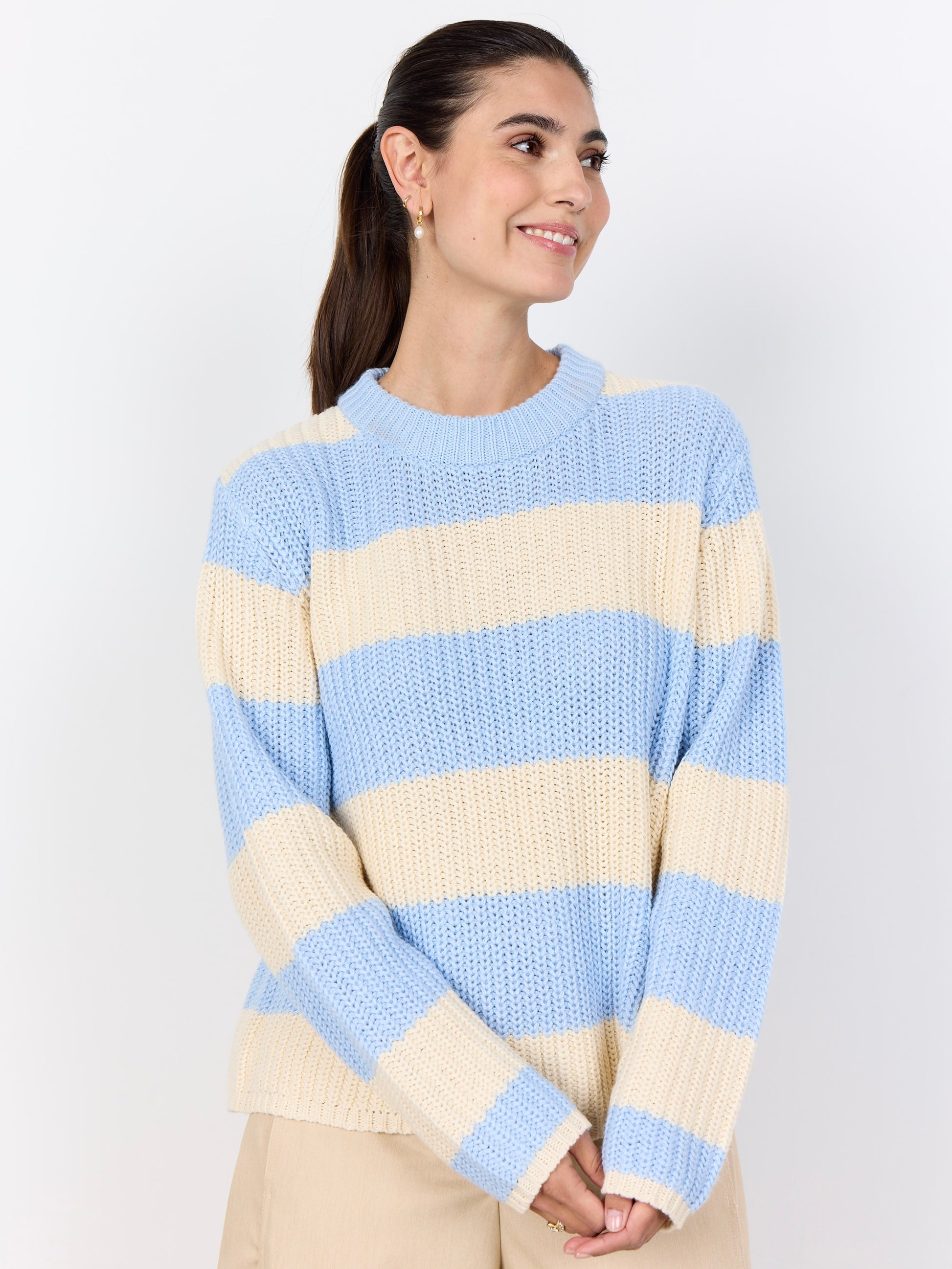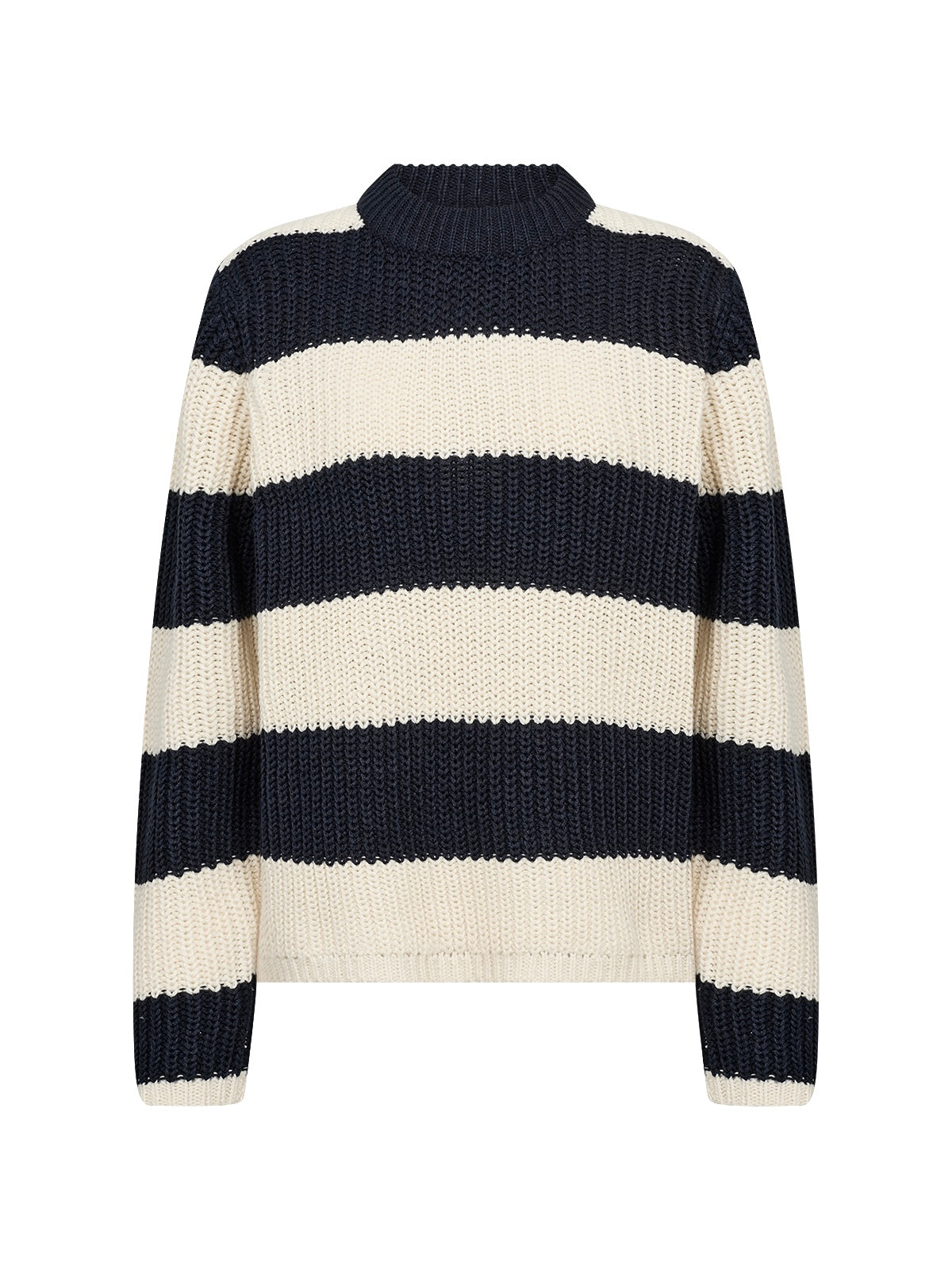 Grob gestrickter Blockstreifenpullover mit Rundhalsausschnitt in Rippenstrick. Hochwertige Baumwollmischung. Leicht kurze kastige Form.