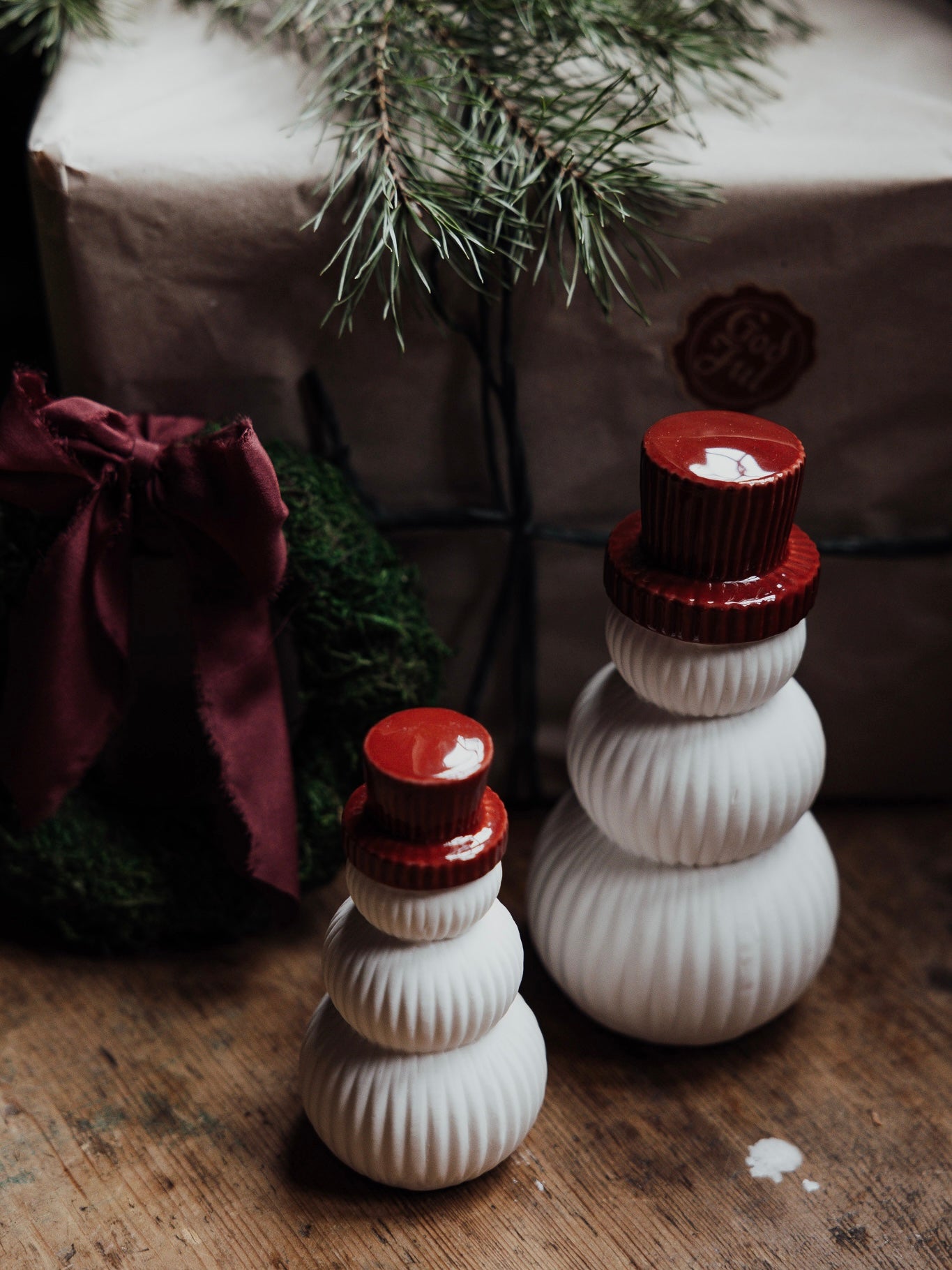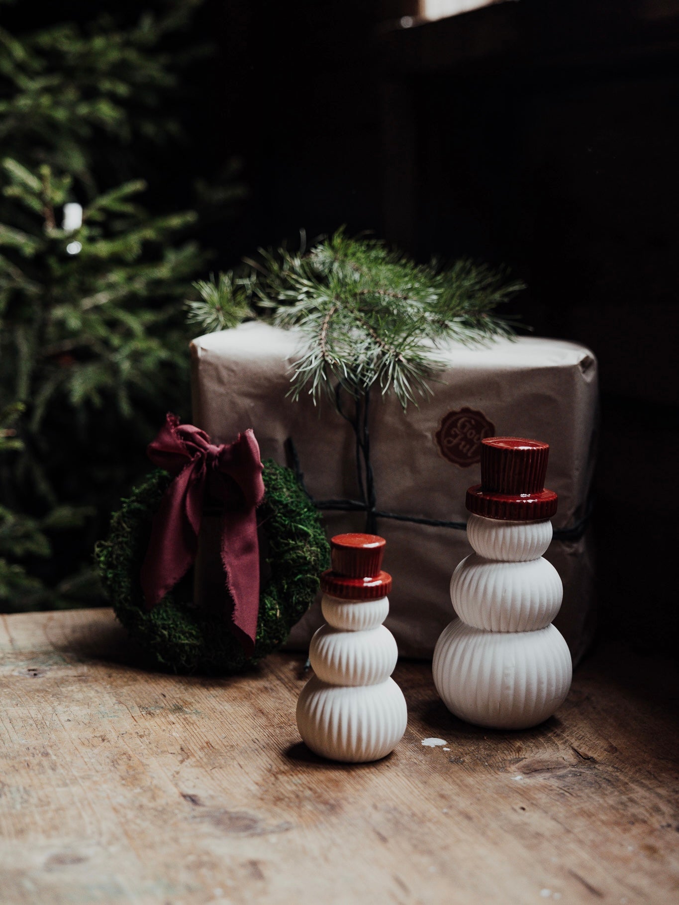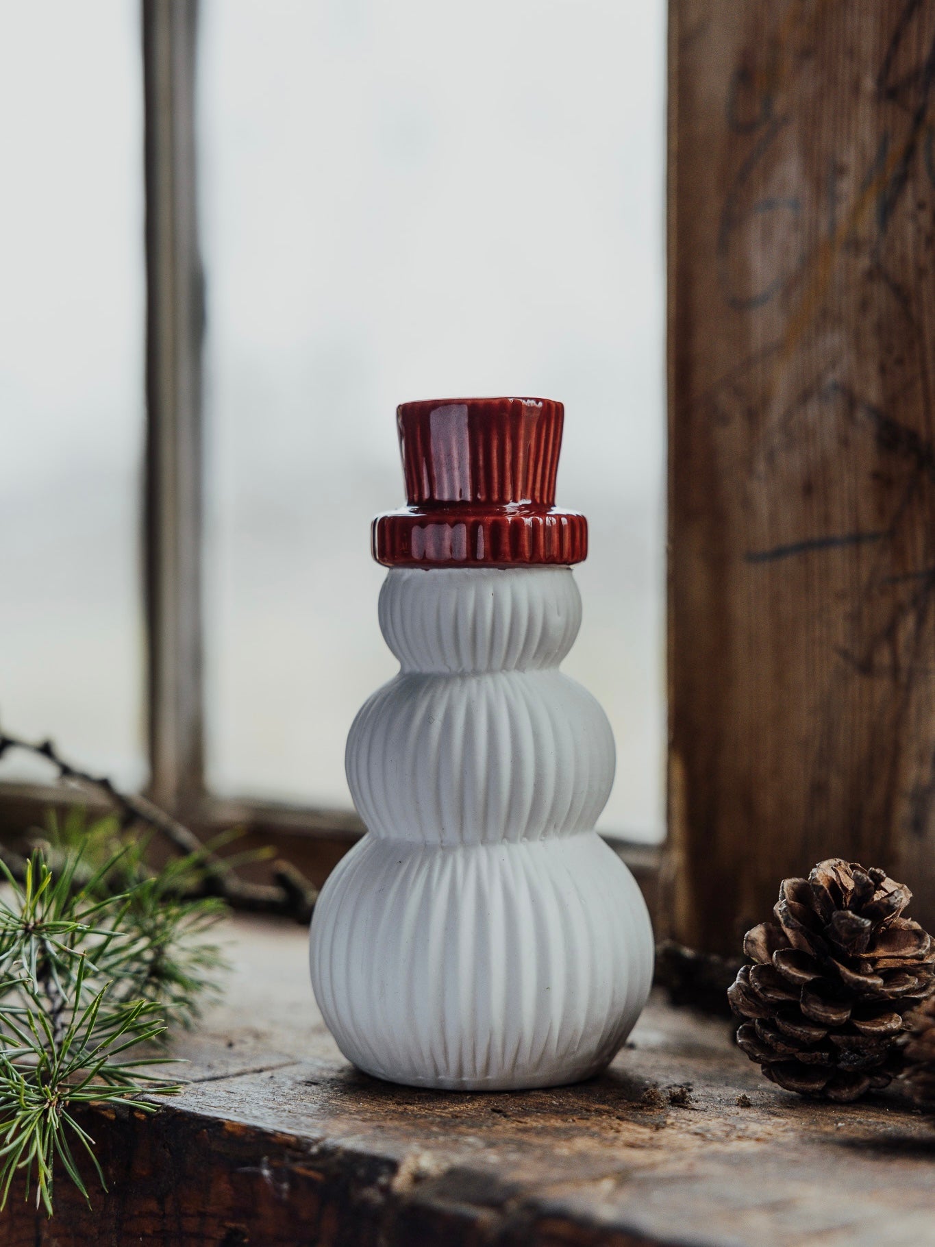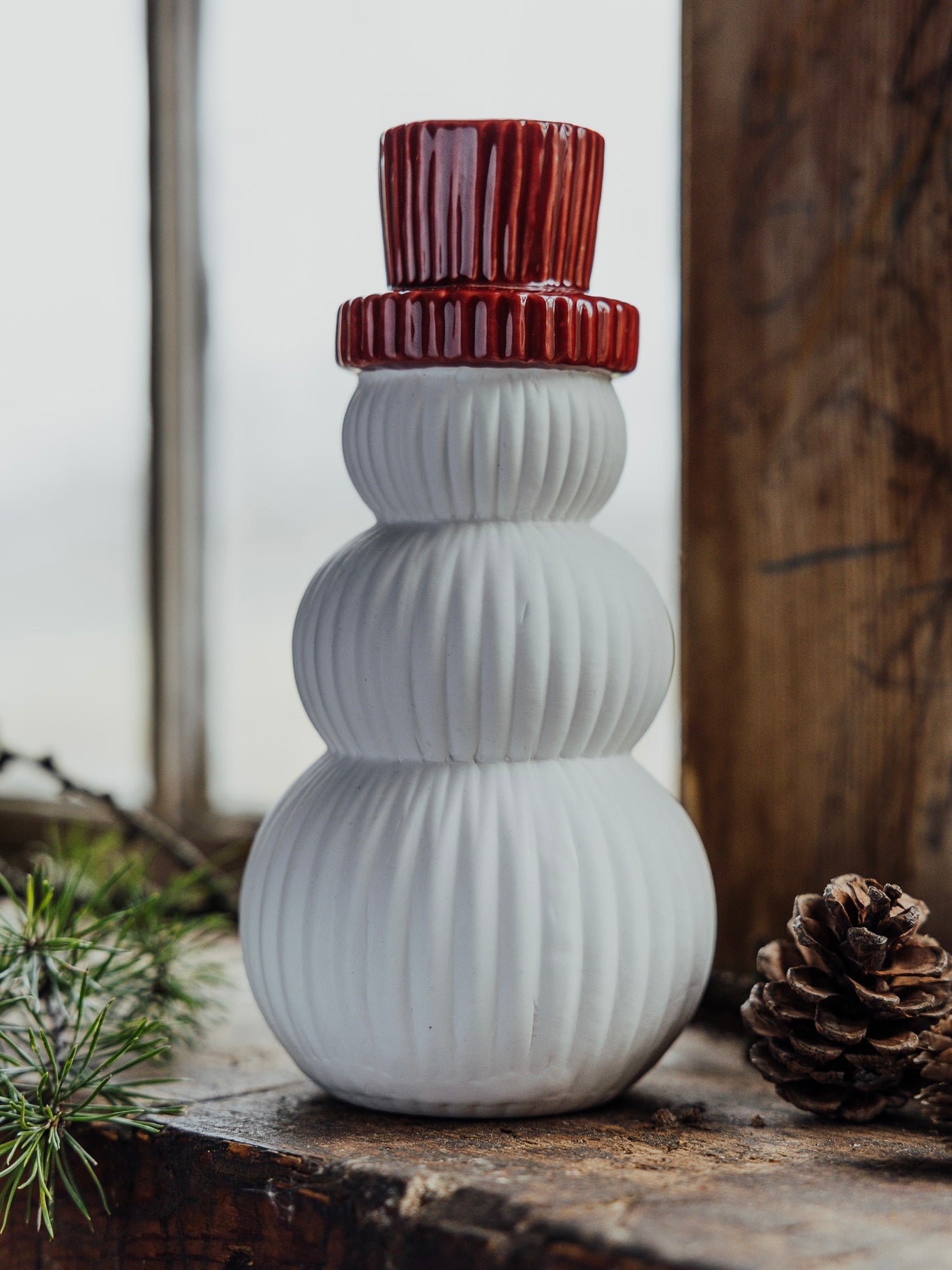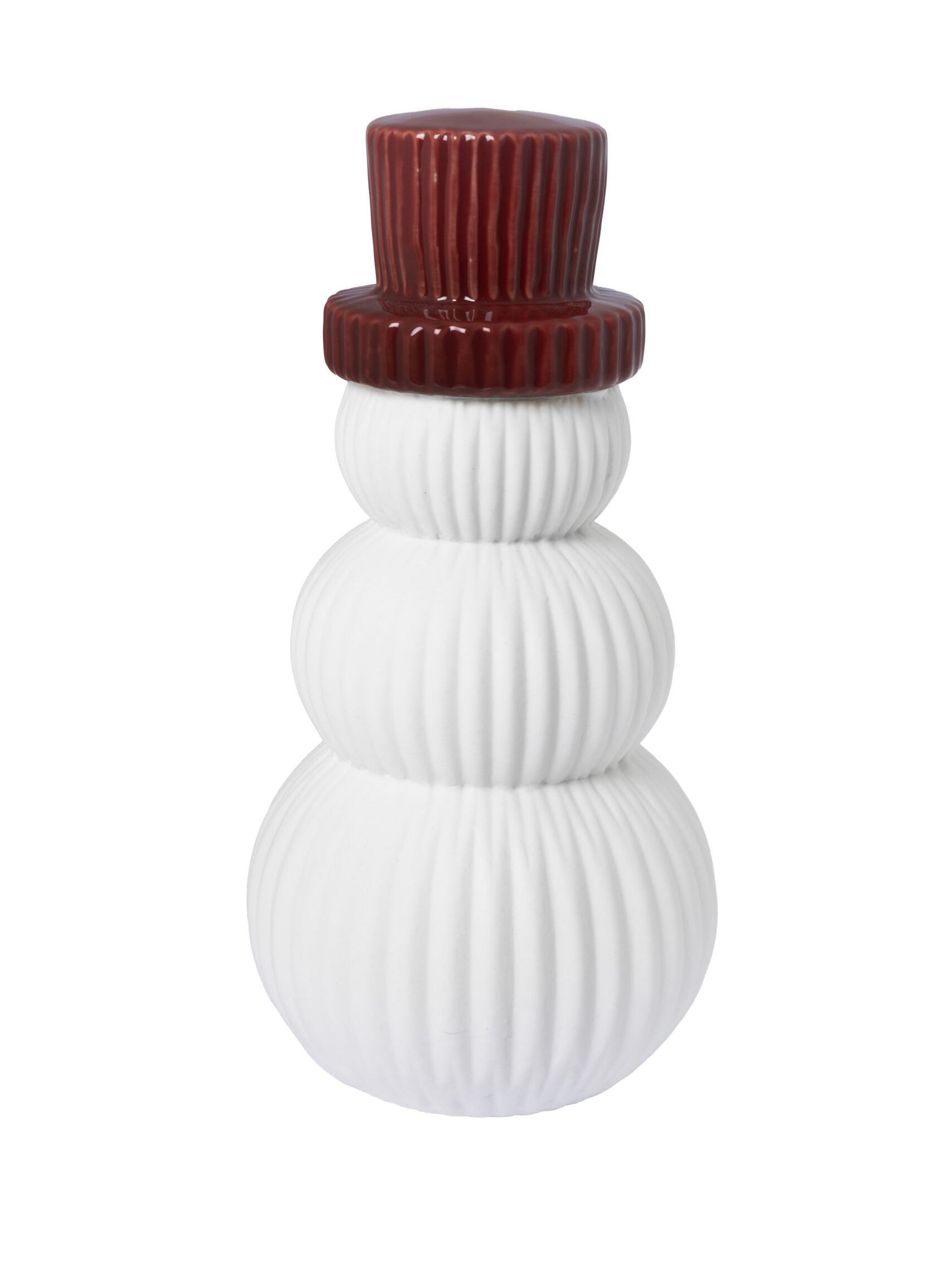 Deko-Schneemann mit feiner Rippenstruktur aus Keramik zur Tischdekoration oder auf dem Regal. Eine perfekte Dekoration für die Winterzeit. Der rote Hut ist glasiert.