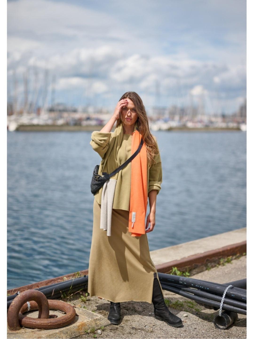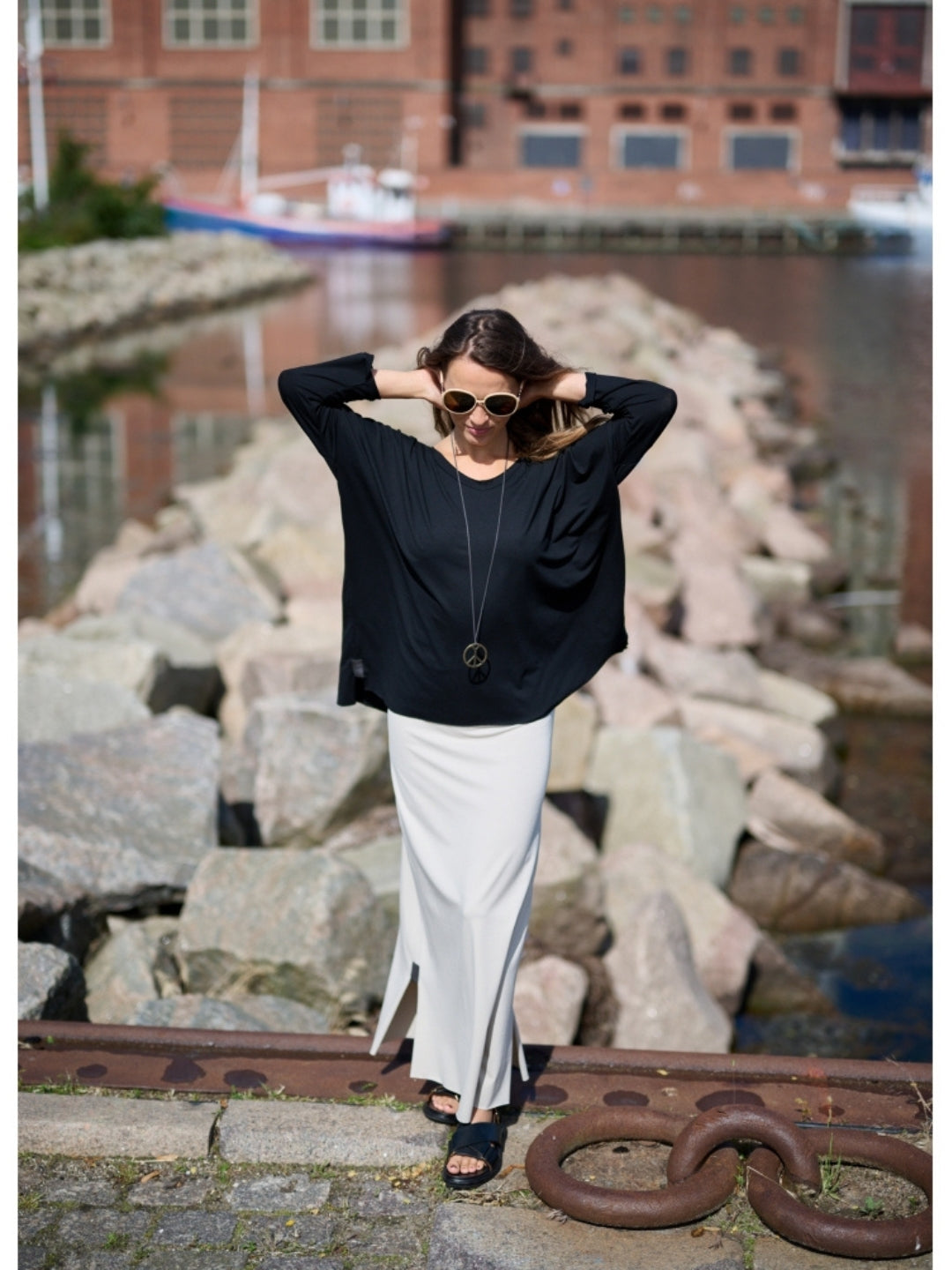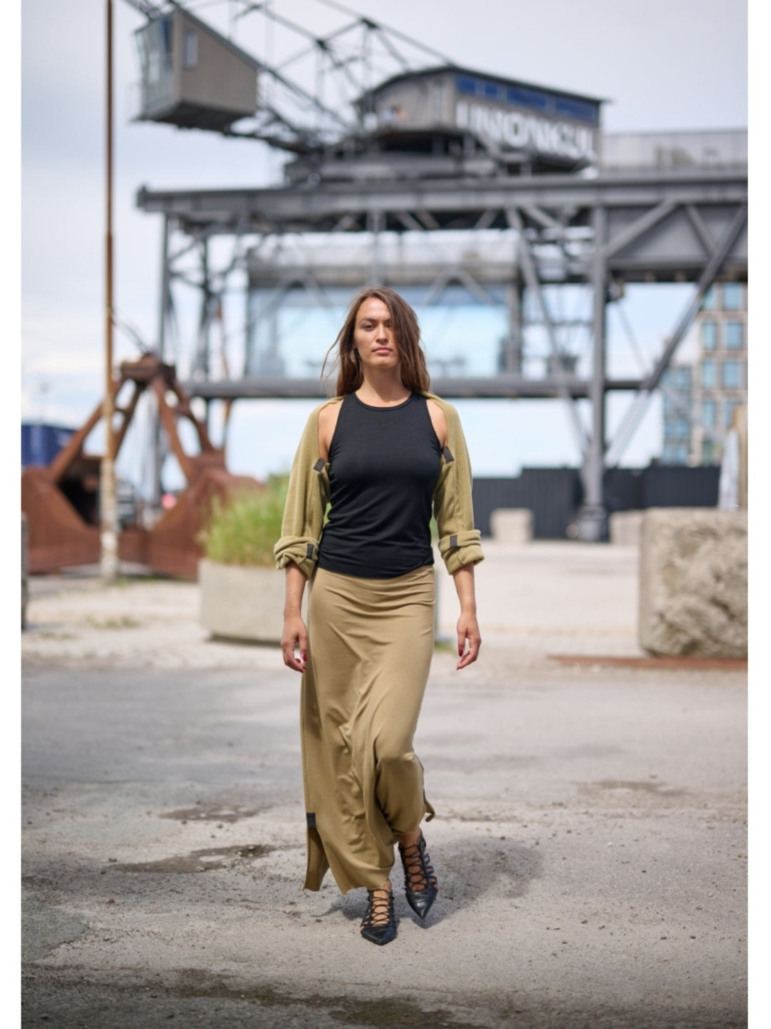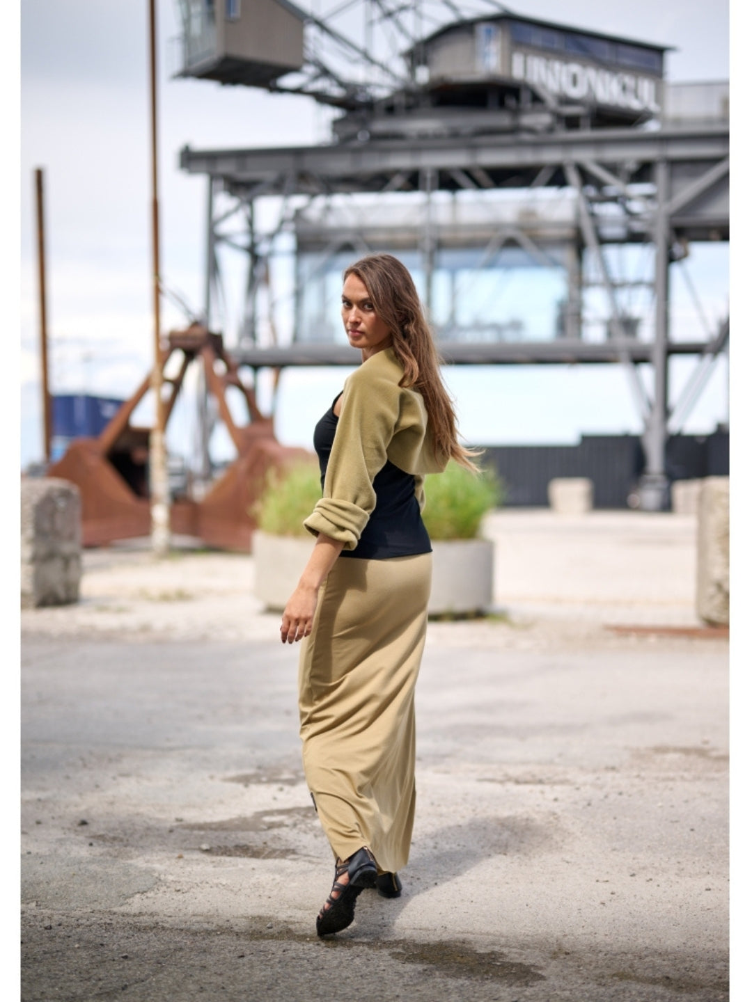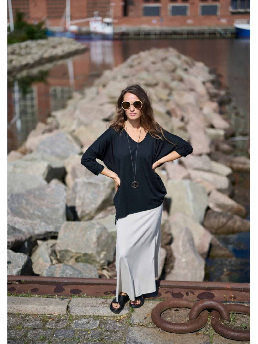 Langer Rock mit seitlichen Schlitzen. Der Bund ist doppellagig – du entscheidest selbst, wie viel du umschlägst. Das Design ist schmal geschnitten – wenn du es nicht enganliegend magst, kannst du eine Nummer größer wählen.
