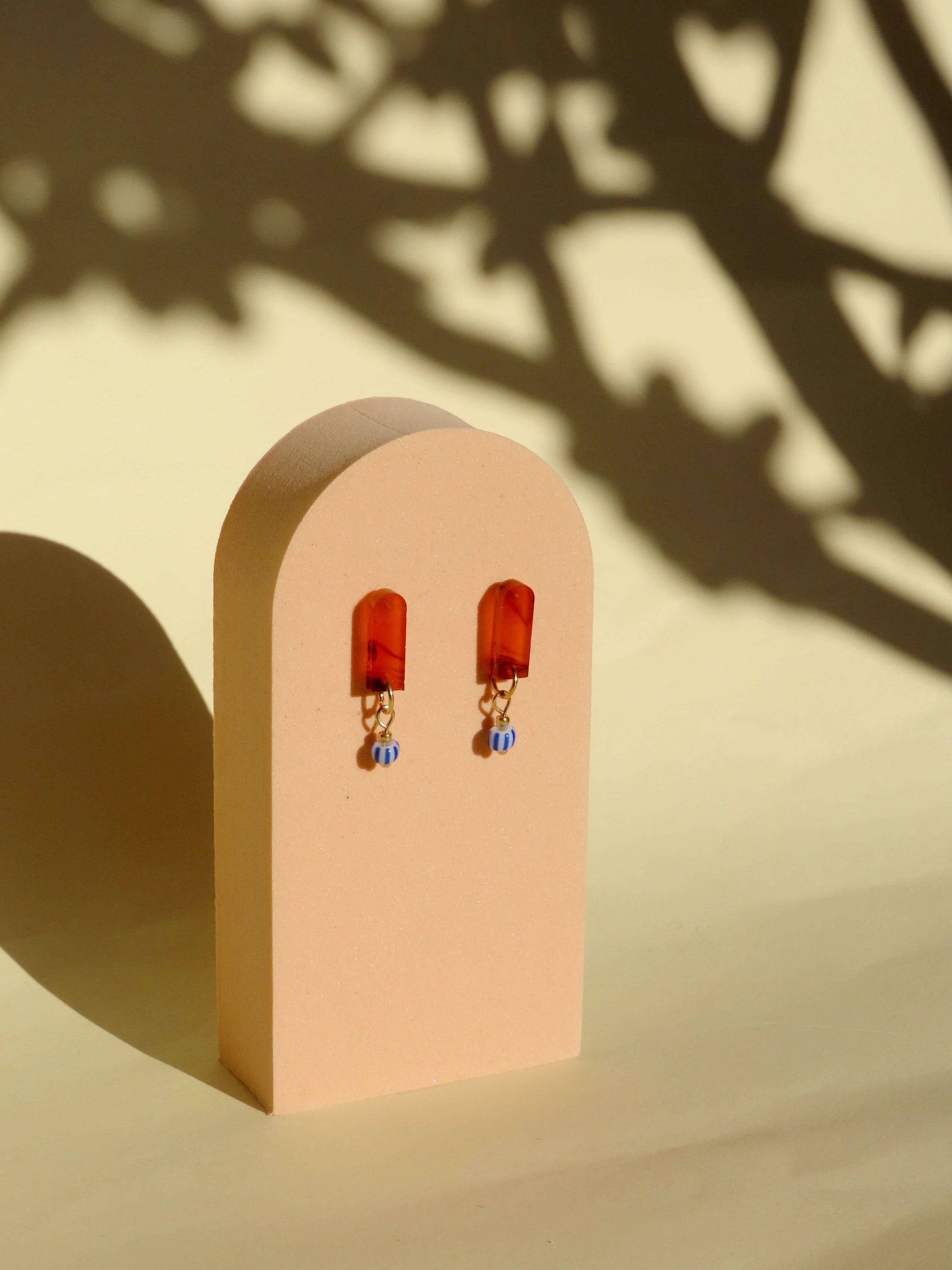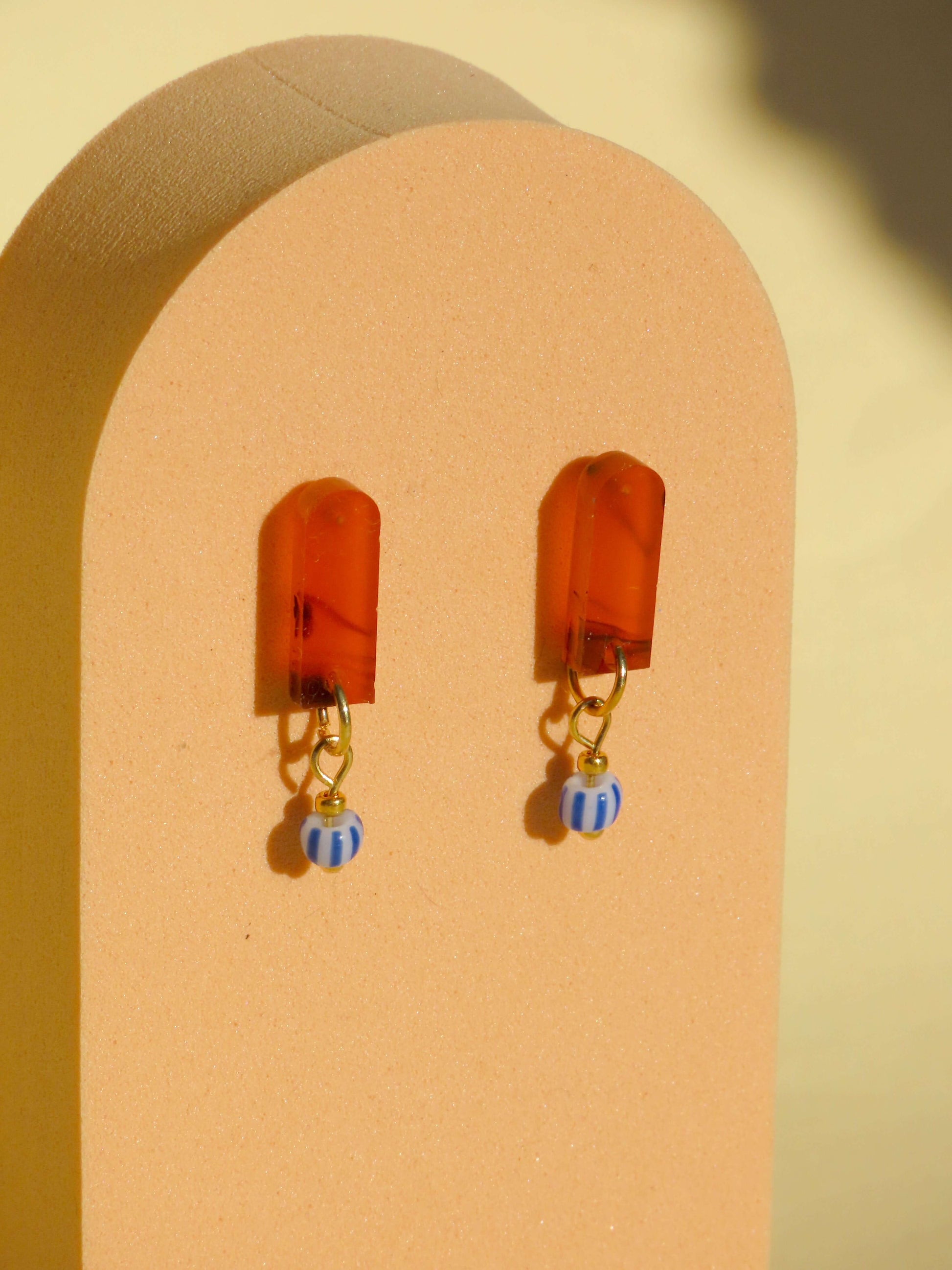 Smokey Paula kombiniert klare Formen mit lebendigem Detail: Oben ein rechteckiges Acryl-Element in rauchigem Braun – jede Maserung ein Unikat. Unten schwingt eine hellblaue Glasperle mit feinen Streifen – leicht, verspielt, sommerlich.