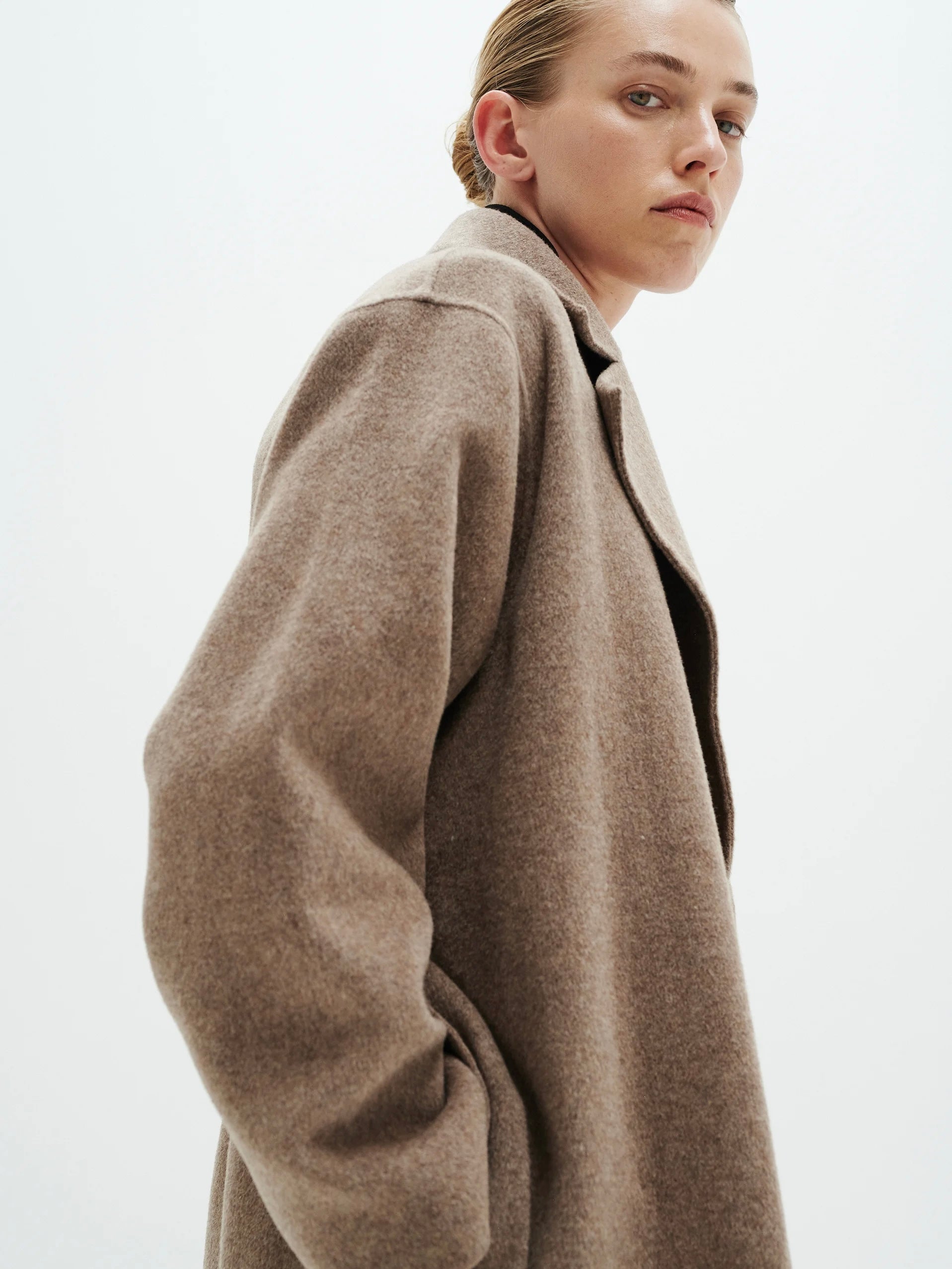 Edel sportiv ist dieser schlichte Wollmantel. Klassischer Reverskragen, vorn mit verdeckter Knopfleiste und Bindegürtel. Doubleface Qualität, ohne Futter gearbeitet. Eingrifftaschen seitlich.