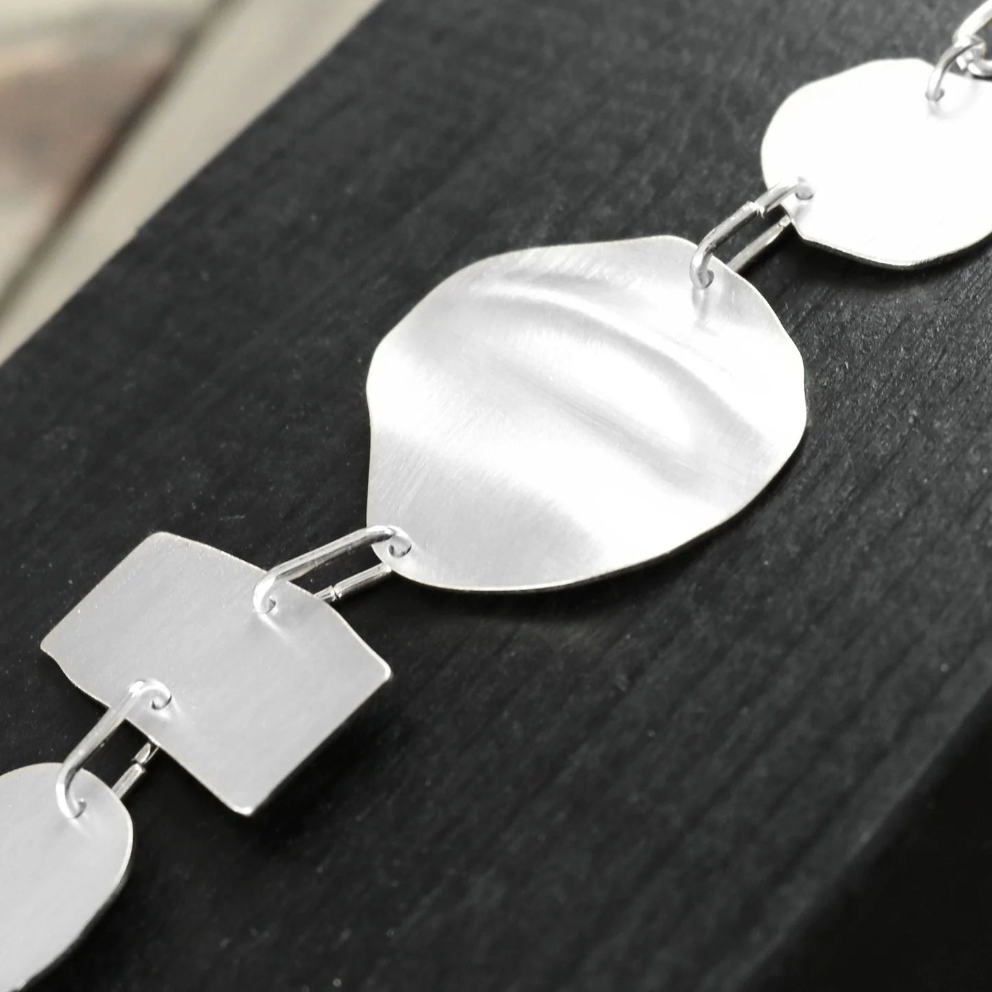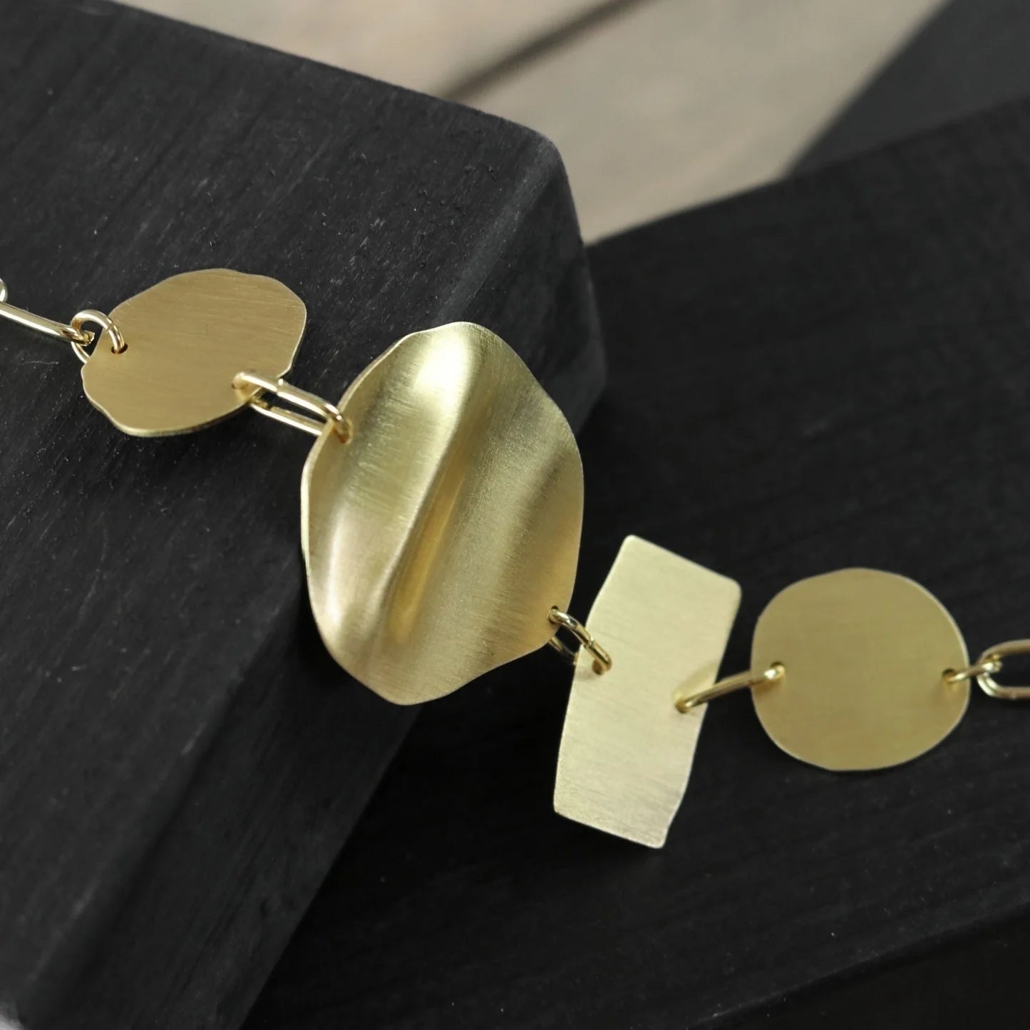 Modisches Armband aus matt versilbertem oder matt vergoldeten Messing. Mit Anhängern in unterschiedlichen Formen gearbeitet. Variabel in der Länge einstellbar.