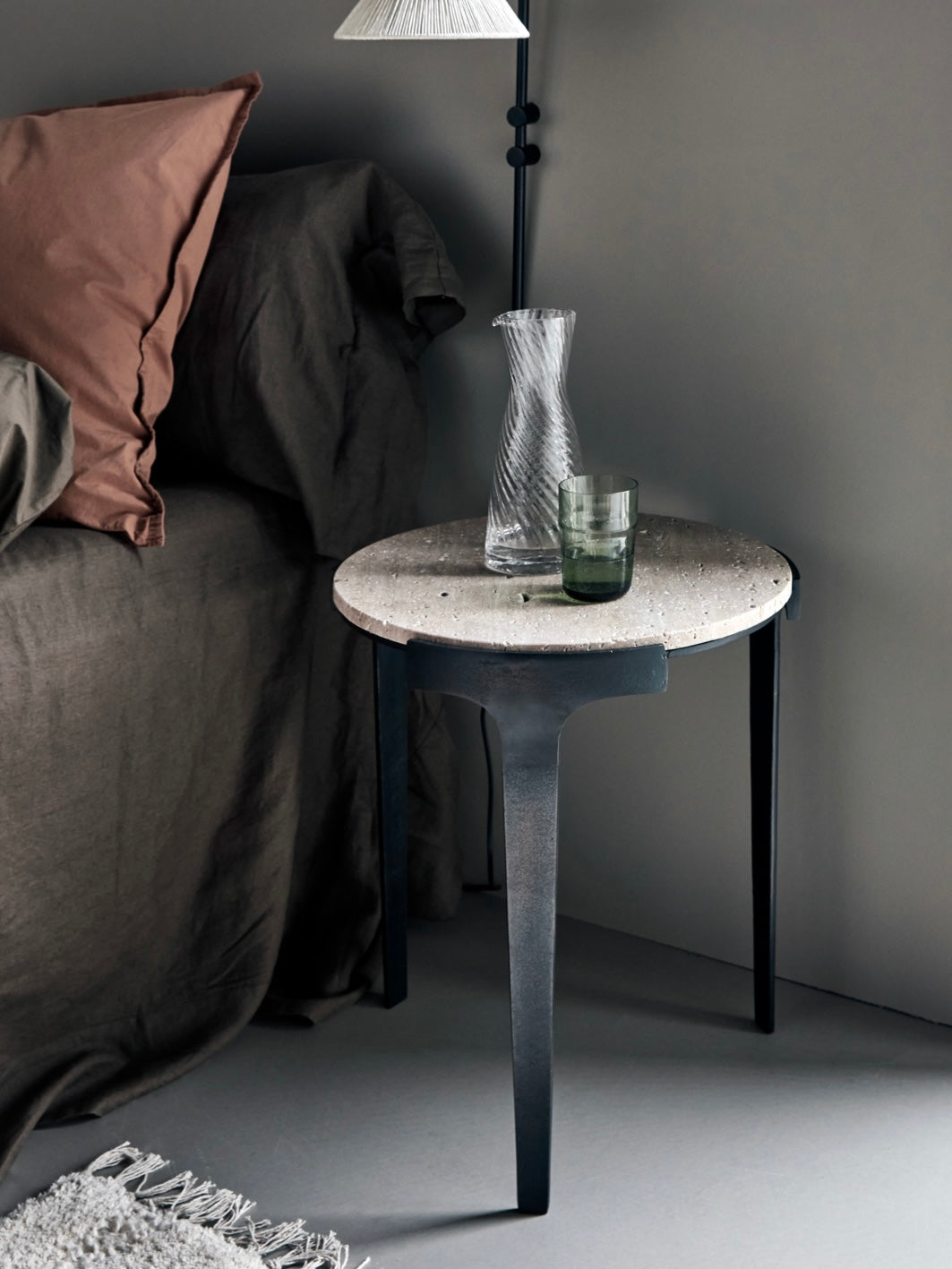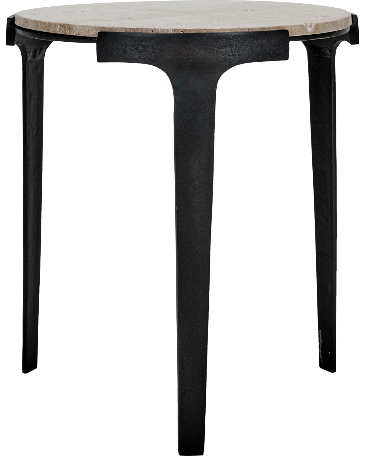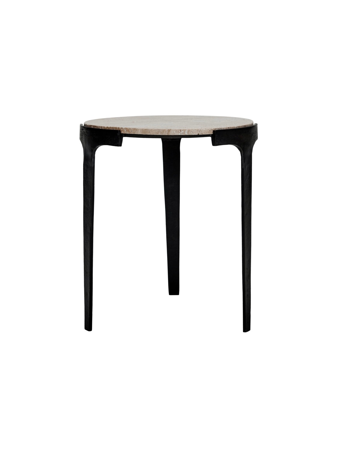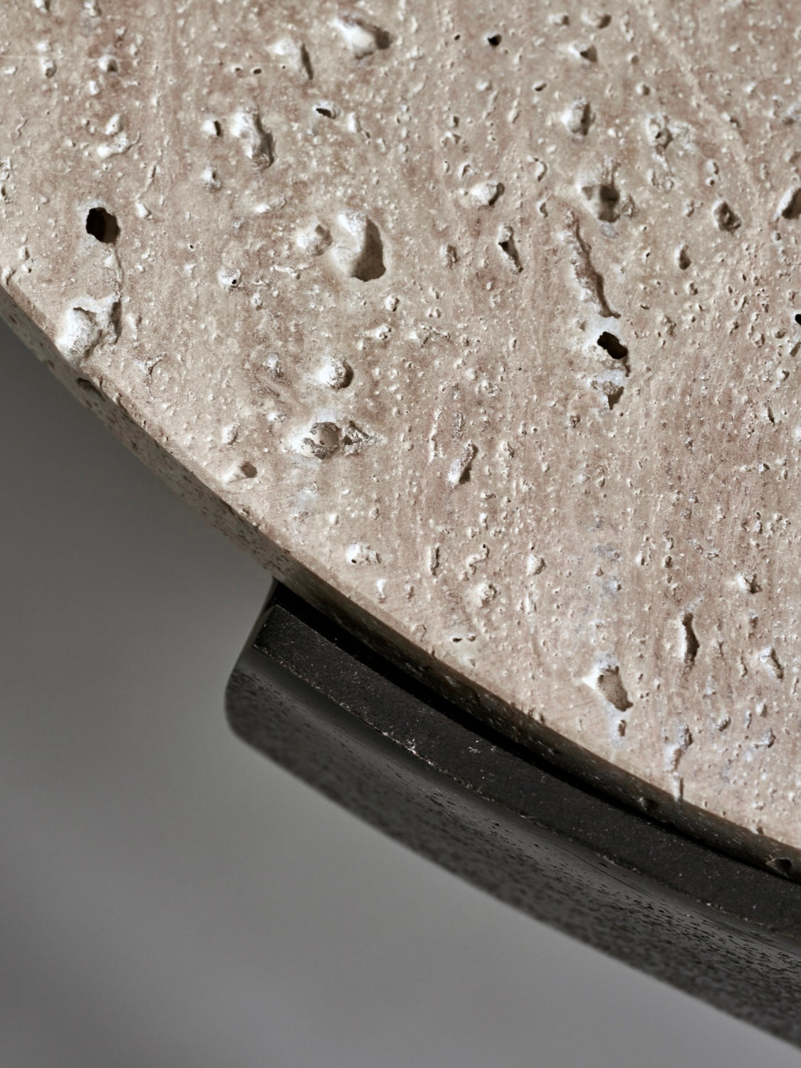Verleihe deinem Zuhause mit diesem exquisiten Beistelltisch eine Note von Eleganz. Handgefertigt mit einer beigegrauen Travertin-Tischplatte und gestützt von schlanken, schwarzen Aluminiumbeinen, ist er ein eleganter Blickfang in jedem Raum. Jedes Tisch ist einzigartig, da die natürlichen Variationen im Travertin sicherstellen, dass keine zwei Tische genau gleich sind.