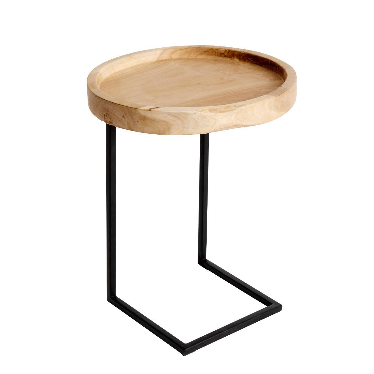 Schlichter Beistelltisch aus recyceltem Teakholz mit runder Tischplatte. Das eckige Gestell ist aus Eisen. Die Tischplatte ist eingelassen und hat dadurch eine praktische Holzumrandung. Jedes Teil ein Unikat.