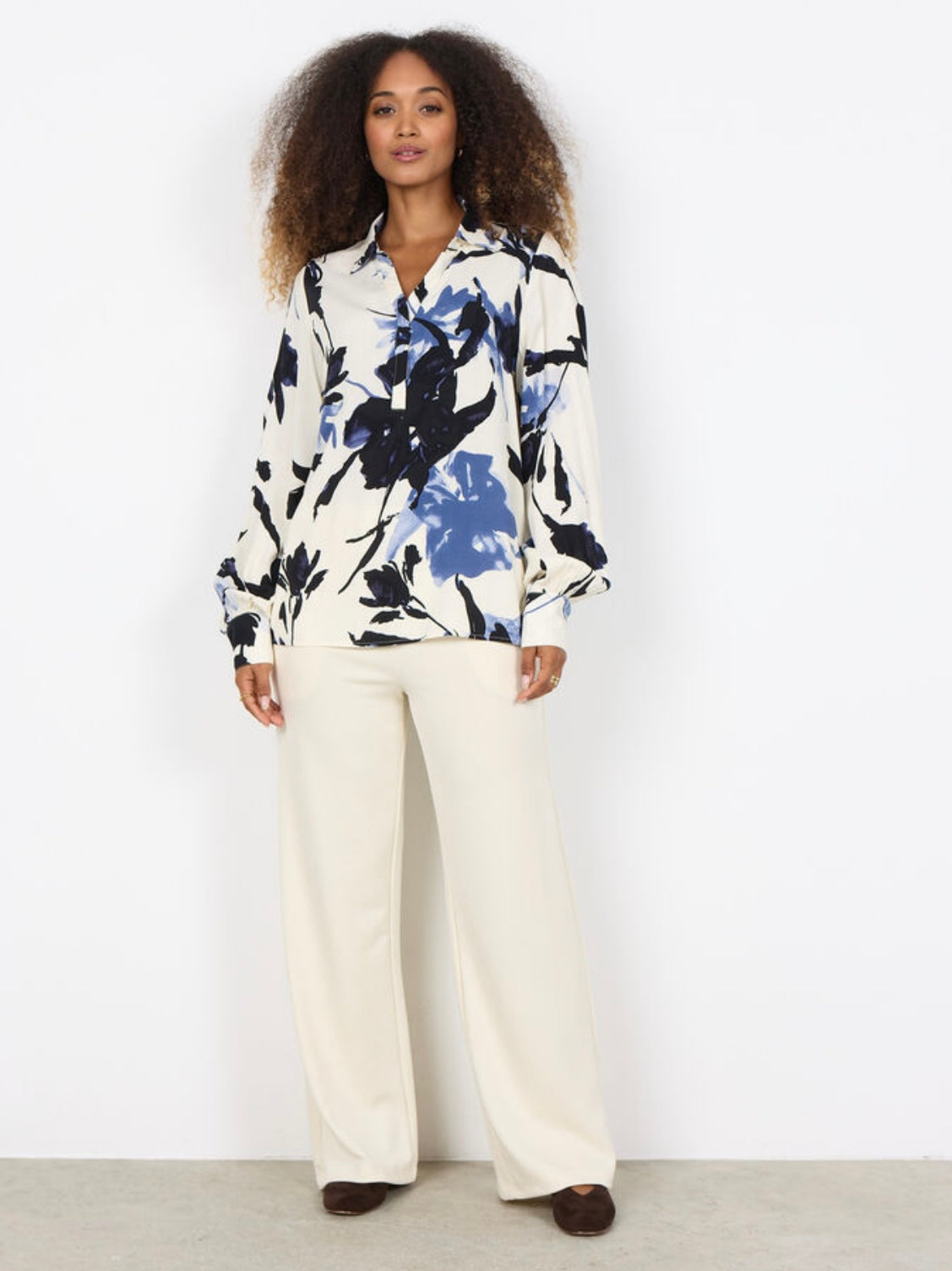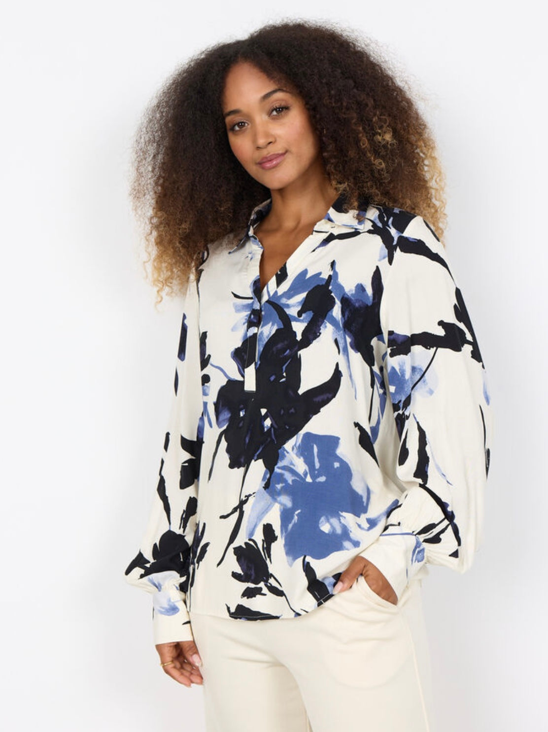 Feminines Blusenshirt mit einem aufwändigen Floralmuster. Lange Ärmel mit Manschetten, abgerundeter Saum, Hemdkragen mit V-Ausschnitt und kurzer angedeuteter verdeckter Knopfleiste. Aus einer soften Viskosequalität gefertigt.