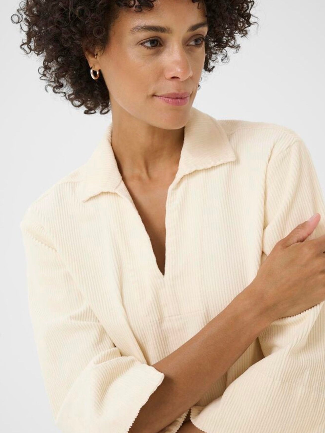 Sportives Etuikleid aus einem sehr soften und feinen Cordstretch. Schlichtes Design mit V-Ausschnitt und Hemdkragen, leicht überschnittenen Schultern und weiten 3/4 Ärmeln. Ohne Futter gearbeitet.