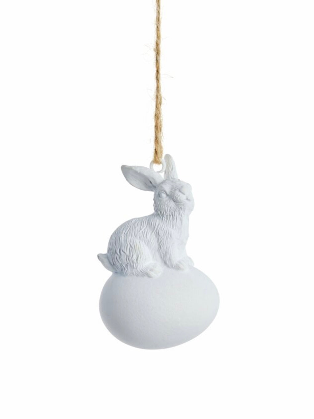 Niedlicher Deko Osteranhänger mit einem Osterhasen, der auf einem Ei sitzt. Mit einem rustikalen Naturband zum Aufhängen.