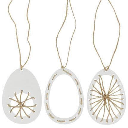 Geschmackvolles Deko Osterei in skandinavischem Design, aus Metall mit kunstvollen Schnürungen aus Jutebändchen gefertigt. Mit rustikalen Jutebändern zum Aufhängen.