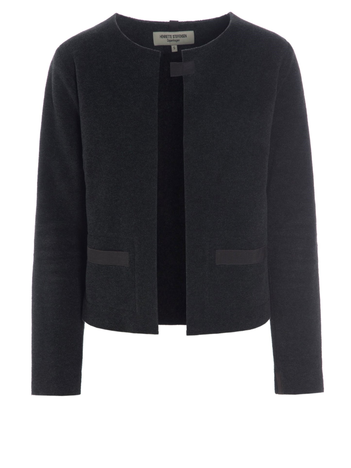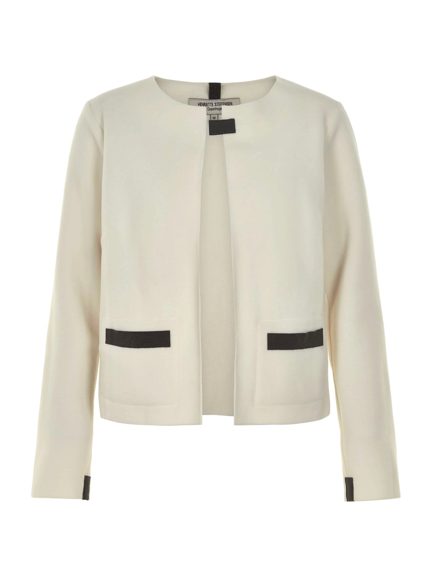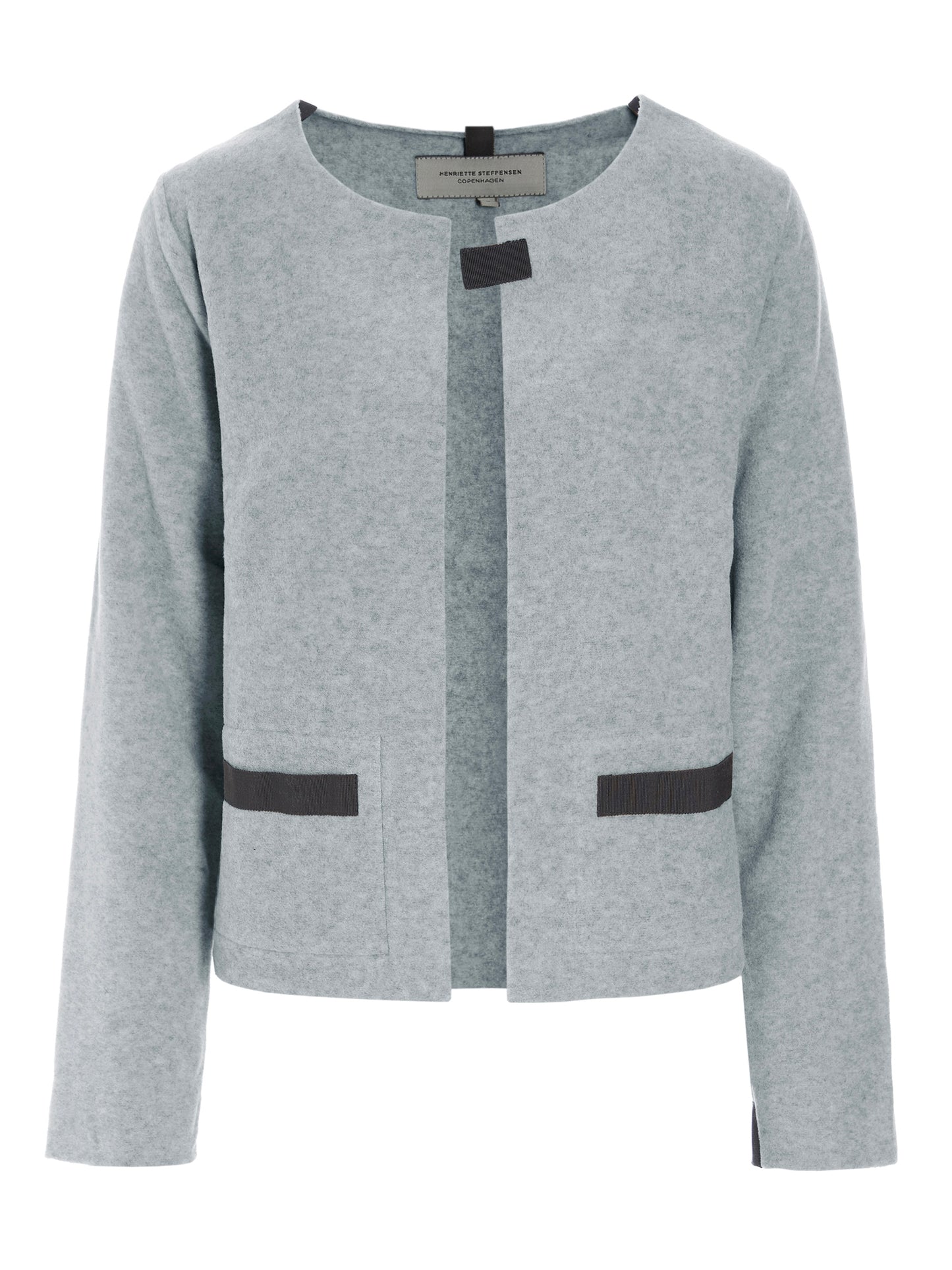 Kurze kastige Fleecejacke mit Rundhalsausschnitt im sportlich eleganten Design. Mit schwarzen Ripsbändern verziert.