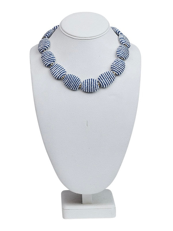 Dekorative Halskette aus aneinandergereihten gestreiften Ornamenten. Die Länge ist verstellbar. Die Metallverbindungen sind silberfarben.