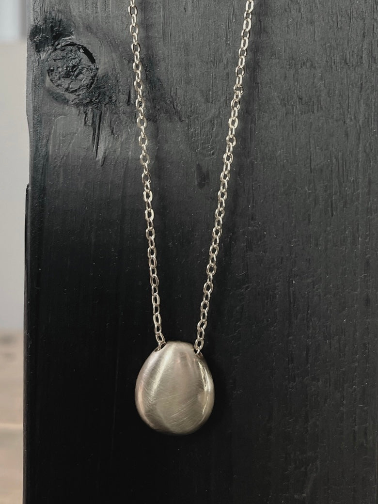 Effektvolle Halskette in schlichter Form, aufwändig mit einem Anhänger mit einer organisch geformten Kugel mit matt gebürsteter Oberfläche gearbeitet. Die Kette lässt sich in der Länge variabel einstellen. Dadurch passt sie zu vielen Halsausschnitten und Outfits.