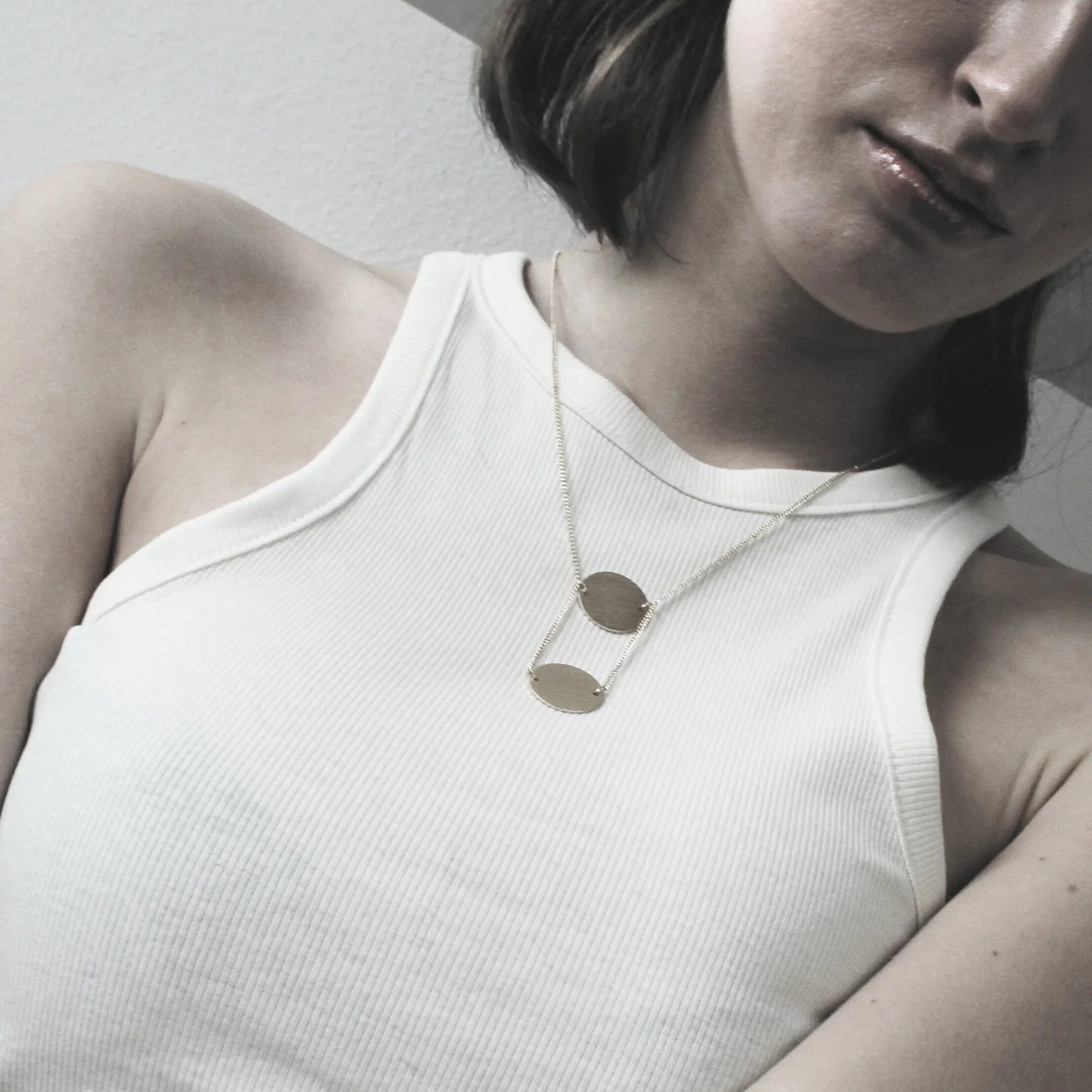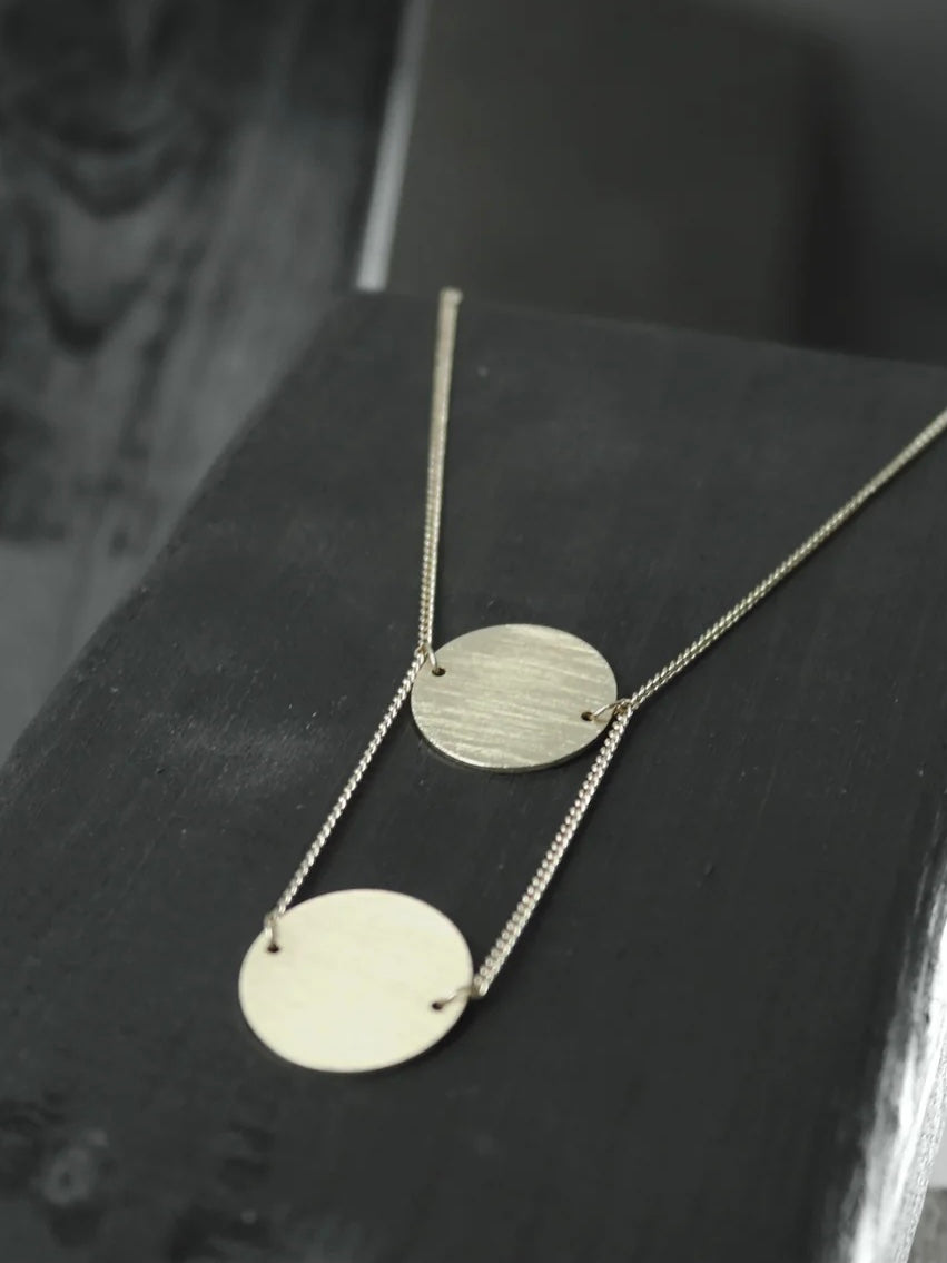 Effektvolle Halskette mit 2 matt vergoldeten oder versilberten Anhängern mit gebürsteter Oberfläche. Variabel in der Länge einstellbar.