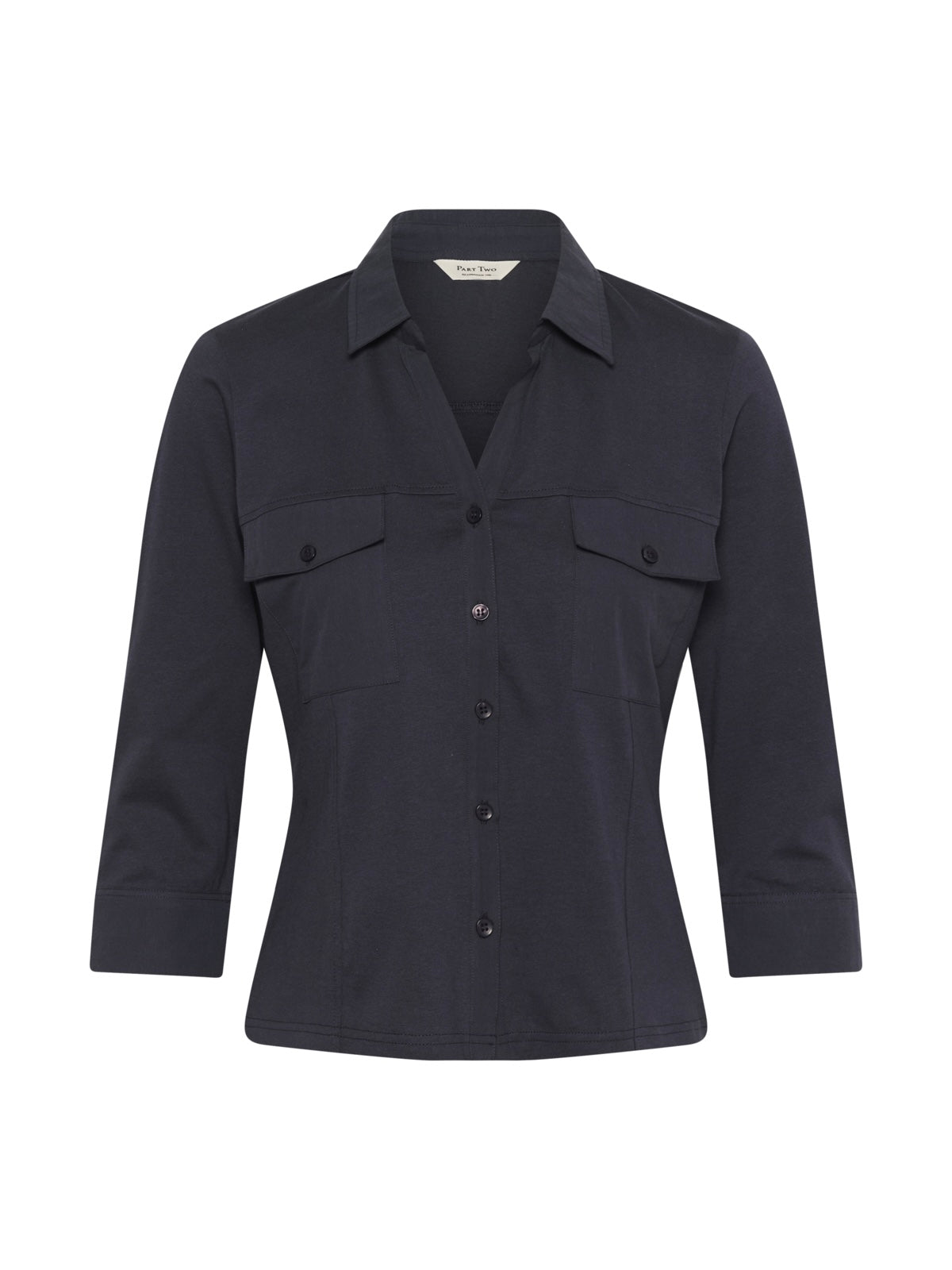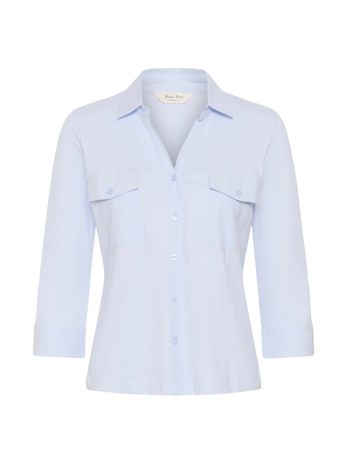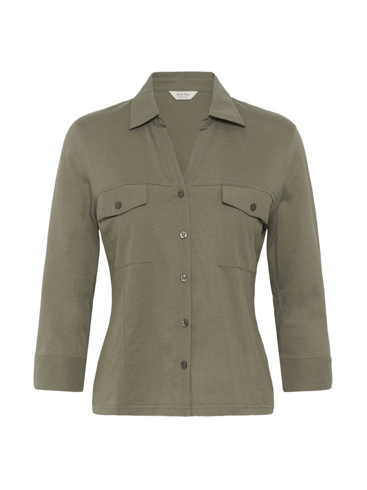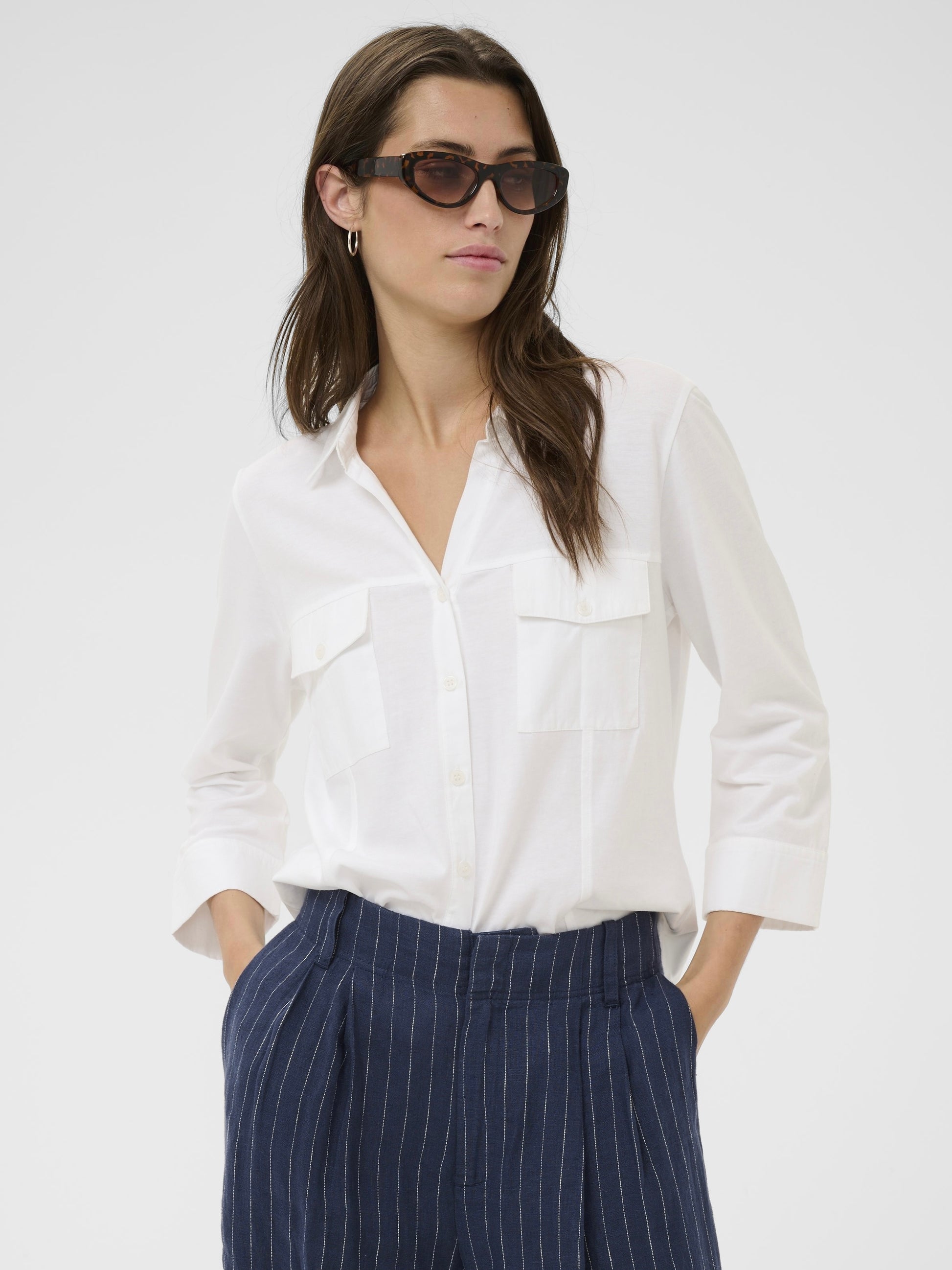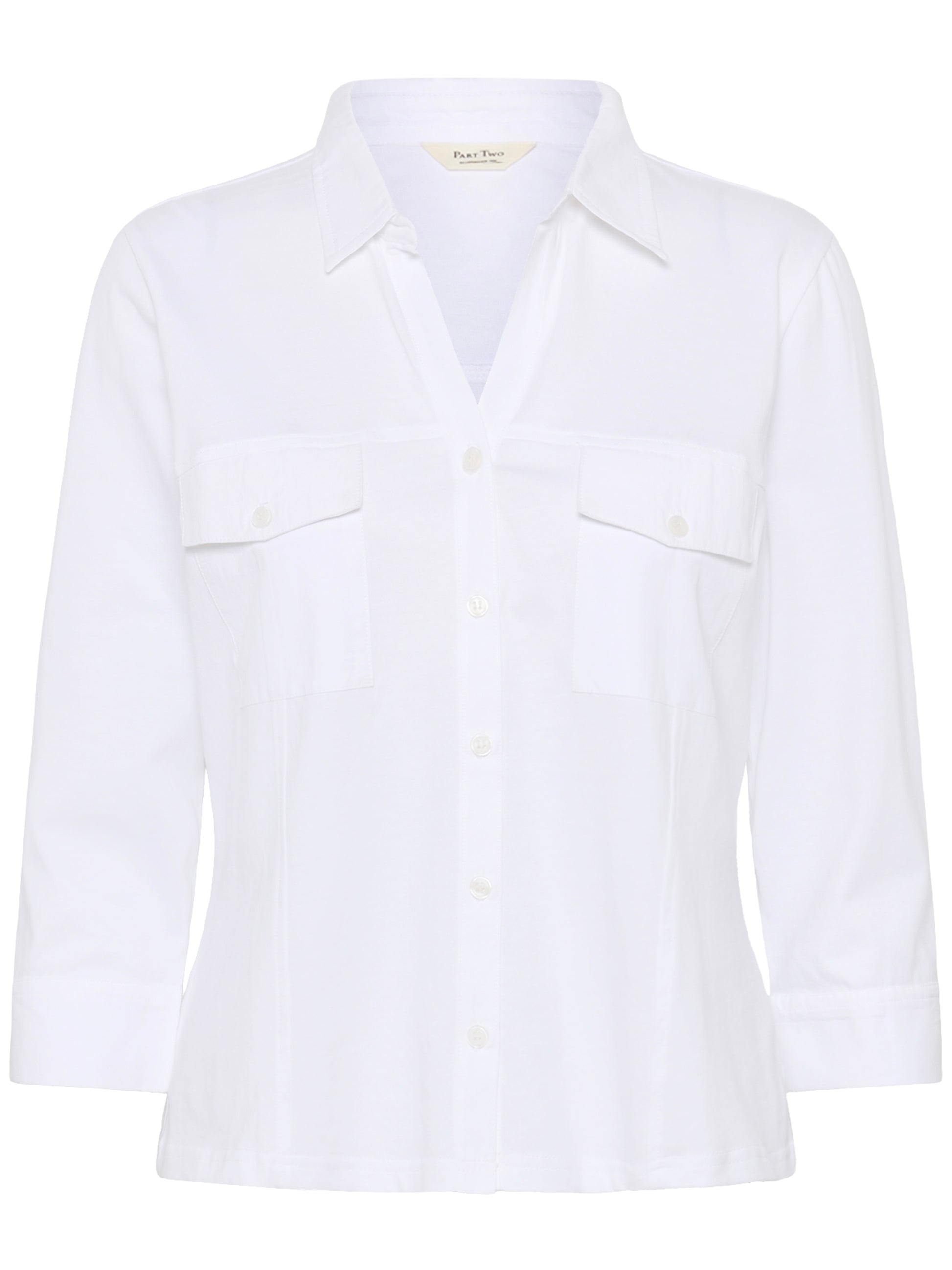 Sportive Hemdbluse mit geöffnetem V-Ausschnitt aus reiner organischer Baumwolle. Weite 3/4 Ärmel mit extra breitem, offenem Abschluss. 2 Pattentaschen vorn. Leicht taillierte Form.