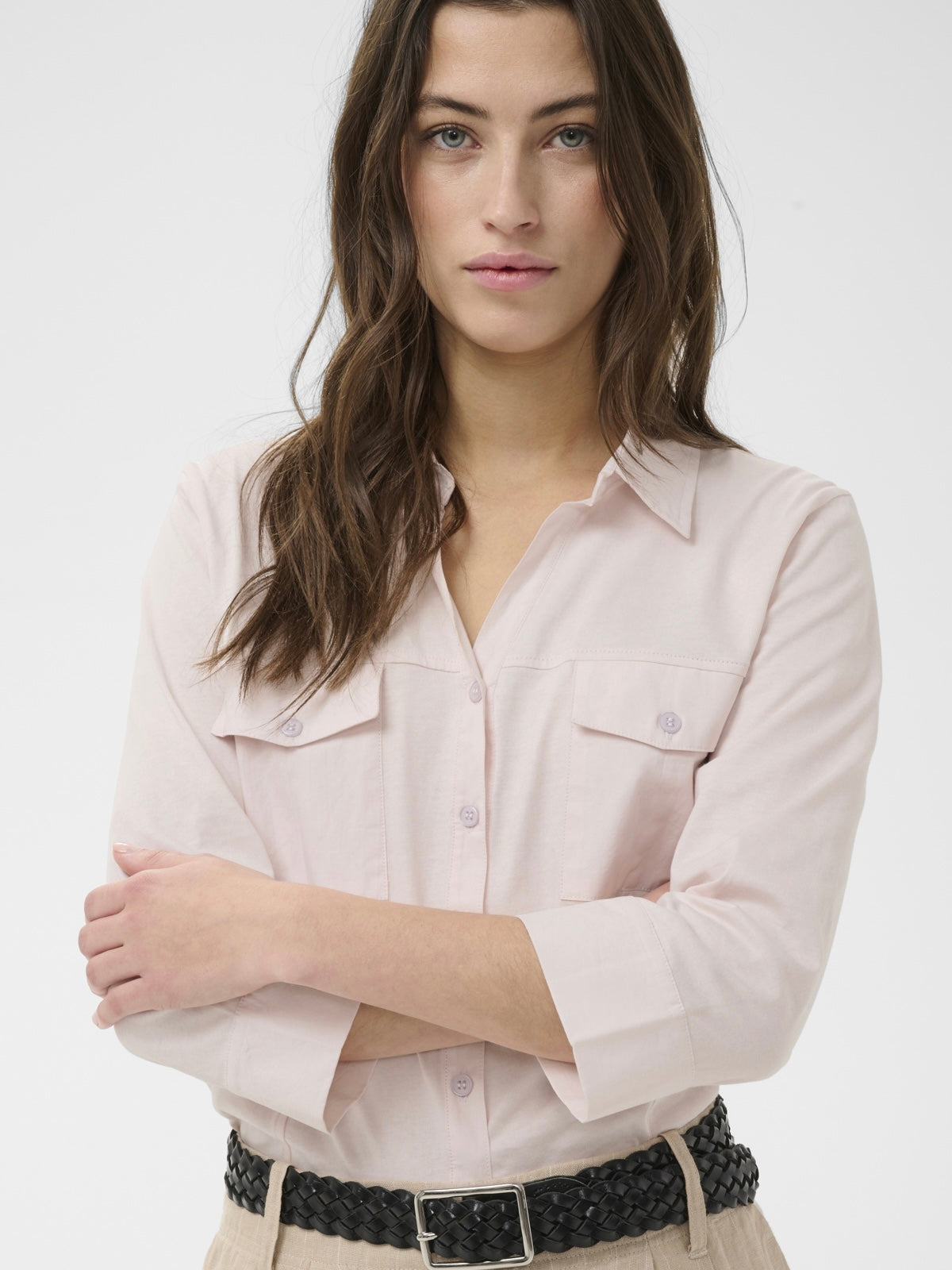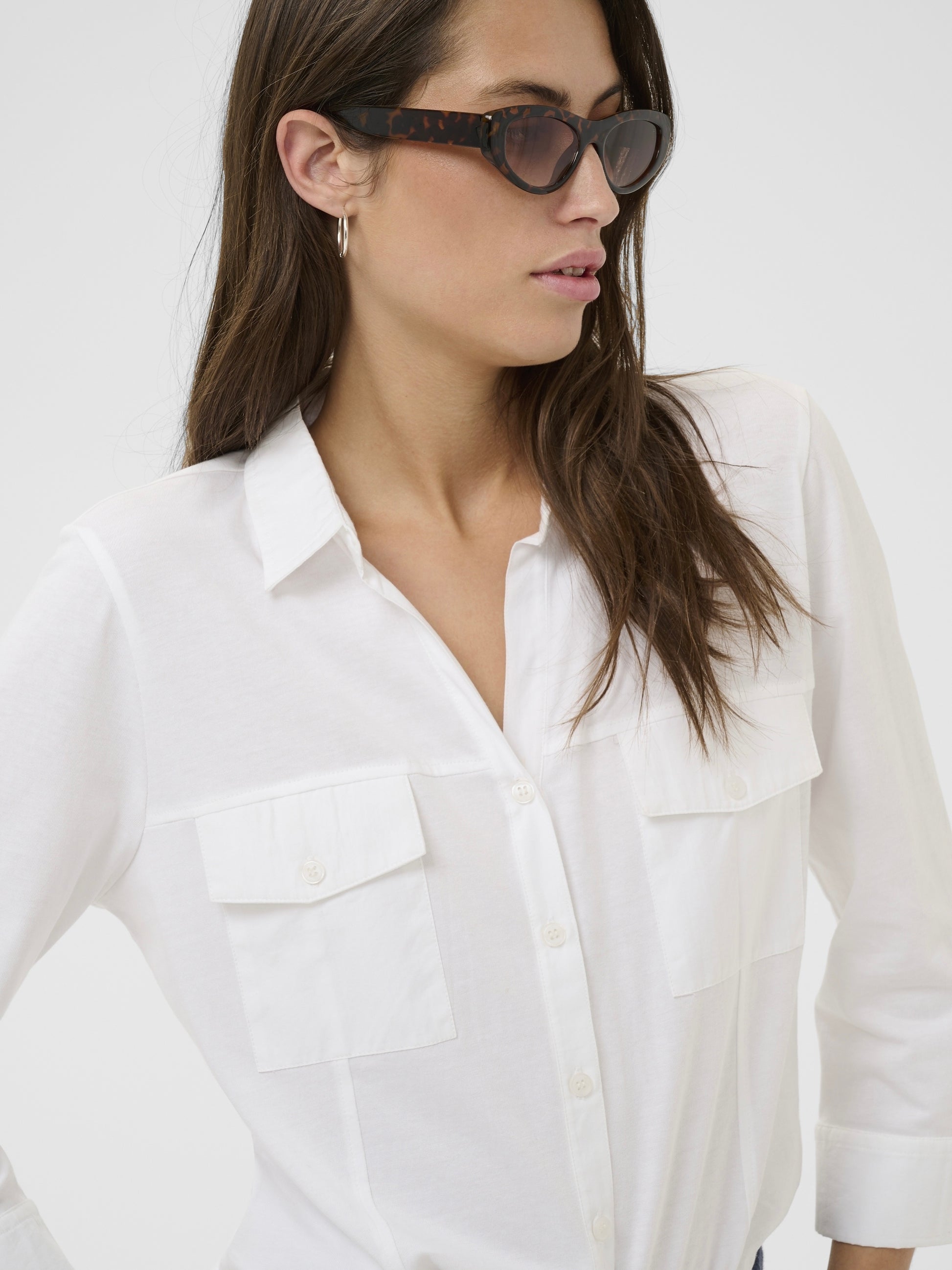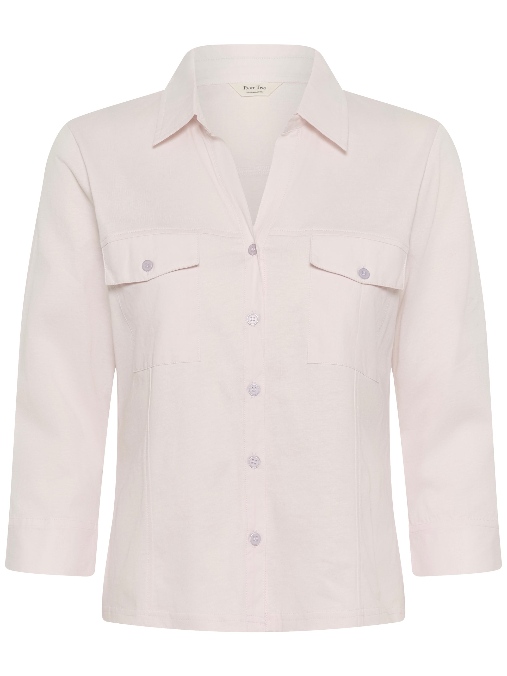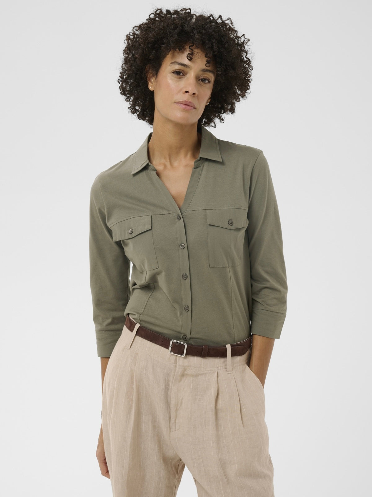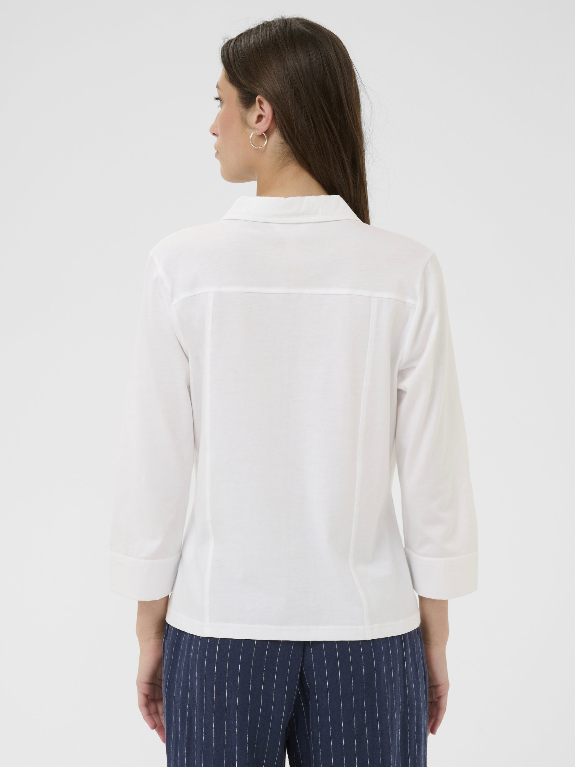 Sportive Hemdbluse mit geöffnetem V-Ausschnitt aus reiner organischer Baumwolle. Weite 3/4 Ärmel mit extra breitem, offenem Abschluss. 2 Pattentaschen vorn. Leicht taillierte Form.