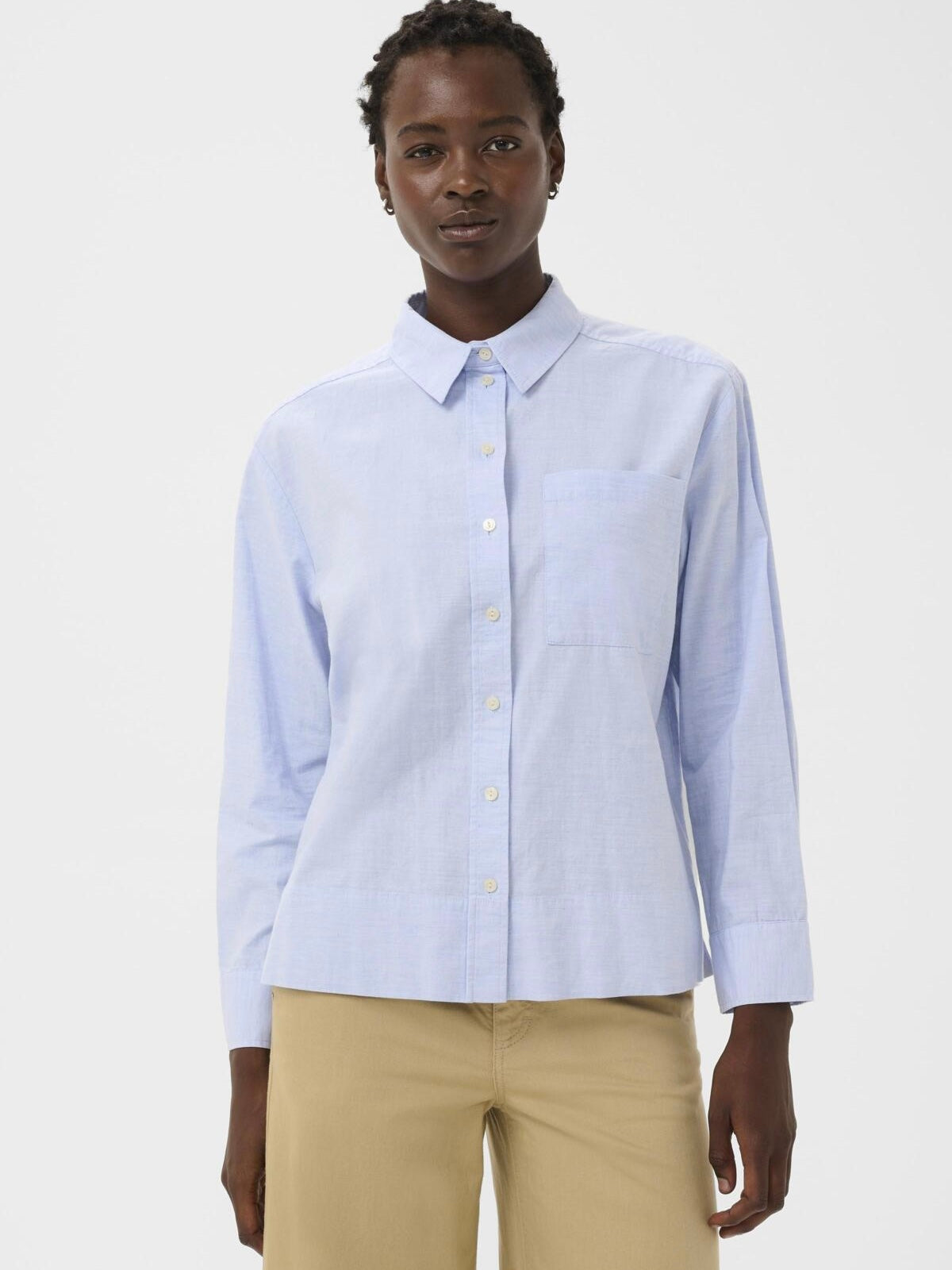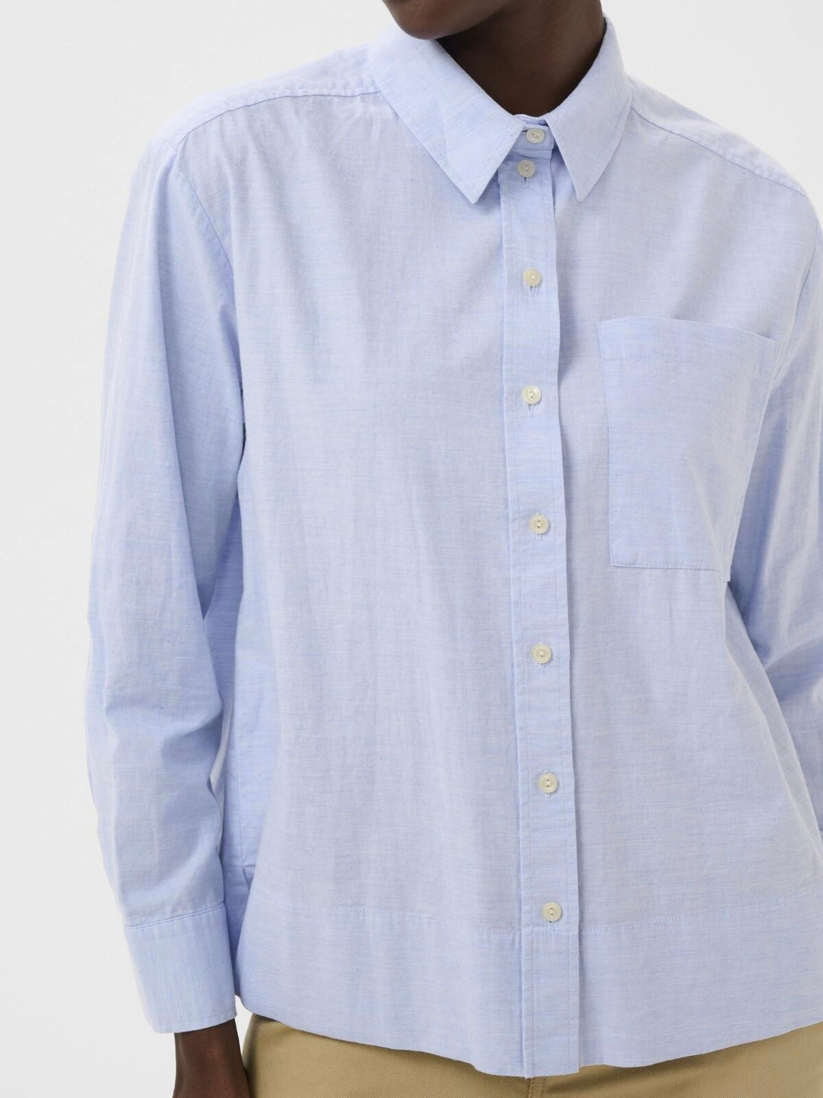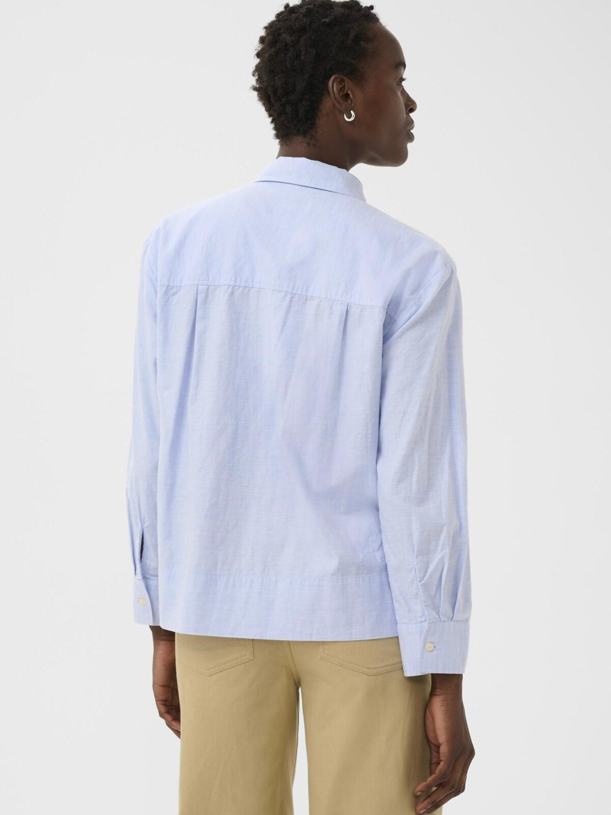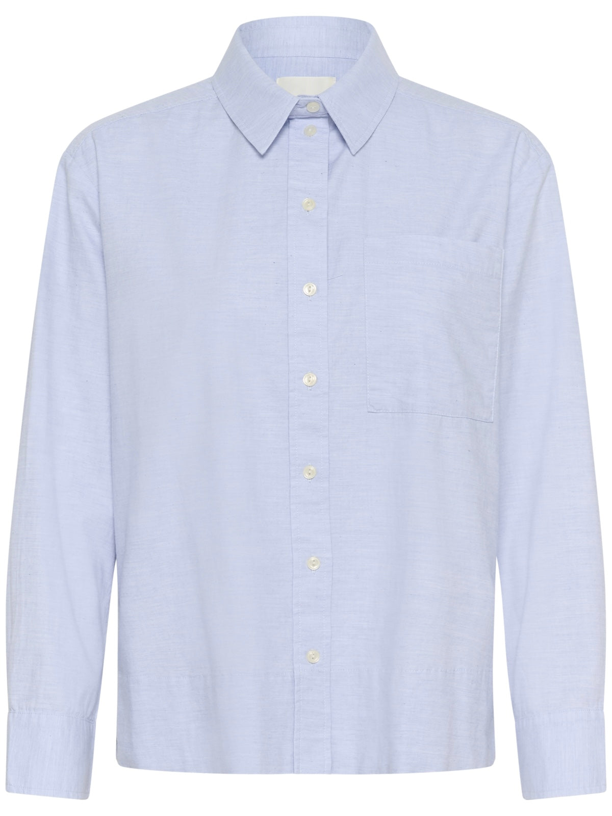 Kurze, leicht kastige Hemdbluse mit breitem Saum aus einer sommerlichen Chambray Qualität. Dank seiner speziellen Webung mit verschiedenfarbigem Garn erhält der Chambray Stoff eine Jeans-ähnliche Optik.