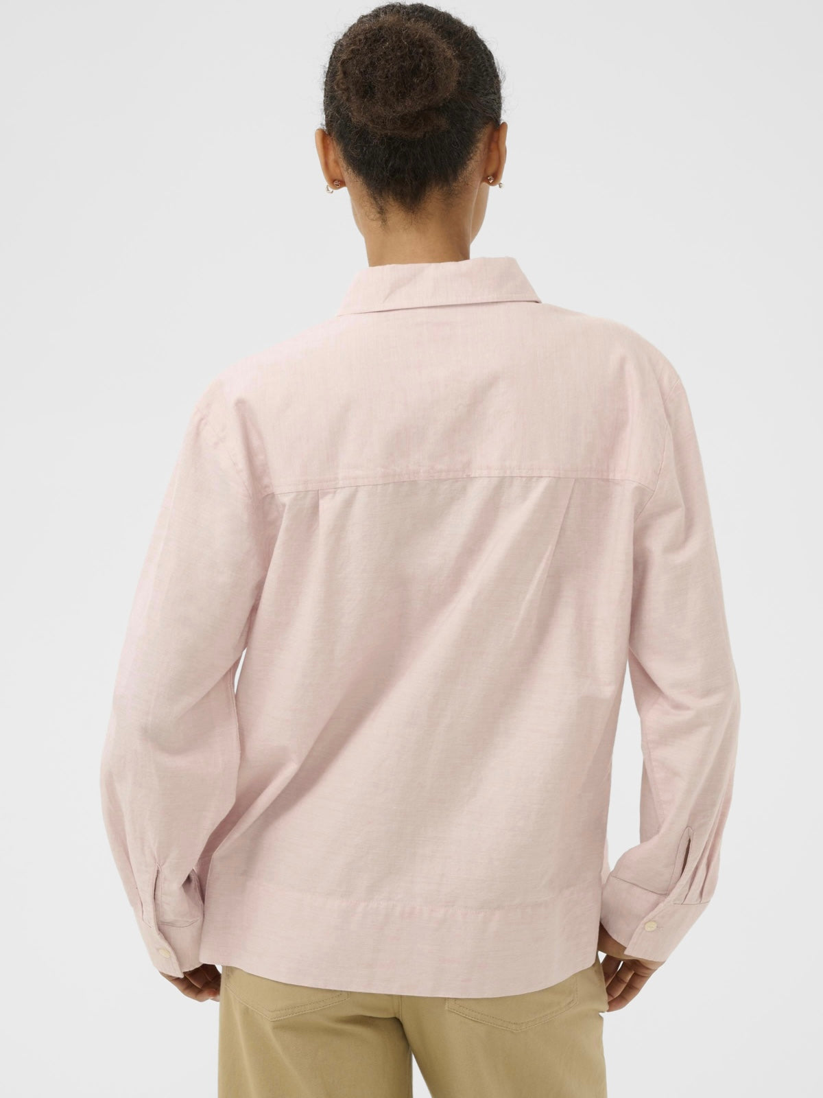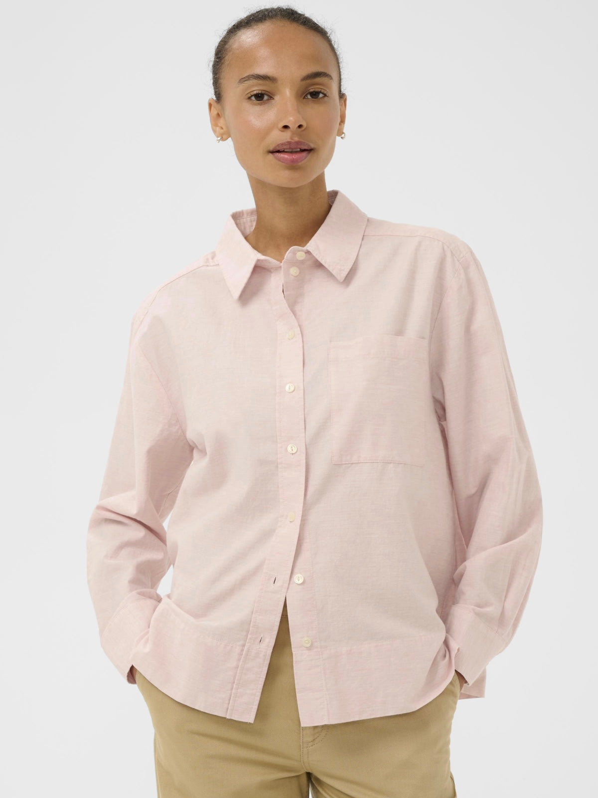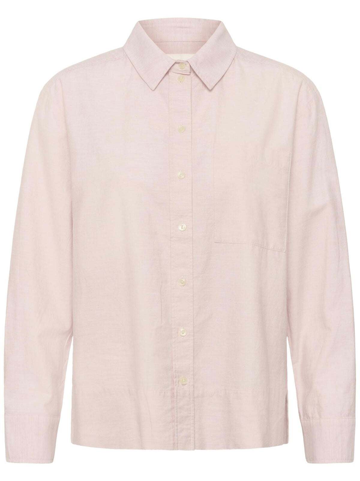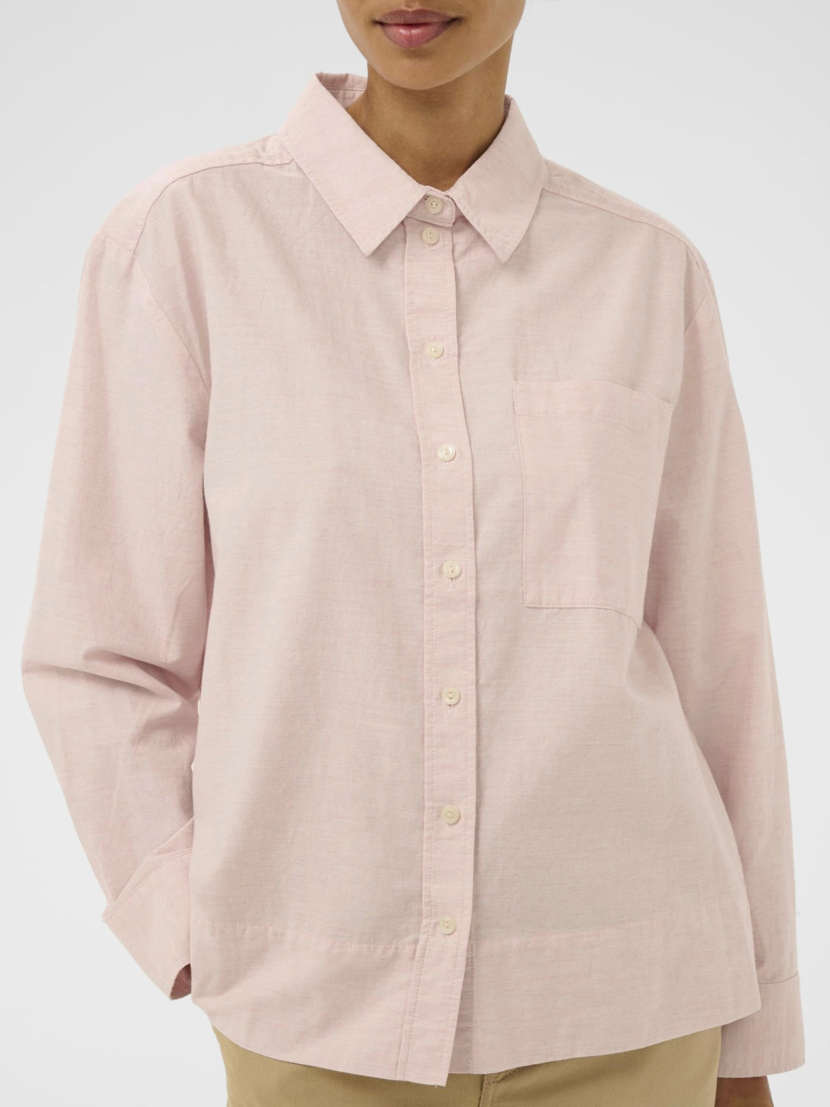 Kurze, leicht kastige Hemdbluse mit breitem Saum aus einer sommerlichen Chambray Qualität. Dank seiner speziellen Webung mit verschiedenfarbigem Garn erhält der Chambray Stoff eine Jeans-ähnliche Optik.