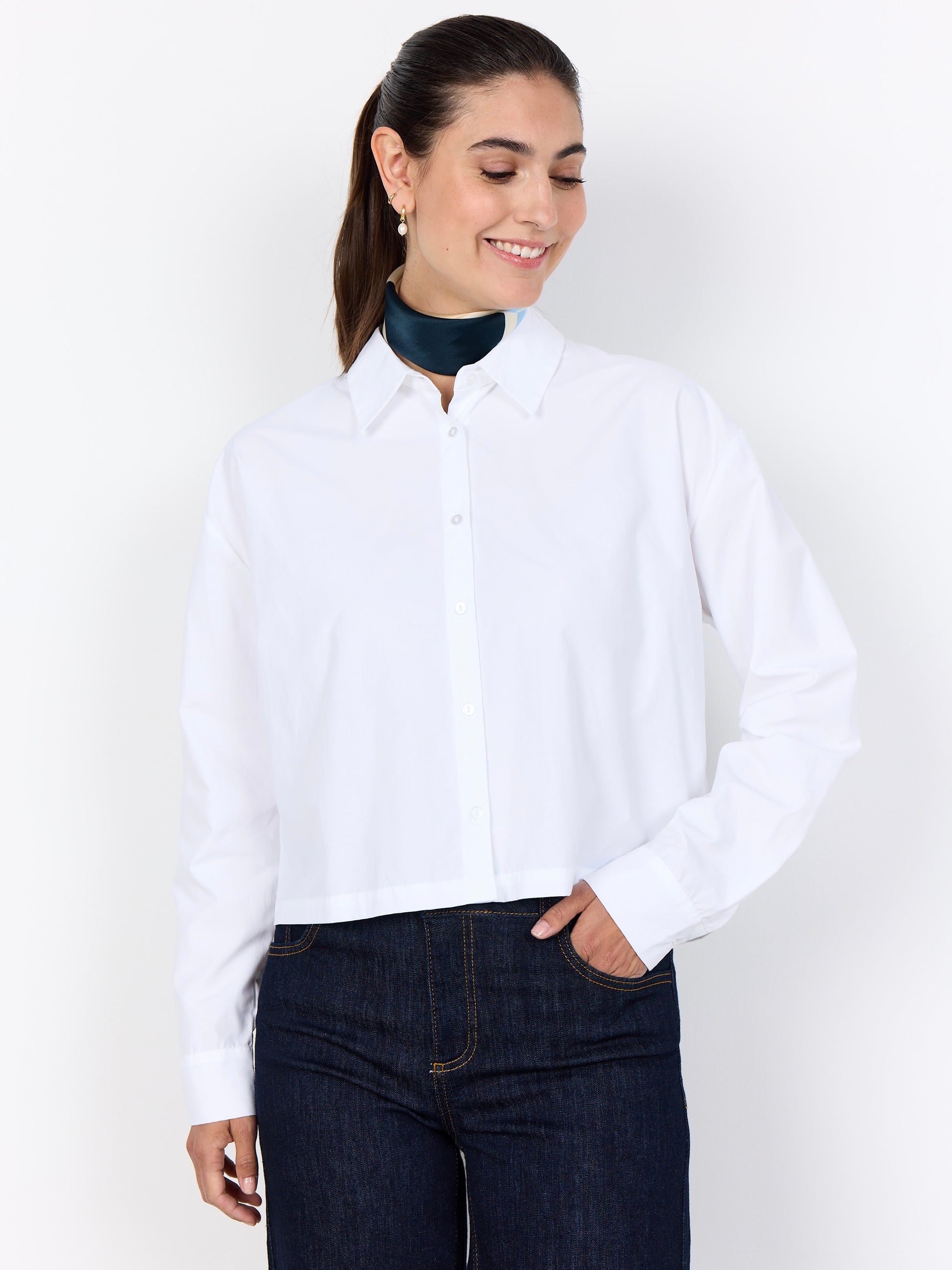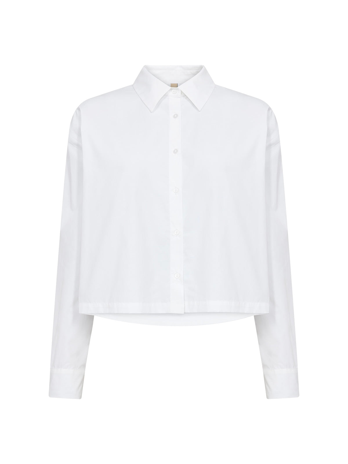 Modisch kurze Bluse mit Hemdkragen. Vorn durchgeknöpft, leicht kastige Form mit langen Ärmeln und Manschettenabschlüssen. Aus einer soften Qualität aus recyceltem Polyester und Biobaumwolle gefertigt.