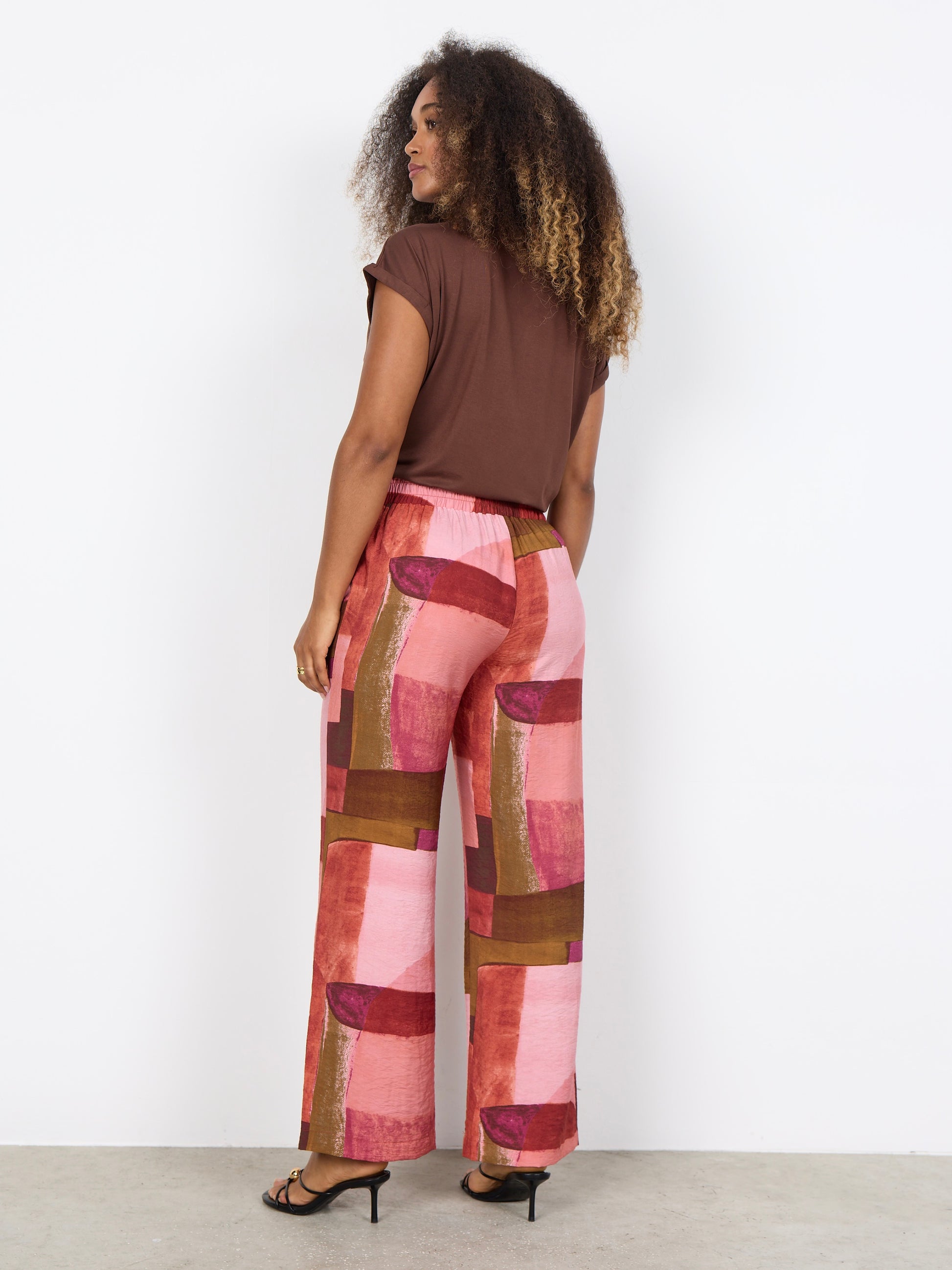 Lässige Hose im Palazzo Stil mit weiten Beinen. Fließende Viskose in einem abstraktem Fantasieprint. Seitliche Eingrifftaschen und angesetztes Bündchen mit Gummizug und Bindeband. Sowohl in der Freizeit als auch ins Büro zu tragen.