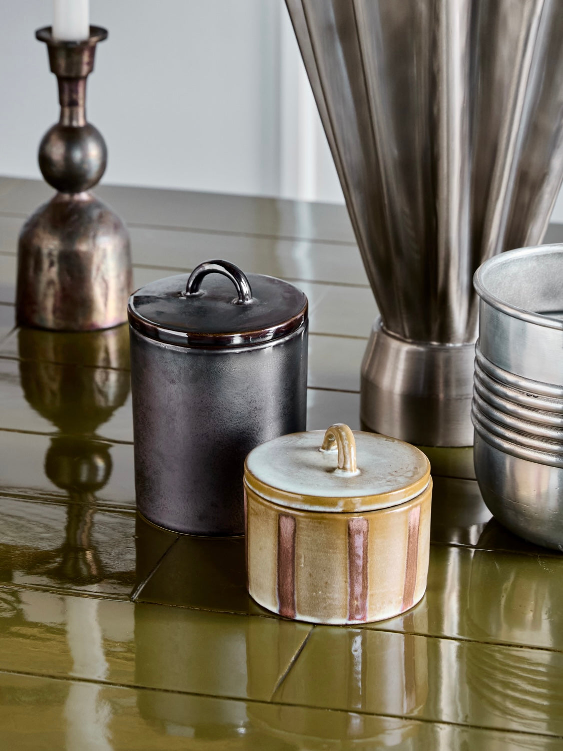 Dieses Set aus zwei handgefertigten Aufbewahrungsboxen aus edlem Steingut bringt ein Mehr an Individualität und Charme in dein Heim. Der Mix aus Sand mit braunen, handgemalten Streifen und tiefem Schwarz verleiht jedem Raum eine stilvolle Note. Jede Box ist ein Unikat und bietet dekorative und funktionale Möglichkeiten – ob im Wohnzimmer, Bad oder auf dem Nachttisch. Auch einzeln erhältlich.