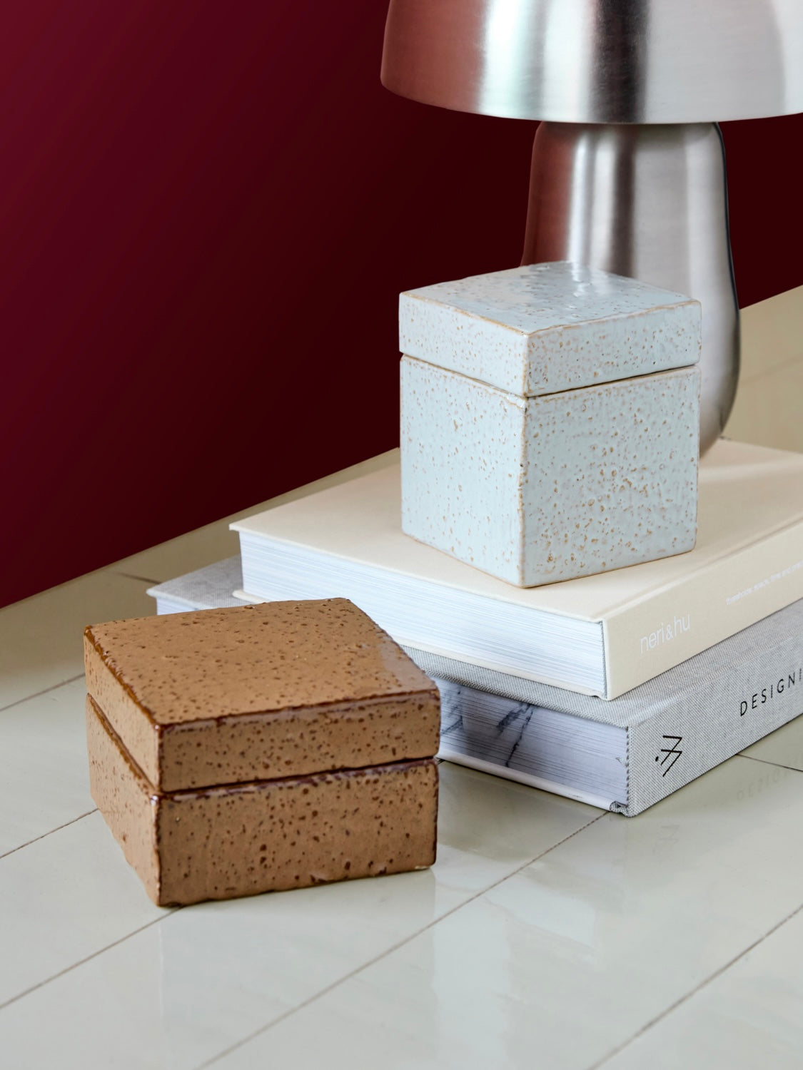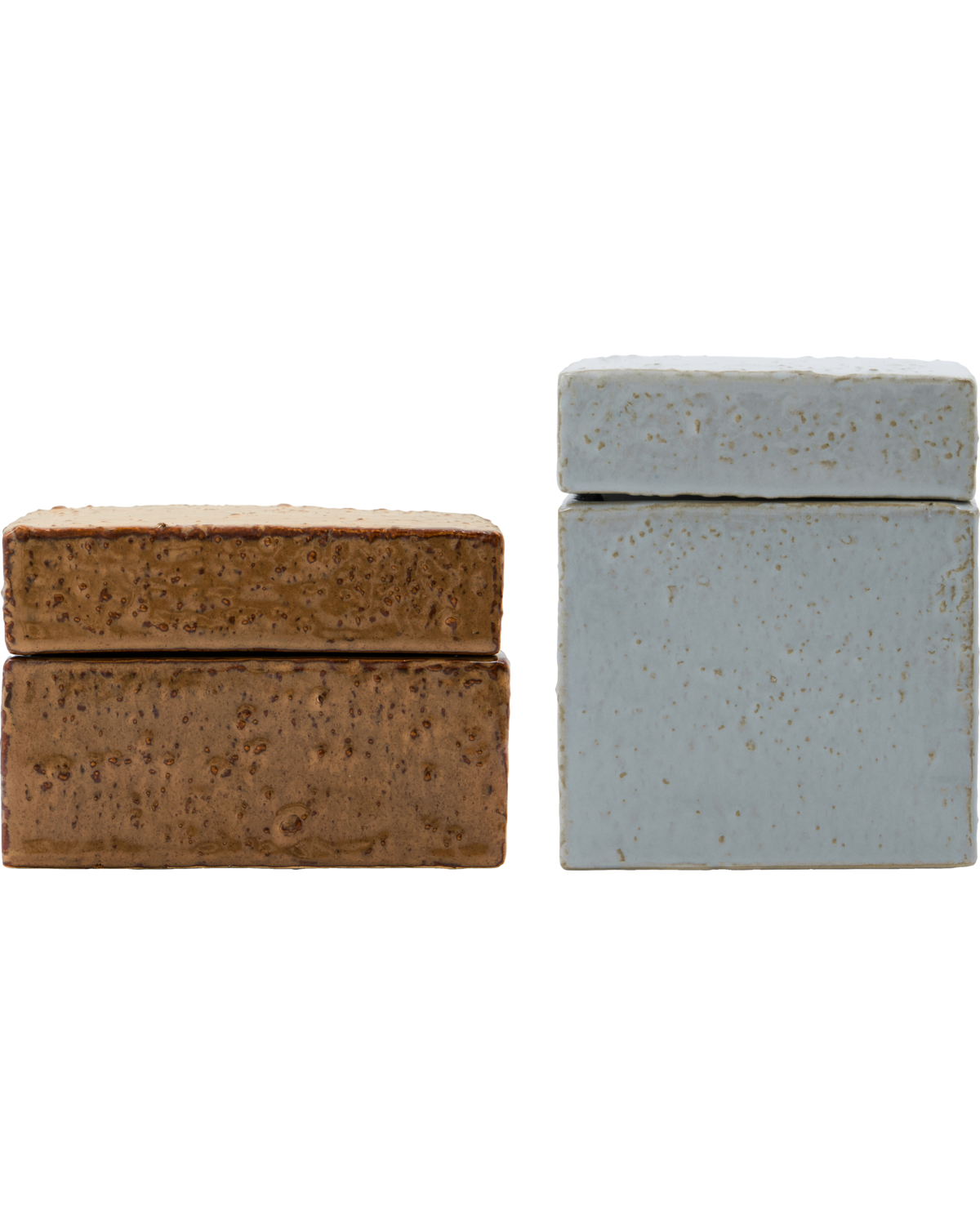Diese handgefertigten Aufbewahrungsdosen aus Steinzeug bringen mehr Farbe und Charakter in dein Heim. Das Set aus zwei Dosen in warmem Braun und sanftem Hellblau verbindet Funktionalität mit dekorativen Charme. Dank einzigartiger Glasur ist jede Dose ein Unikat und überzeugt mit stilvoller Aufbewahrung im Badezimmer, Wohnzimmer oder auf dem Nachttisch. Auch einzeln erhältlich.