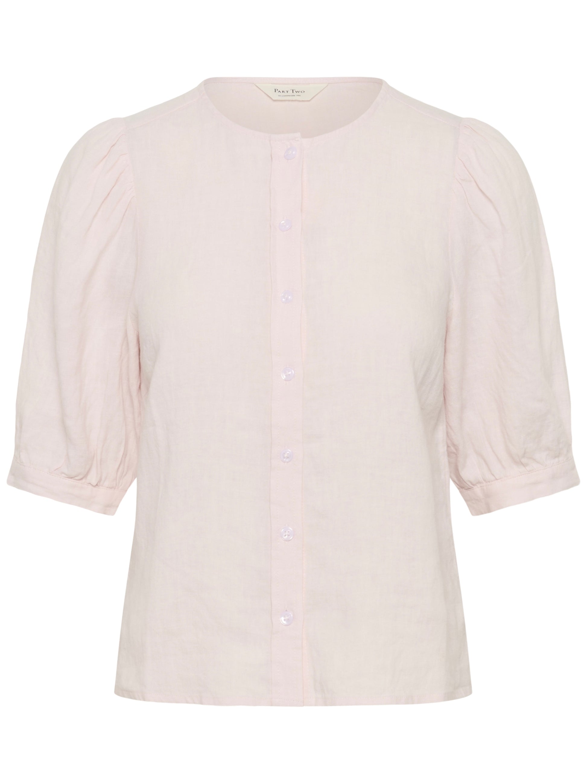 Feminine Leinenbluse mit 3/4 Ärmeln mit weiten gesmokten Ärmeln.