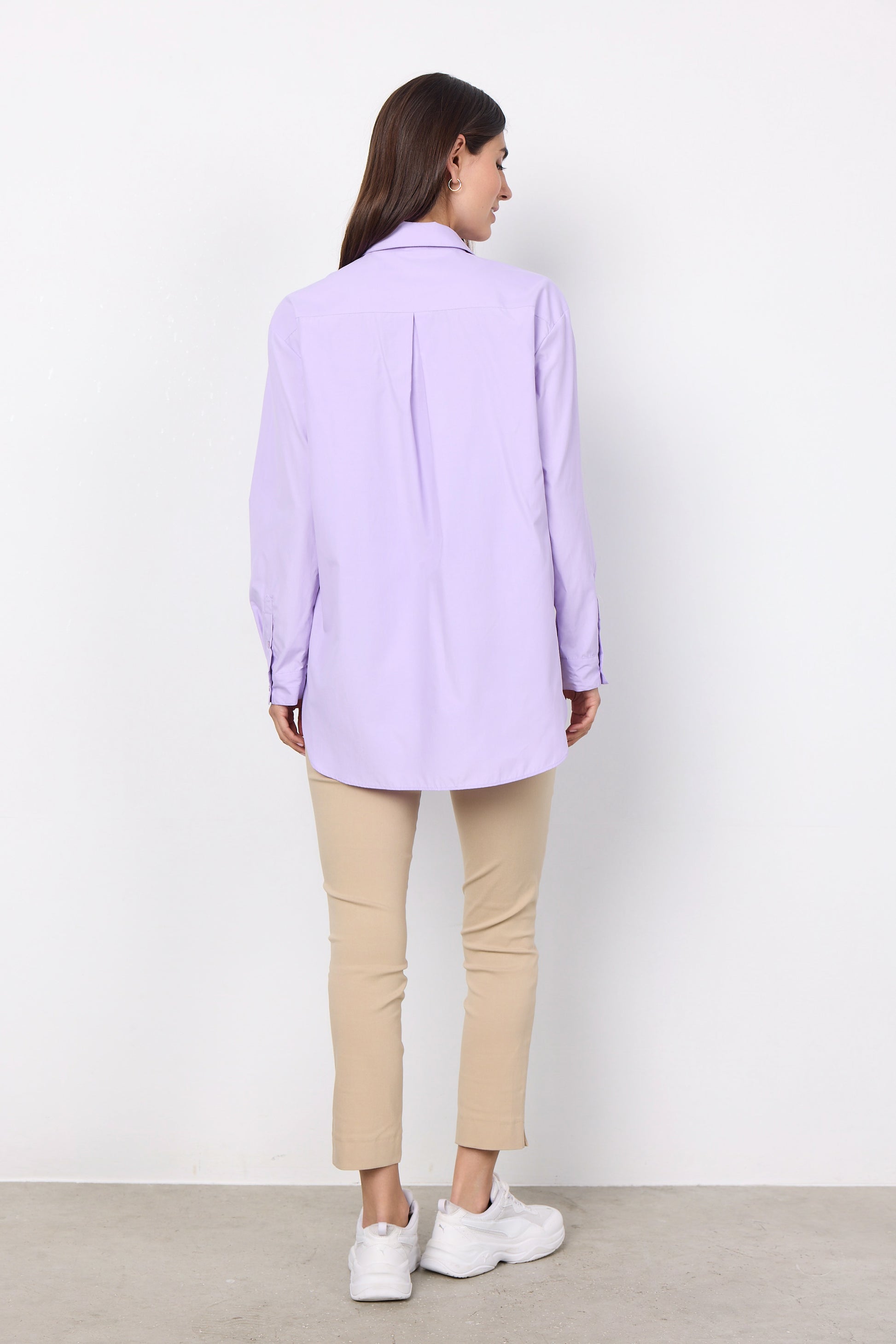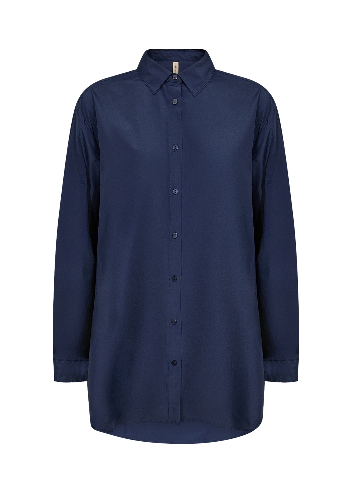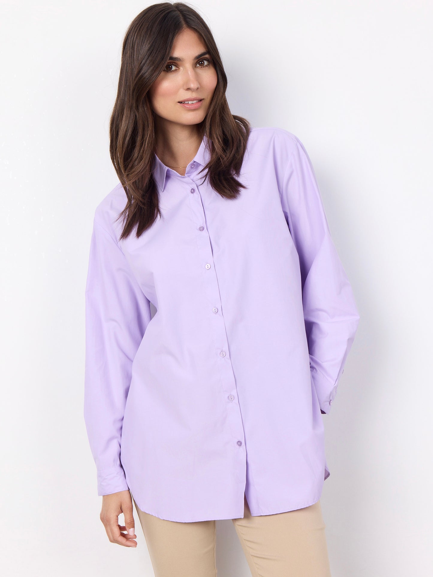Modische Longbluse mit Hemdkragen. Gerade Form mit langen Ärmeln und vorne durchgeknöpft. Hinten etwas länger als vorne gearbeitet, seitlich mit abgerundetem Saum. Aus einer soften Qualität aus recyceltem Polyester und Biobaumwolle gefertigt.