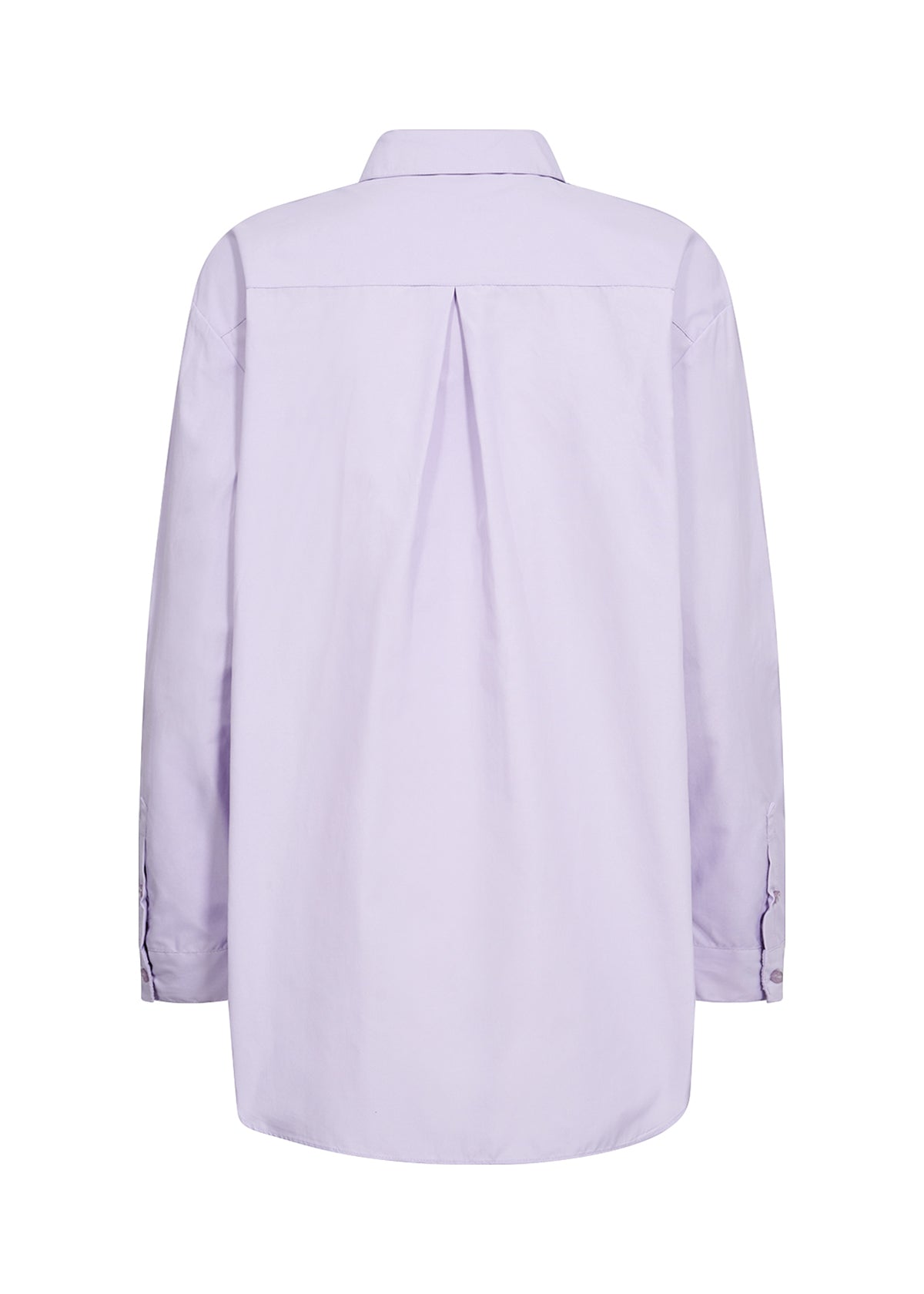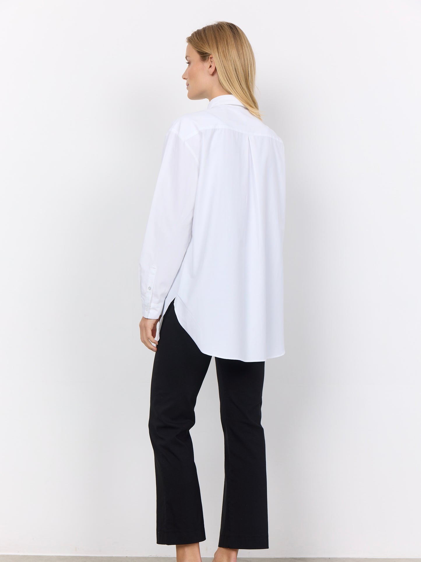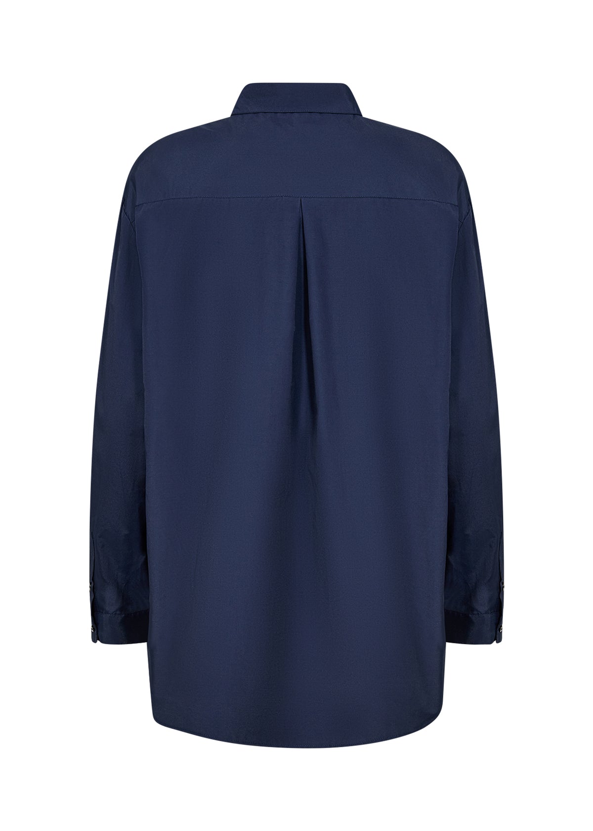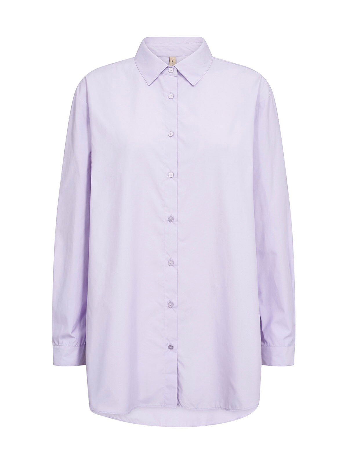 Modische Longbluse mit Hemdkragen. Gerade Form mit langen Ärmeln und vorne durchgeknöpft. Hinten etwas länger als vorne gearbeitet, seitlich mit abgerundetem Saum. Aus einer soften Qualität aus recyceltem Polyester und Biobaumwolle gefertigt.