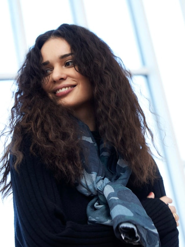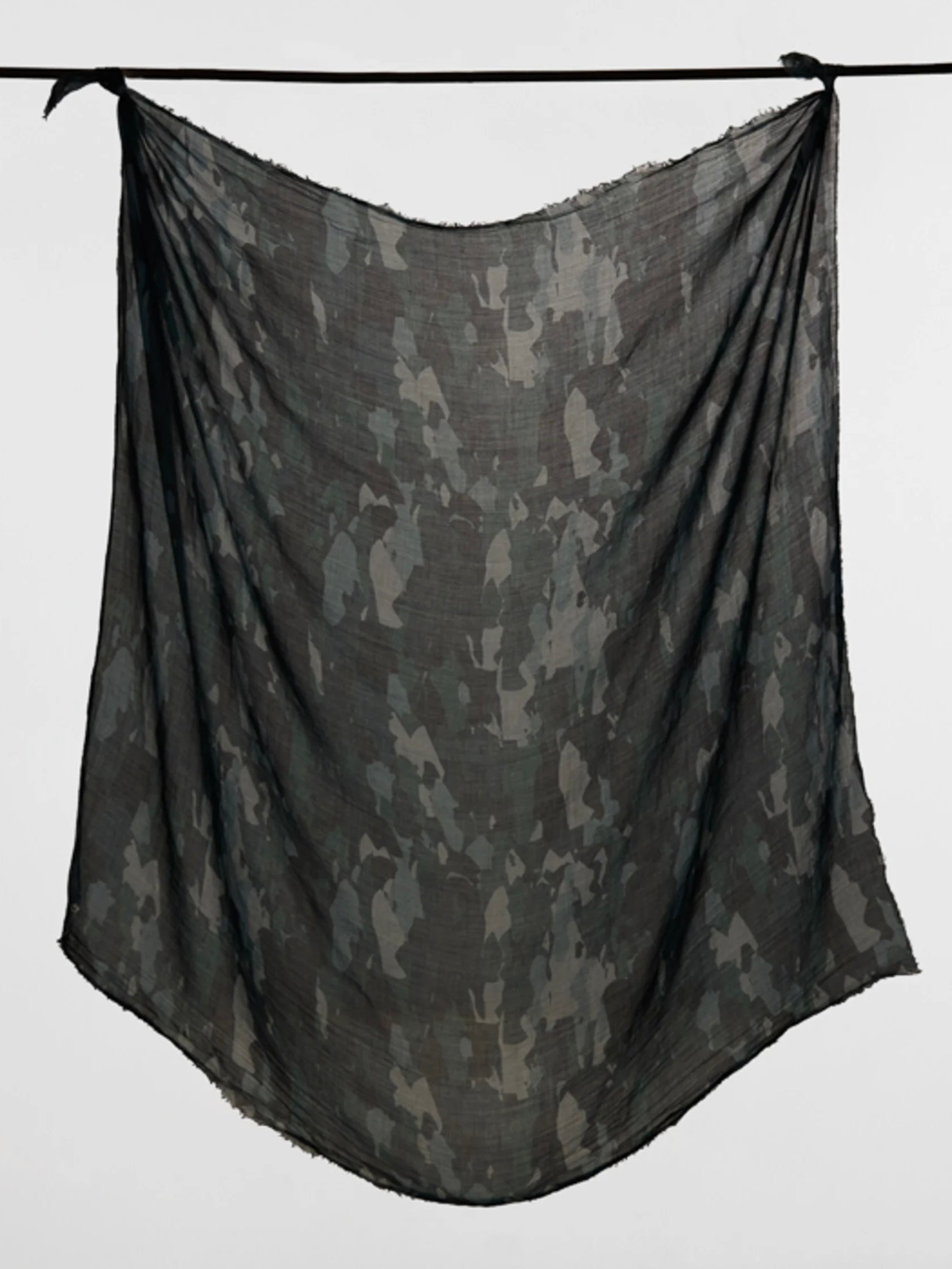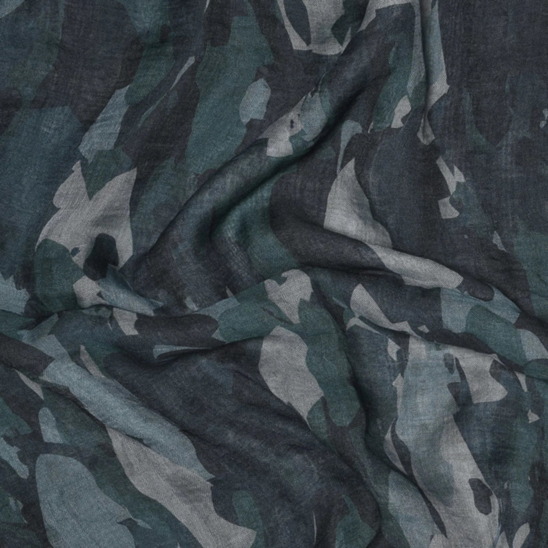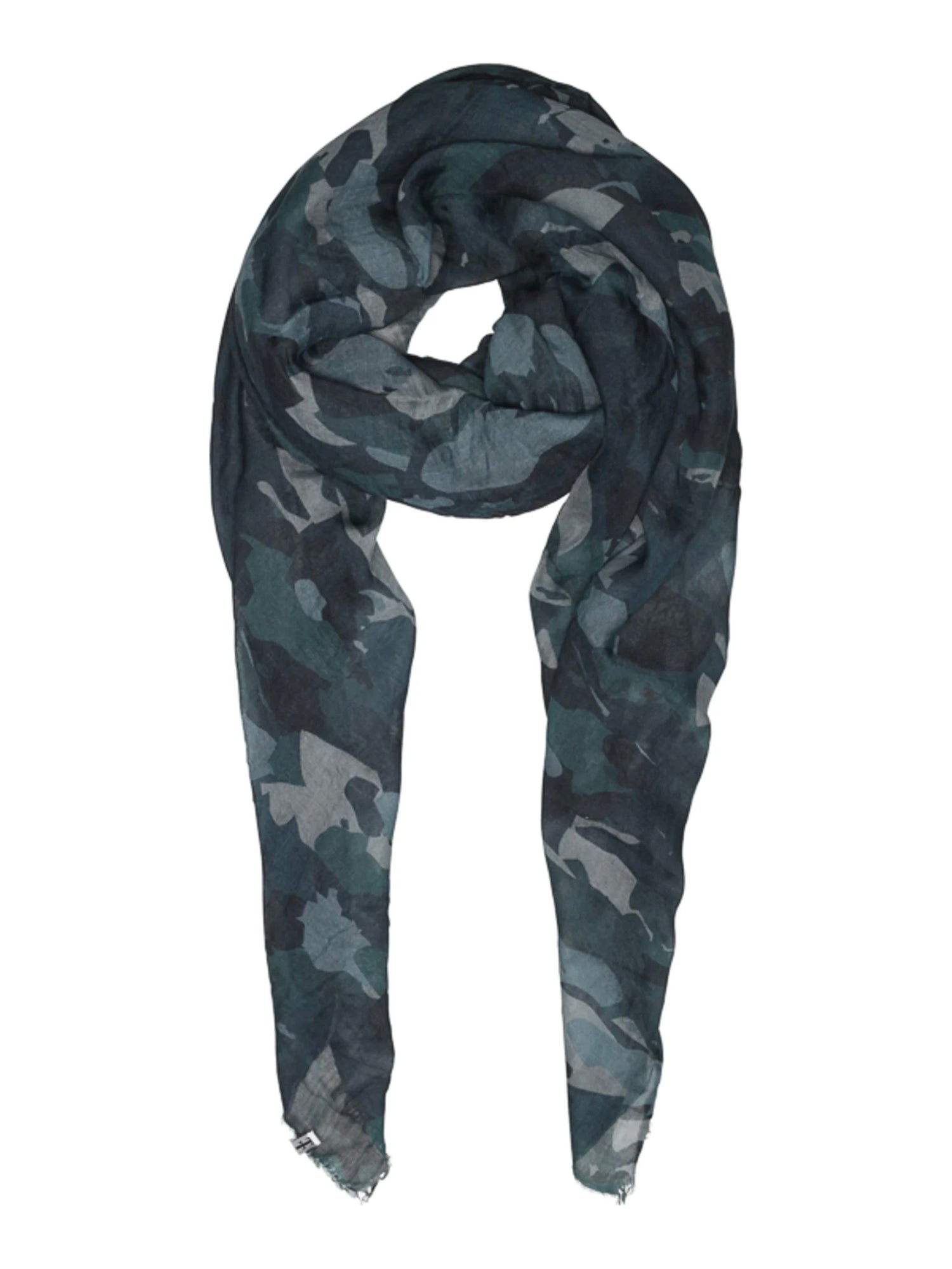 Hochwertiger Modeschal aus einer soften Tencel/Wolle Mischung mit einem farblich abgestimmten Camouflage Druck. Die offenen Kanten sind Teil des Designs. Perfekt zu kombinieren.
