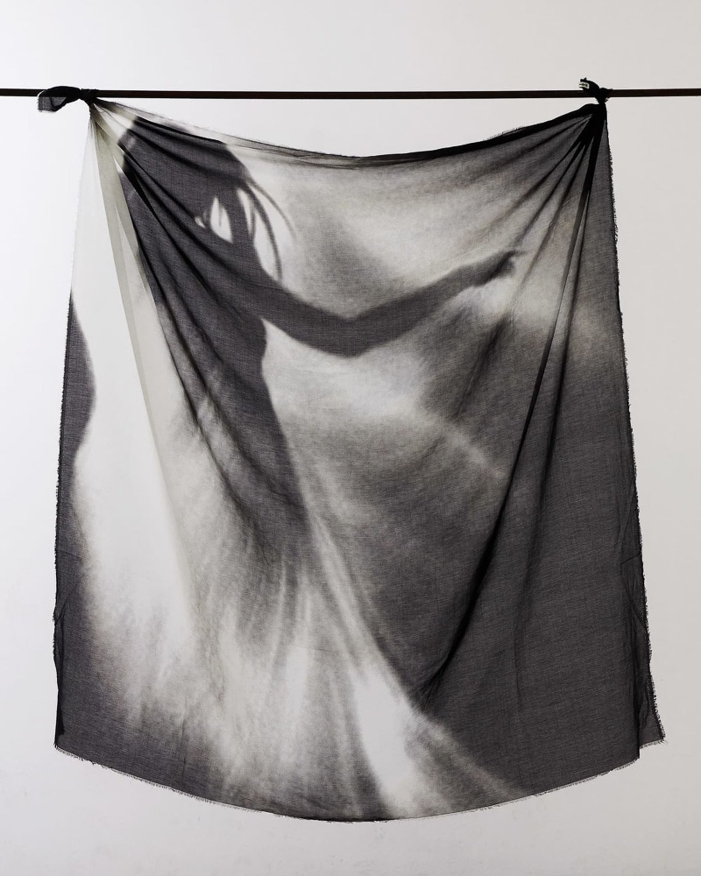 Hochwertiger Modeschal aus einer edlen Baumwolle/Seide Mischung mit einem verlaufenden Motiv einer tanzenden Frau. Die offenen Kanten sind Teil des Designs. Perfekt zu kombinieren.