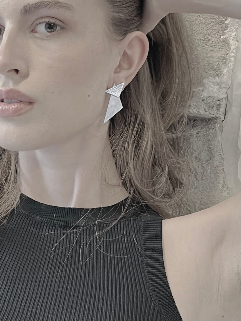 Modische Ohrstecker aus matt versilbertem oder vergoldeten Messing. Sie sind in Form von 2 Dreiecken gearbeitet. Schraffierte Oberfläche.