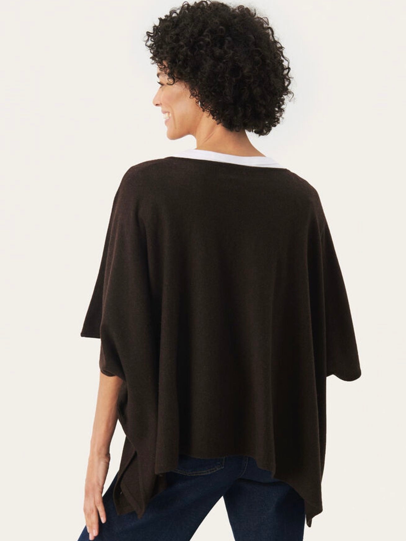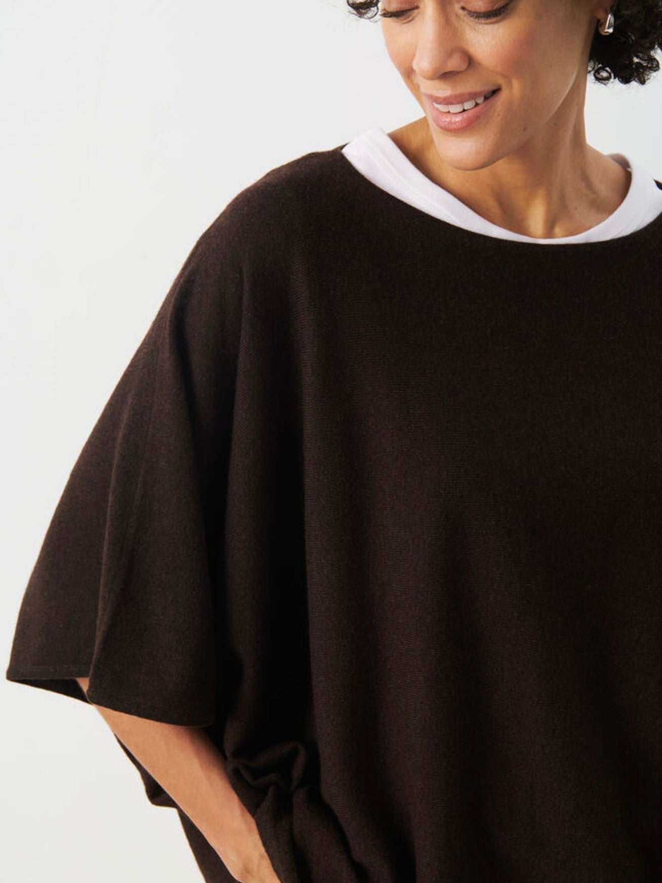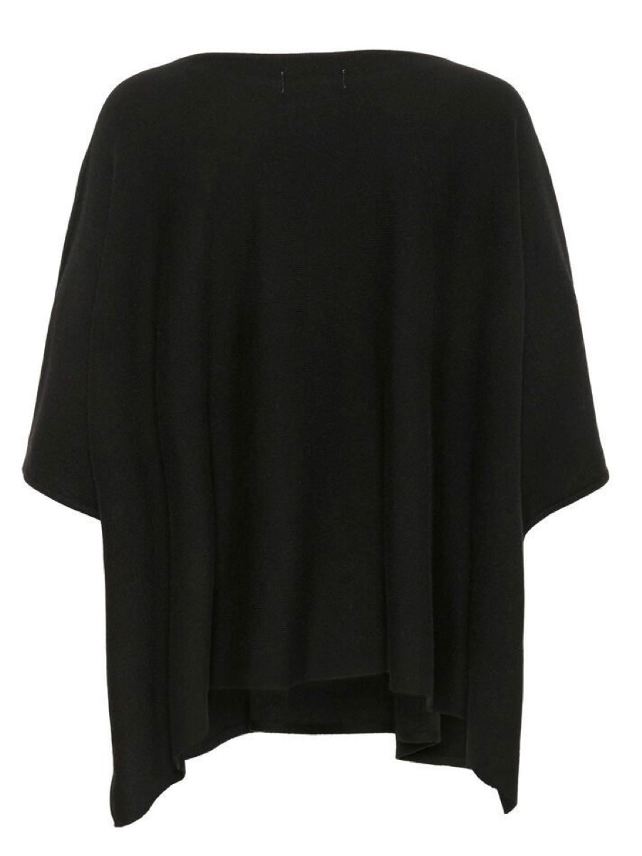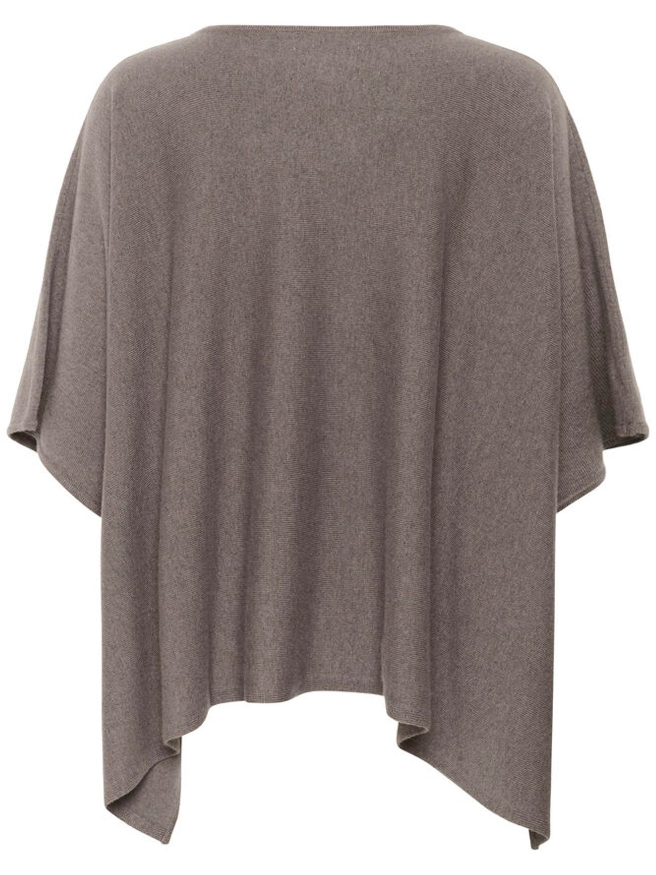 Modisch leger und kastig geschnittener Ponchopullover mit rundem Ausschnitt. Abgerundeter Saum, vorn kürzer gearbeitet. Die Seiten ergeben eine halbe Ärmellänge. Angenehm weiche Qualität für jede Jahreszeit.