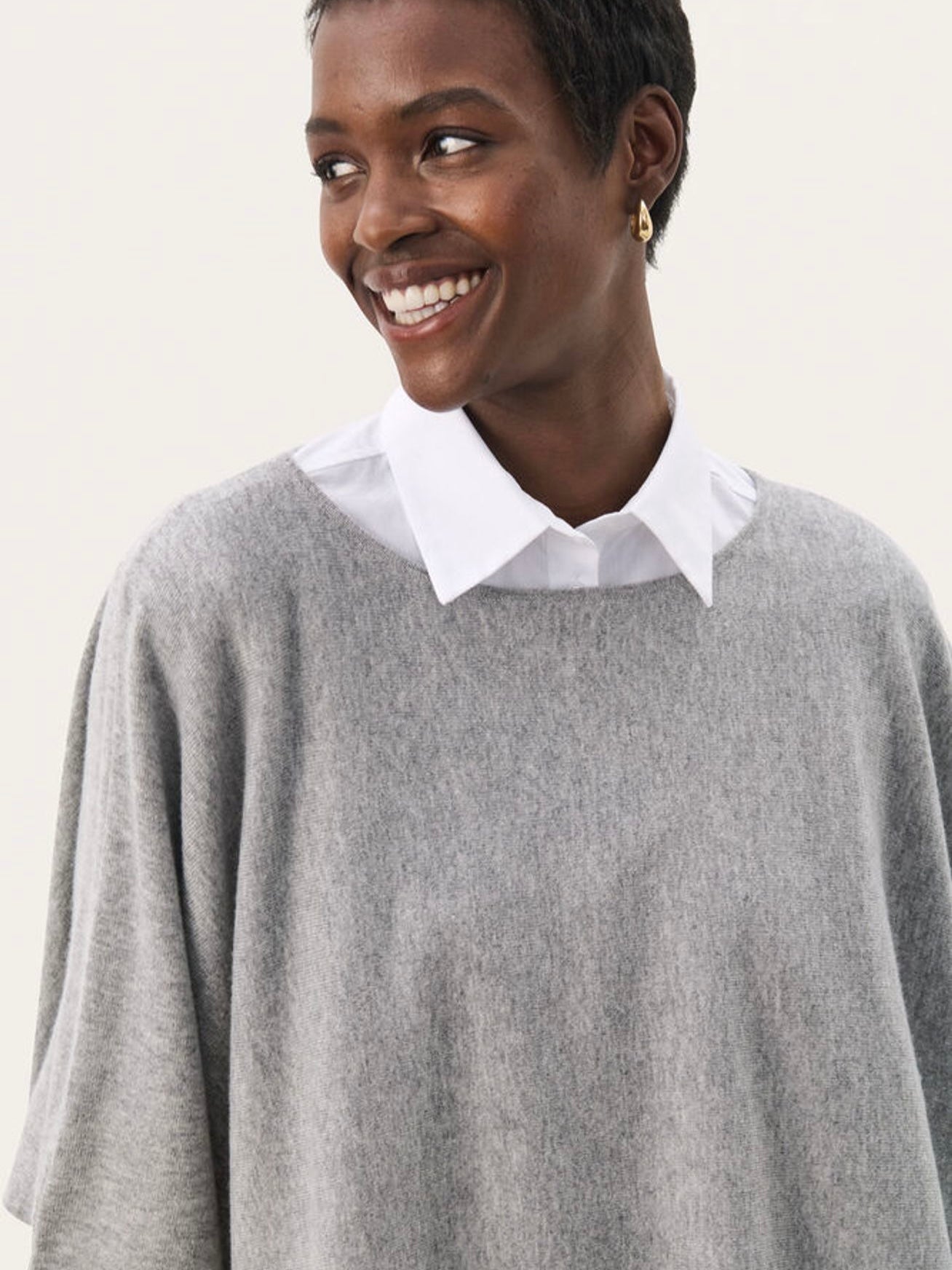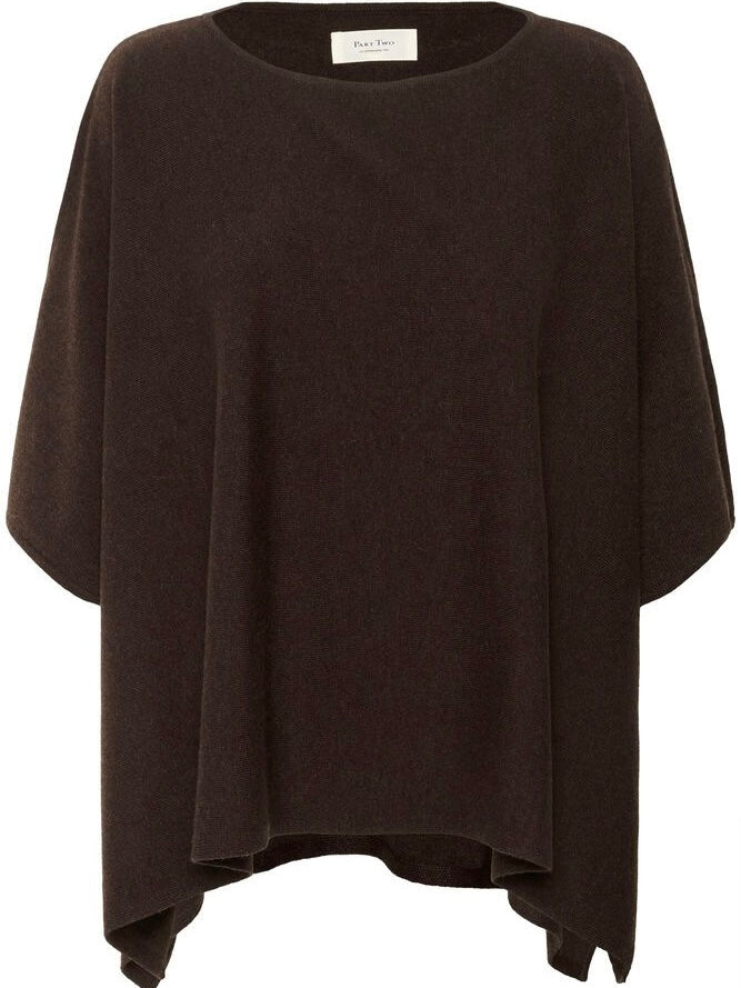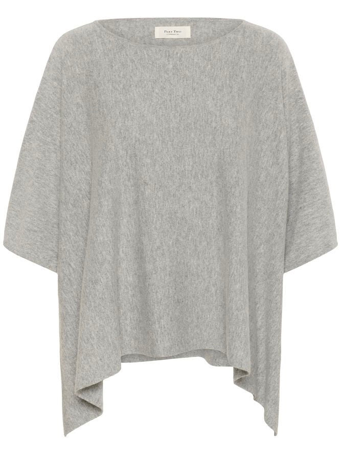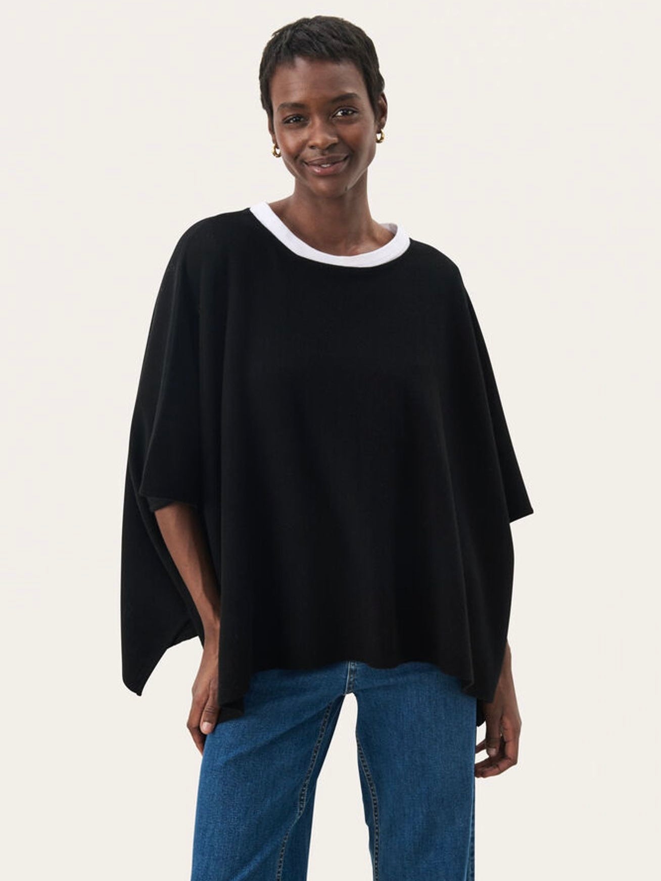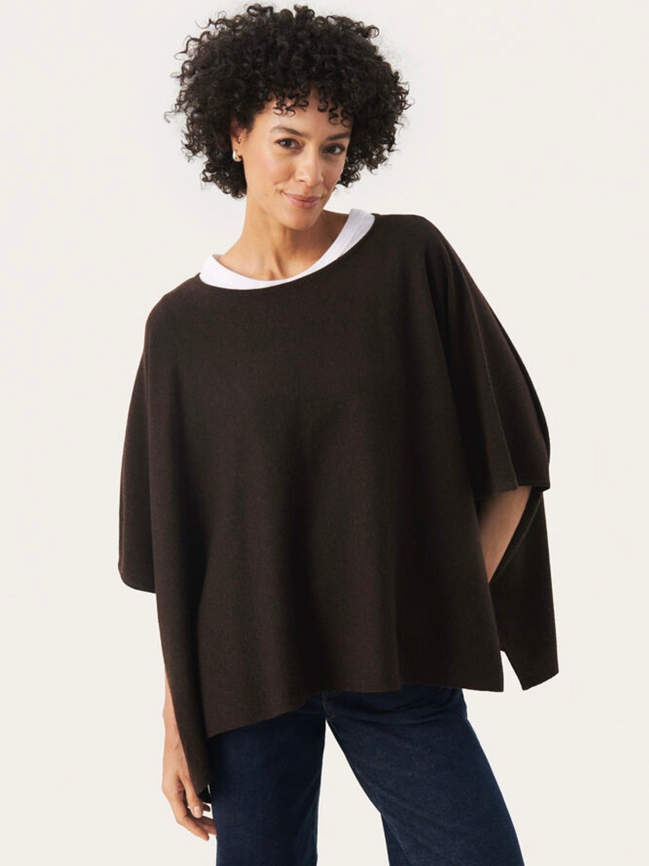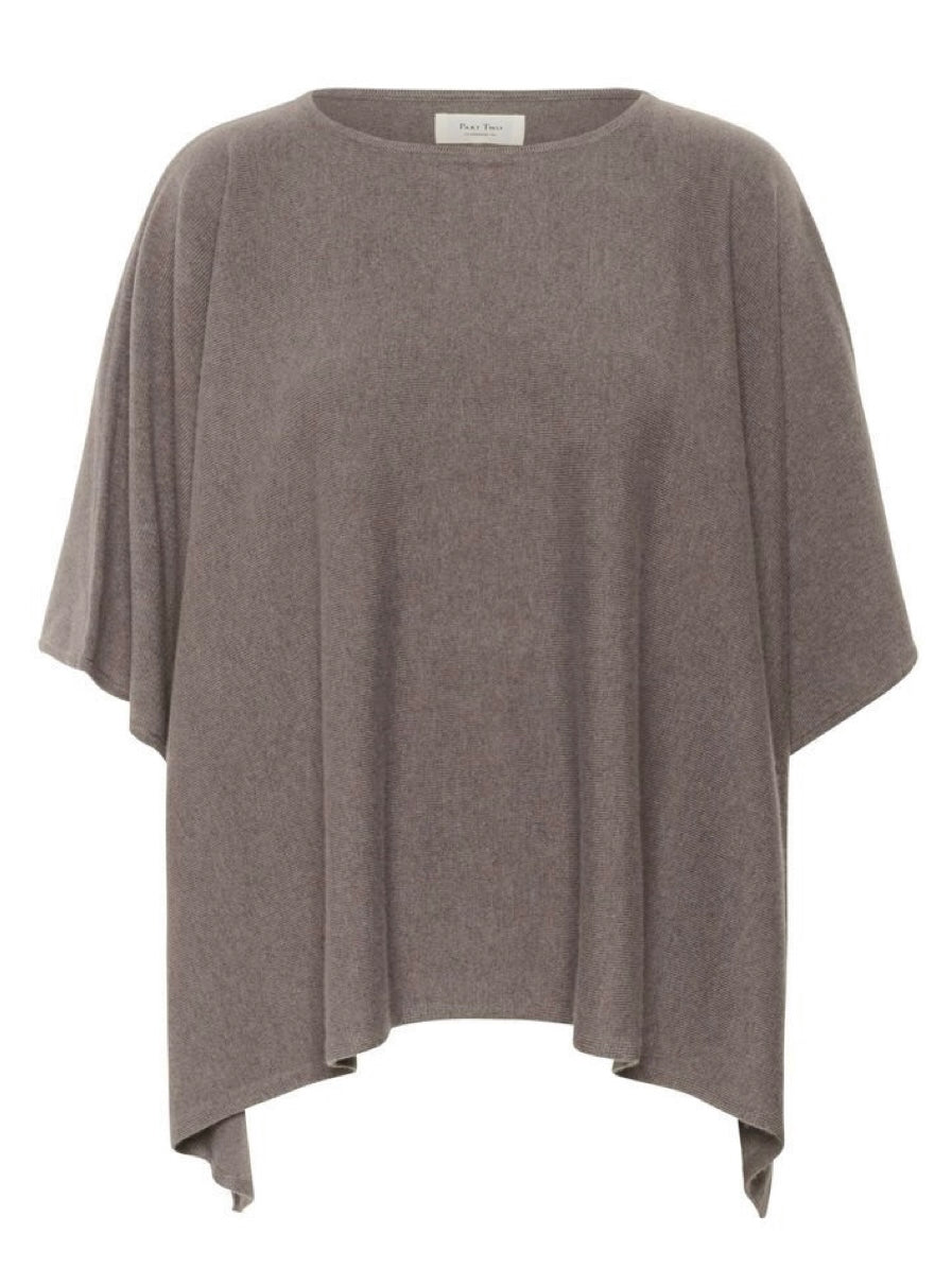 Modisch leger und kastig geschnittener Ponchopullover mit rundem Ausschnitt. Abgerundeter Saum, vorn kürzer gearbeitet. Die Seiten ergeben eine halbe Ärmellänge. Angenehm weiche Qualität für jede Jahreszeit.